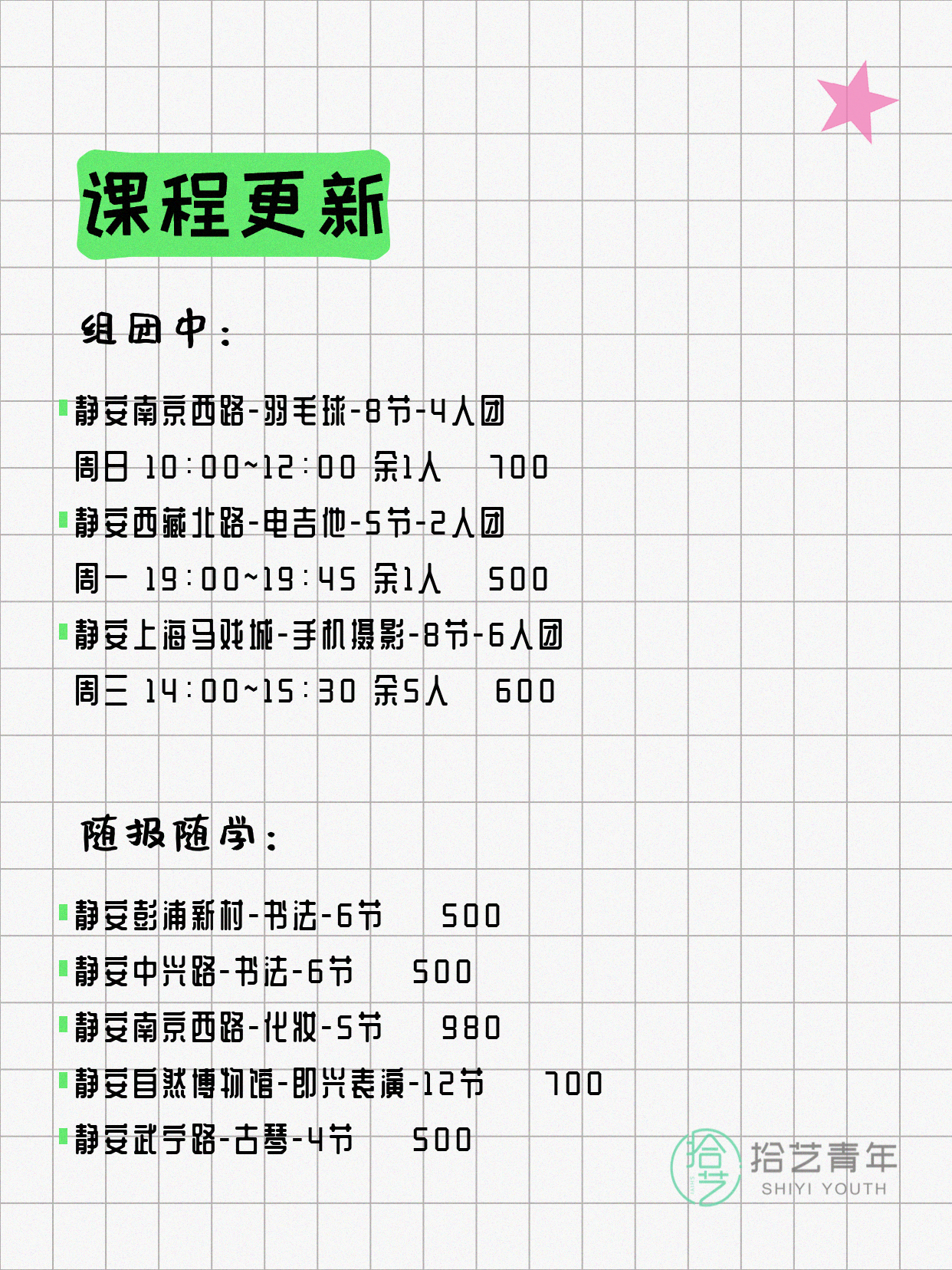 静安夜校新课更新 羽毛球电吉他各余1人即将开课 还有超多好课速冲🏃
