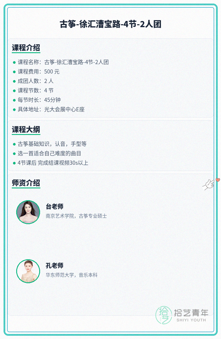 资讯>综合>正文漕宝路古筝课 差1人就开课拾艺青年2026-04-091 / 2漕宝路想学古筝的宝子看这里!就差你就能开课啦🎐🏫 上课地点:光大会展中心E座📅 课程安排:共4节 | 周三 19:00-19:45📖 课程大纲:古筝基础知识,认音,手型等选一首适合自己难度的曲目4节课后 完成结课视频30s以上👥 2人团 | 已报1人 | 还差1人开课#上海夜校 #徐汇夜校 #古筝课程 #夜校拼团 #上海线下课相关标签#上海夜校#徐汇夜校#古筝课程#夜校拼团#上海线下课
