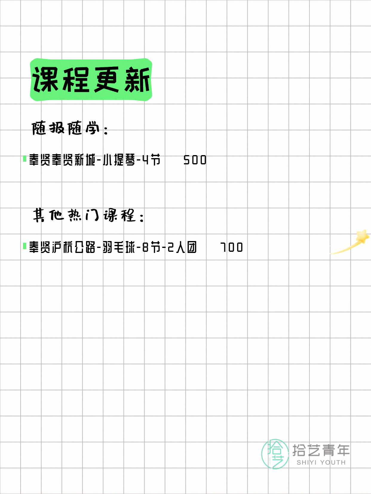资讯>综合>正文4月9日上海奉贤夜校课程合集拾艺青年2026-04-091 / 2【随报随学】📌 小提琴-奉贤奉贤新城-4节-一人即可 💰500【热门课程推荐】⭐ 羽毛球-奉贤沪杭公路-8节-2人团 💰700详见小程序了解详细信息,欢迎报名咨询。💡 提示:以上课程信息来自拾艺青年小程序,课程可能随报名动态变化,具体以小程序实时信息为准。👉 微信小程序链接:#小程序://拾艺青年/WmfwH22mnQUxZwb
