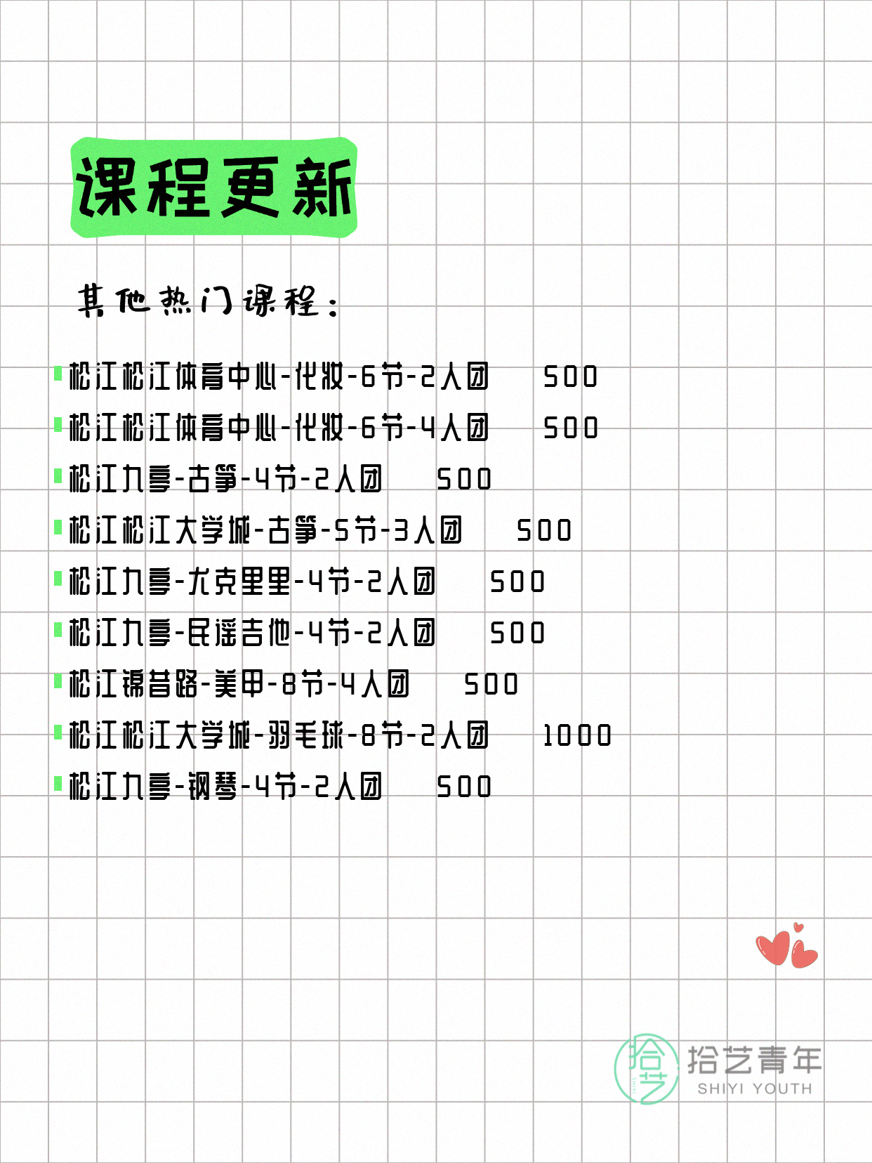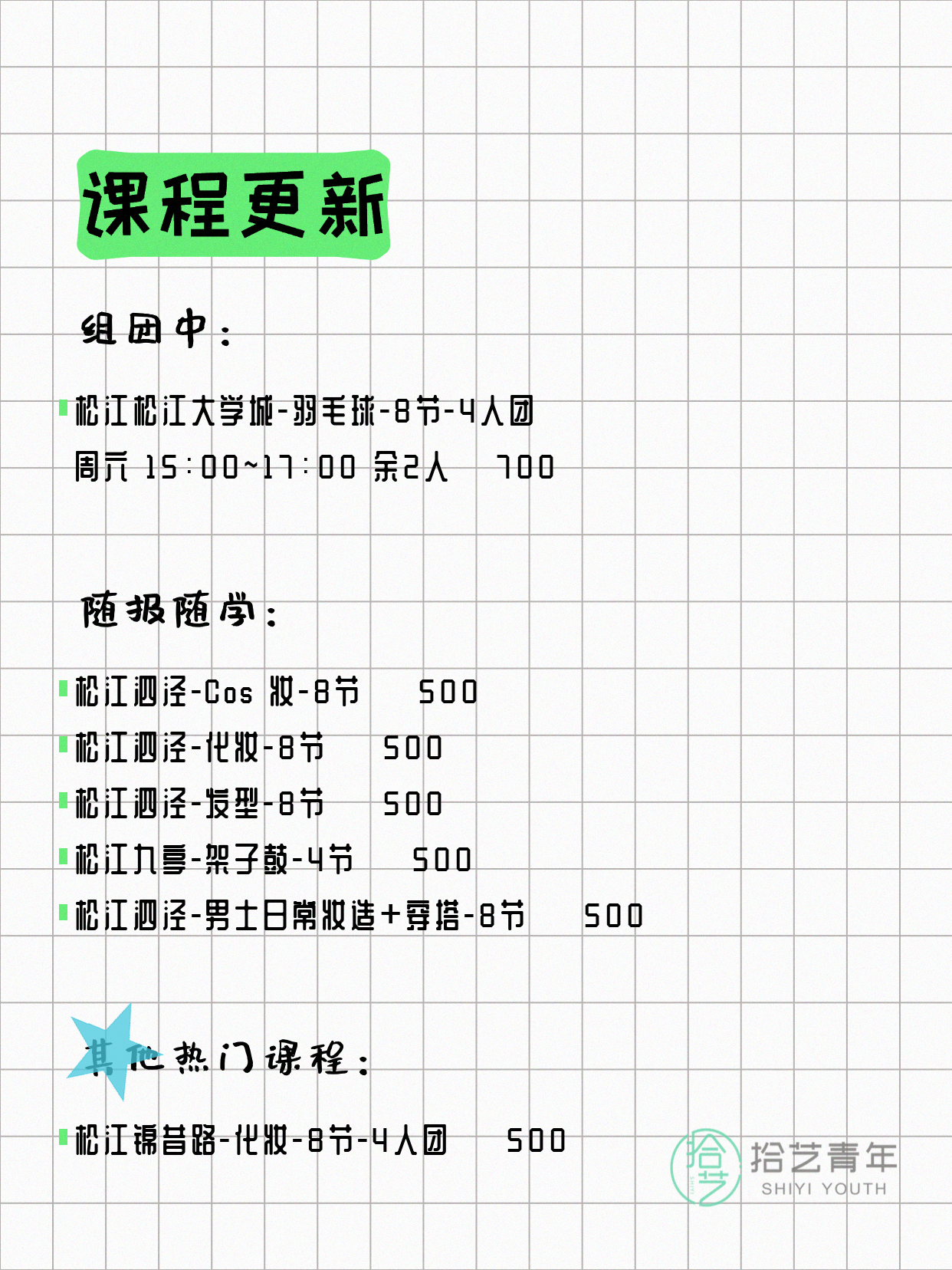 💡 提示:以上课程信息来自拾艺青年小程序,课程可能随报名动态变化,具体以小程序实时信息为准。