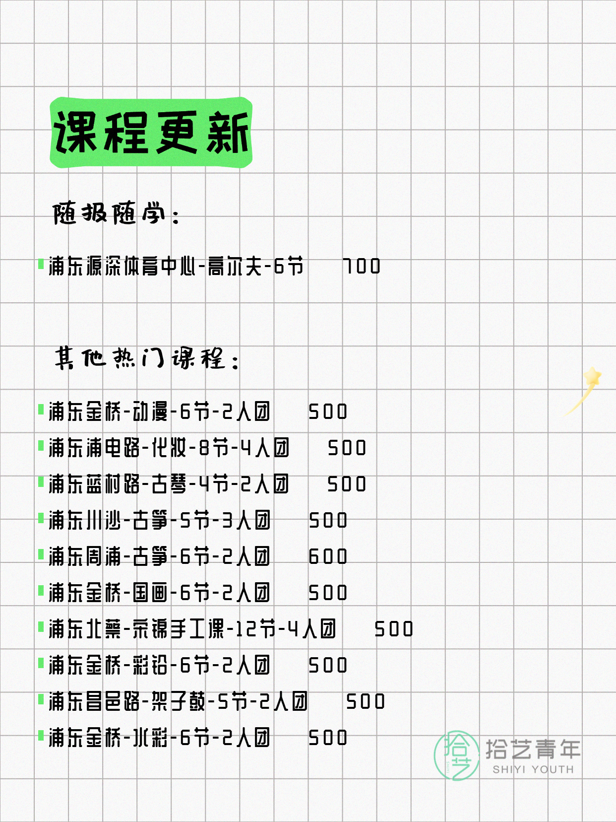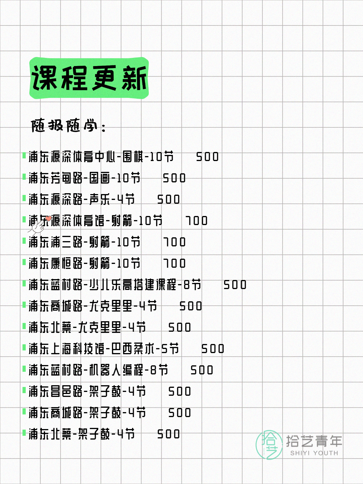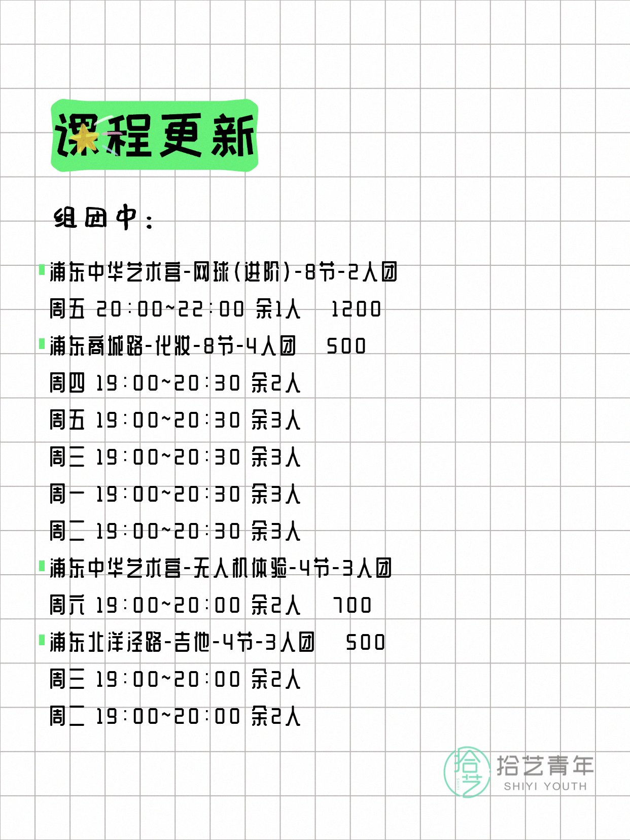 💡 提示:以上课程信息来自拾艺青年小程序,课程可能随报名动态变化,具体以小程序实时信息为准。