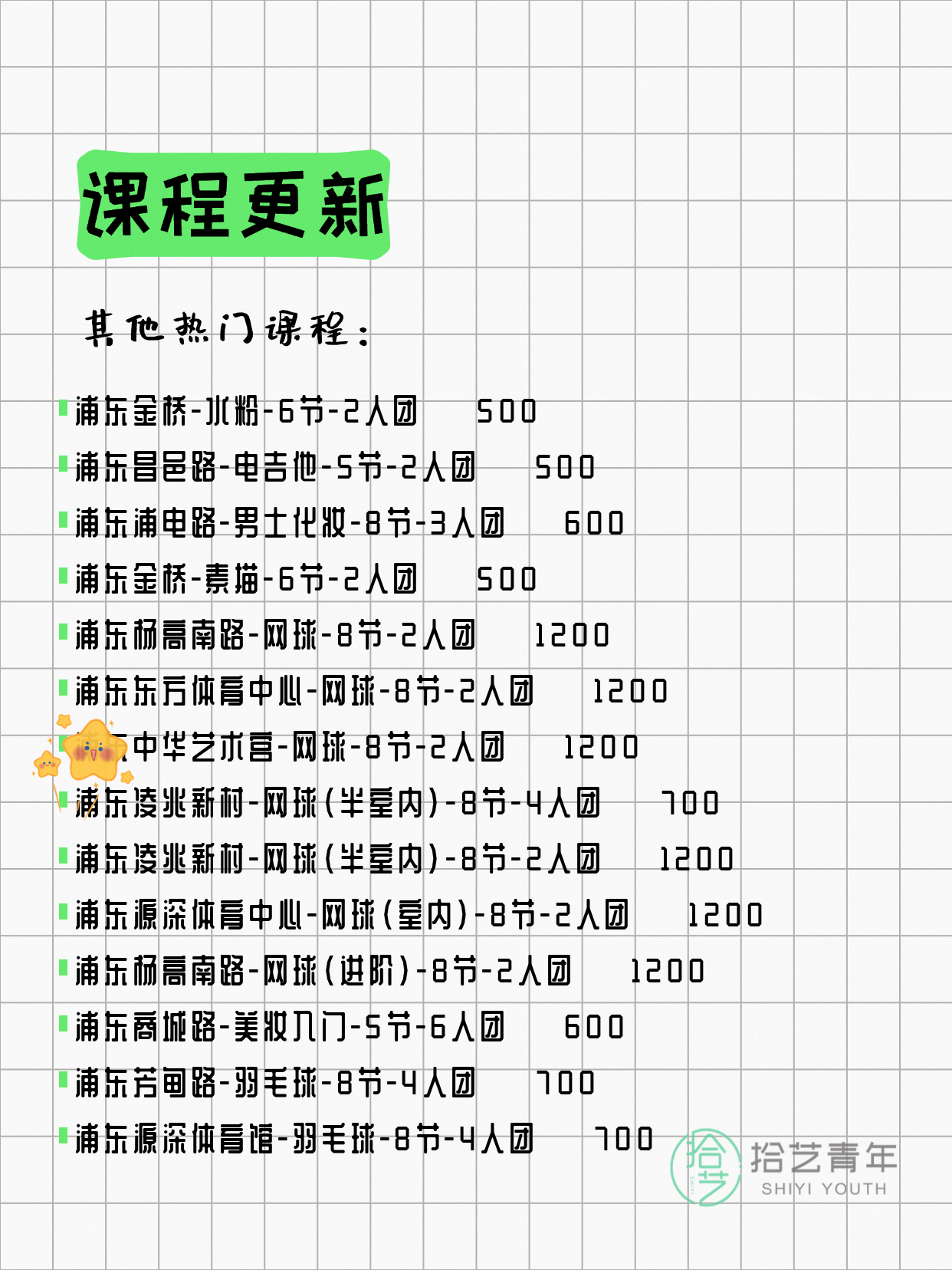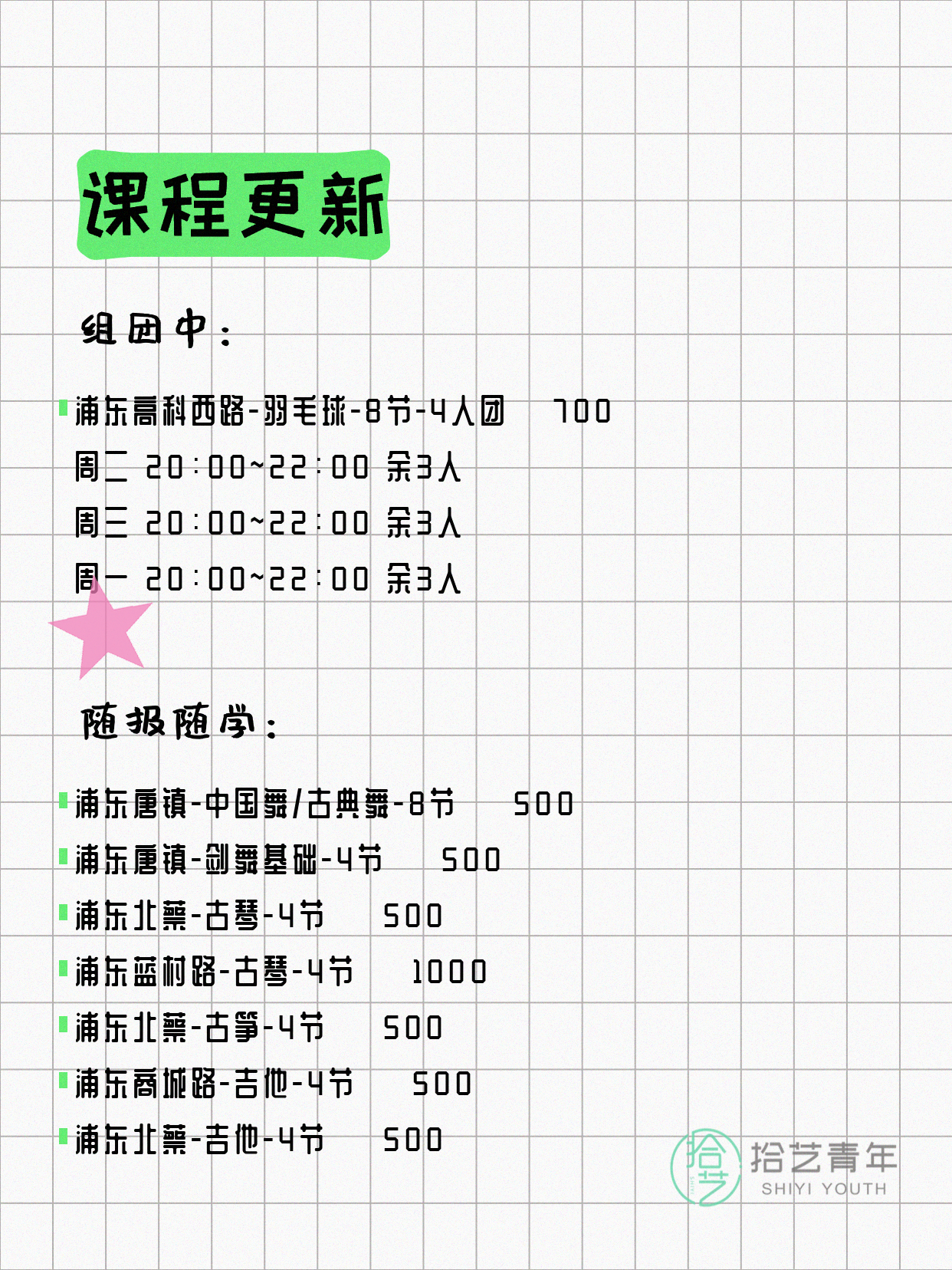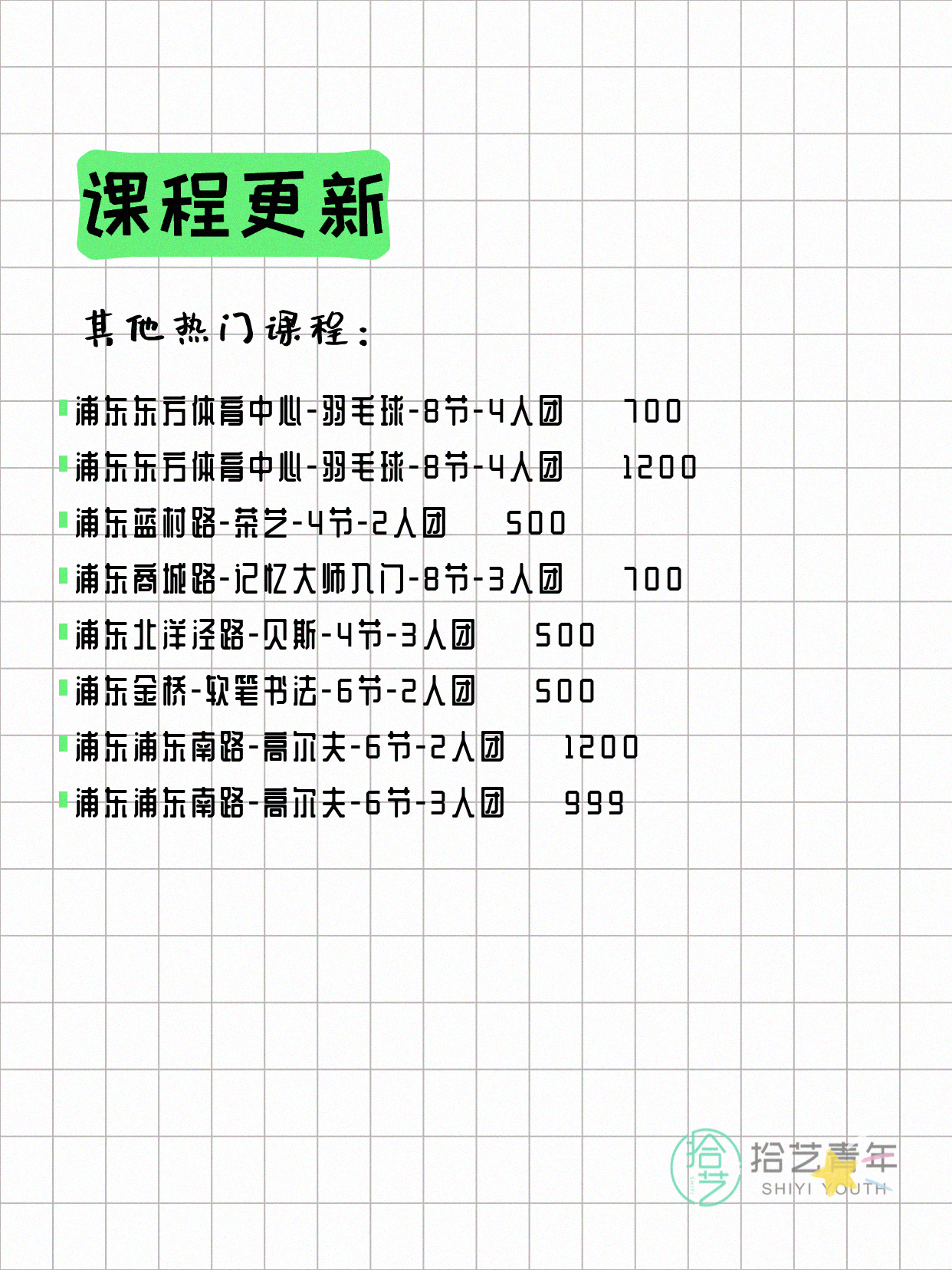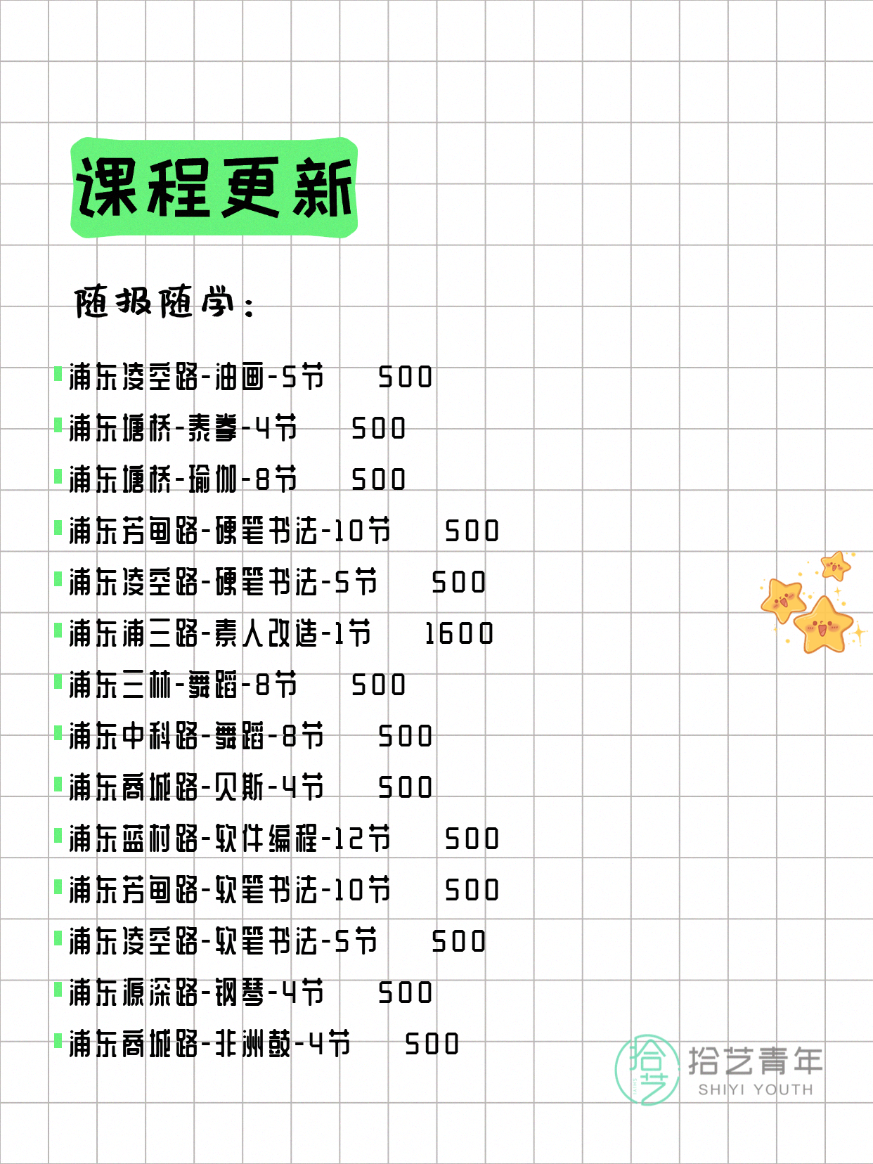 💡 提示:以上课程信息来自拾艺青年小程序,课程可能随报名动态变化,具体以小程序实时信息为准。