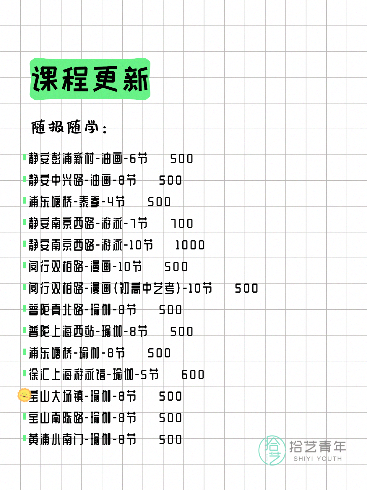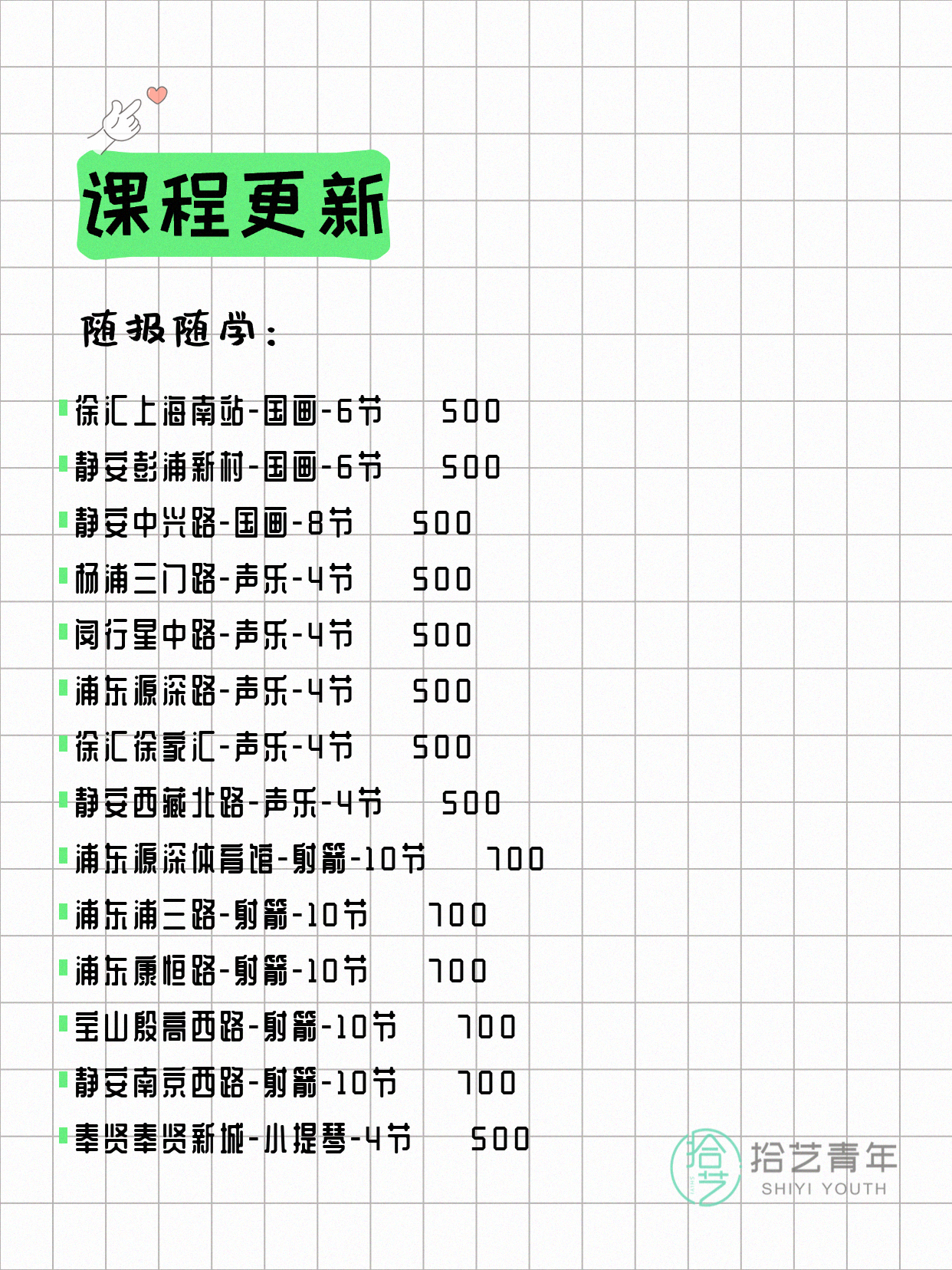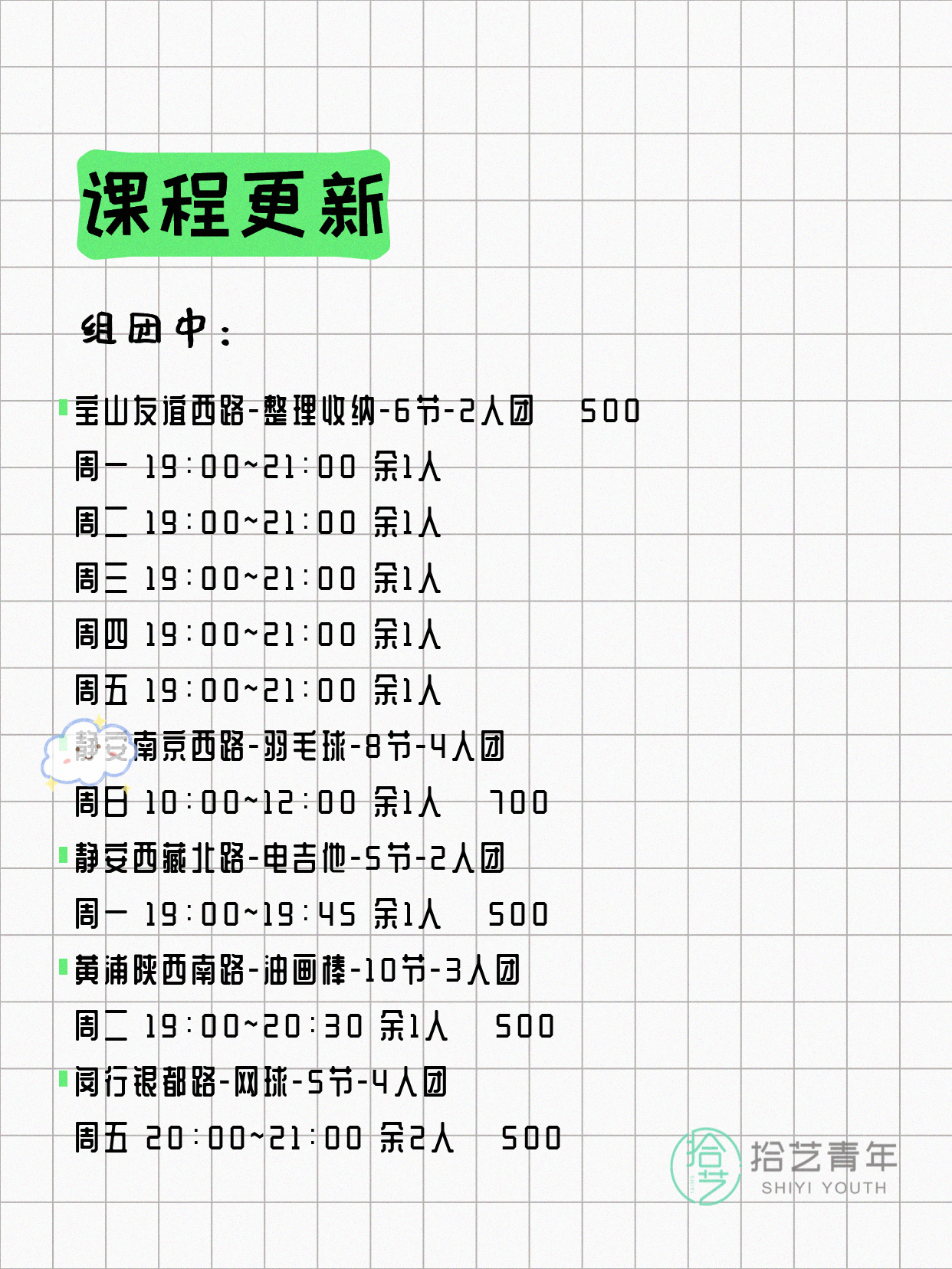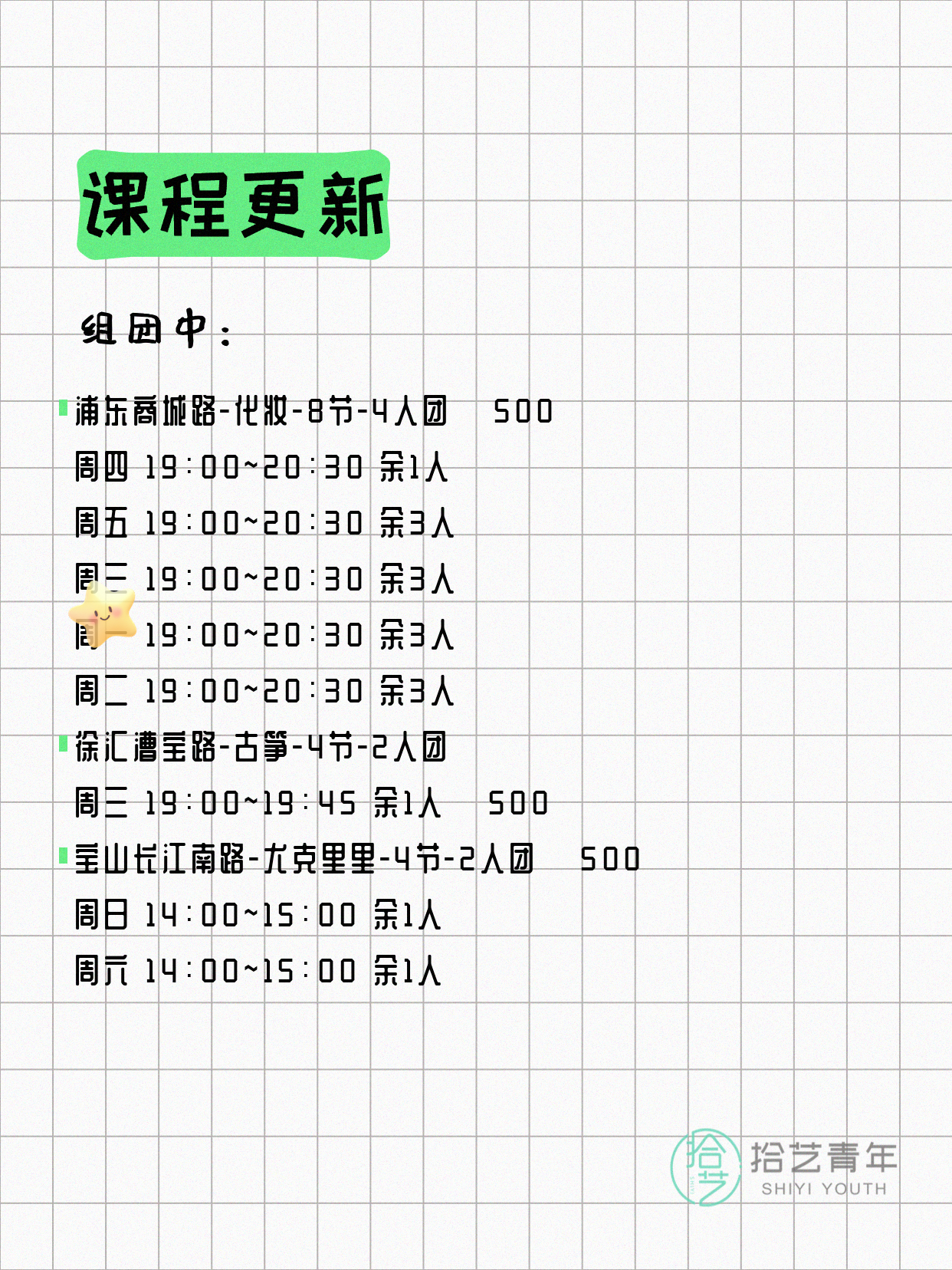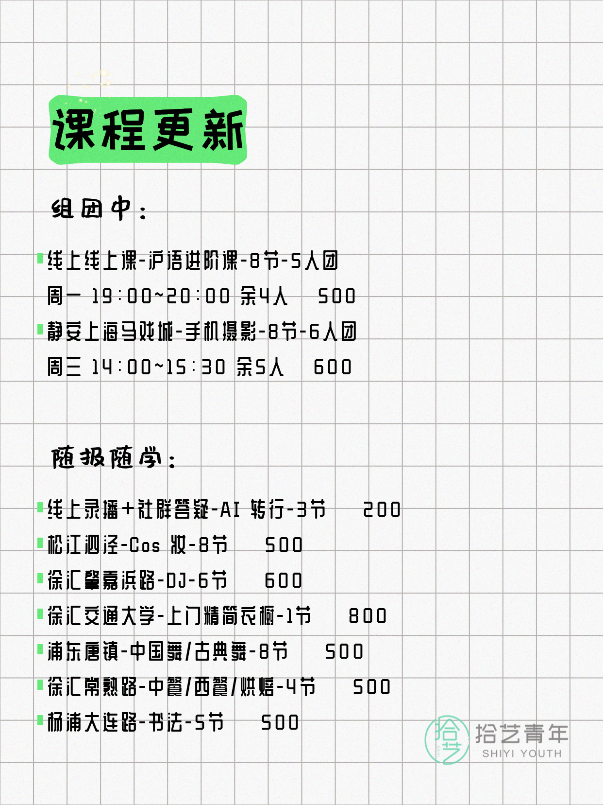 资讯>综合>正文4月9日上海夜校课程合集拾艺青年2026-04-091 / 17📊 本期课程概况• 总课程数:377门• 组团中课程:73门• 覆盖区域:15个区详见图片,欢迎报名咨询。💡 提示:以上课程信息来自拾艺青年小程序,课程可能随报名动态变化,具体以小程序实时信息为准。👉 微信小程序链接:#小程序://拾艺青年/WmfwH22mnQUxZwb