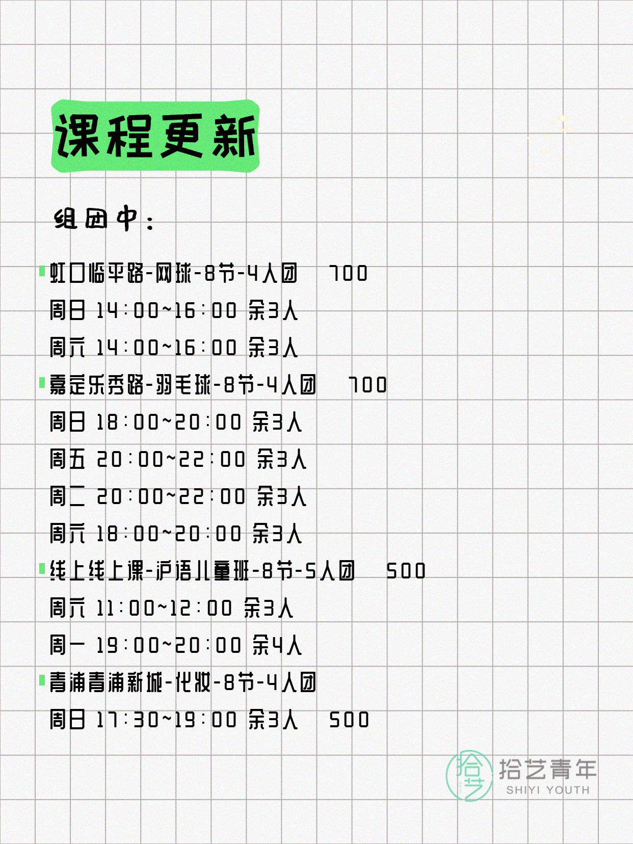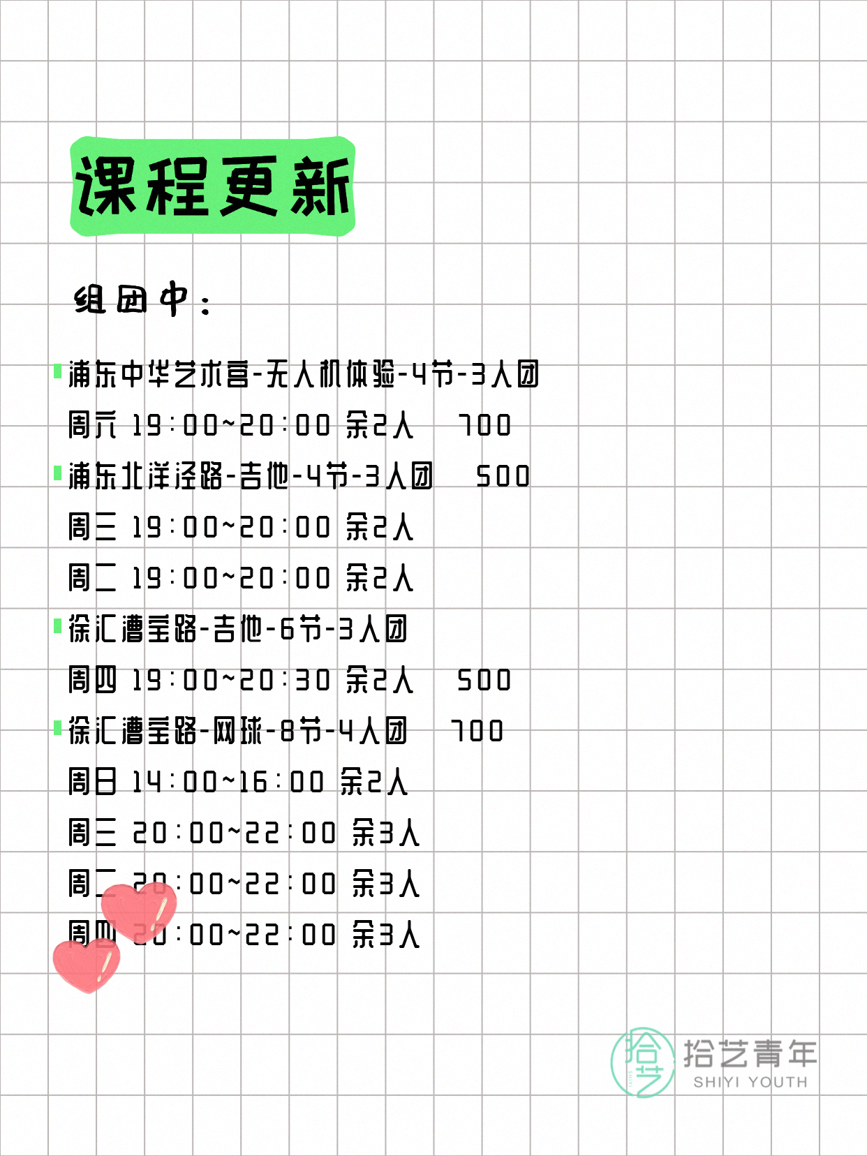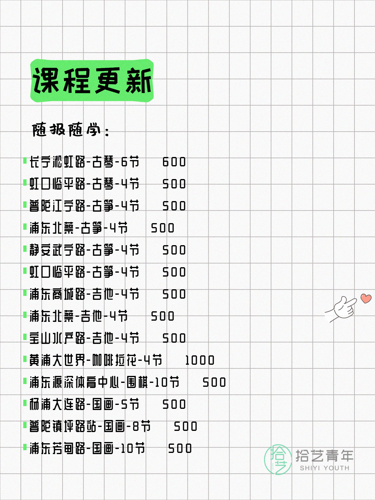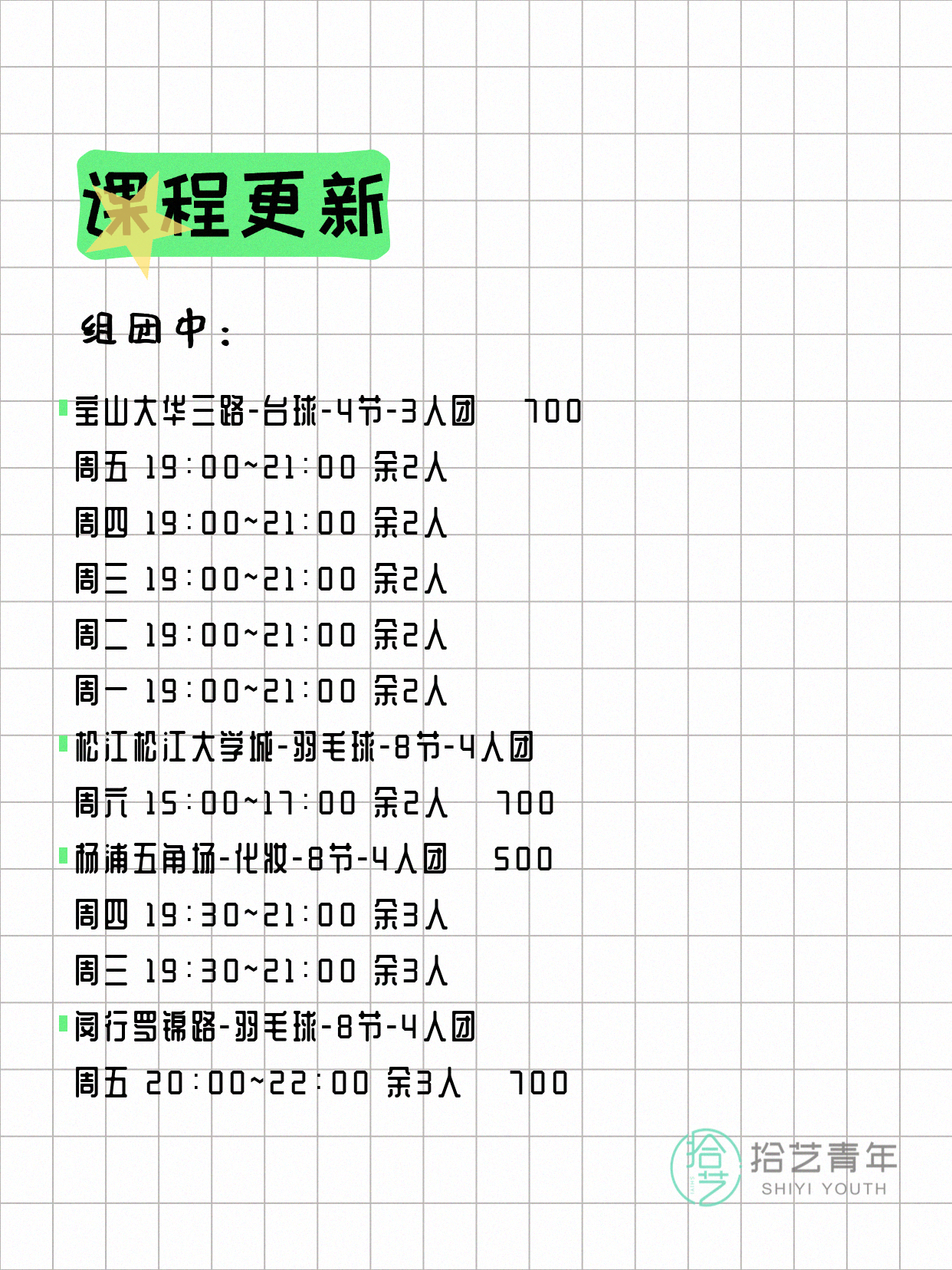 资讯>综合>正文4月9日上海夜校课程合集拾艺青年2026-04-091 / 17📊 本期课程概况• 总课程数:377门• 组团中课程:73门• 覆盖区域:15个区详见图片,欢迎报名咨询。💡 提示:以上课程信息来自拾艺青年小程序,课程可能随报名动态变化,具体以小程序实时信息为准。👉 微信小程序链接:#小程序://拾艺青年/WmfwH22mnQUxZwb