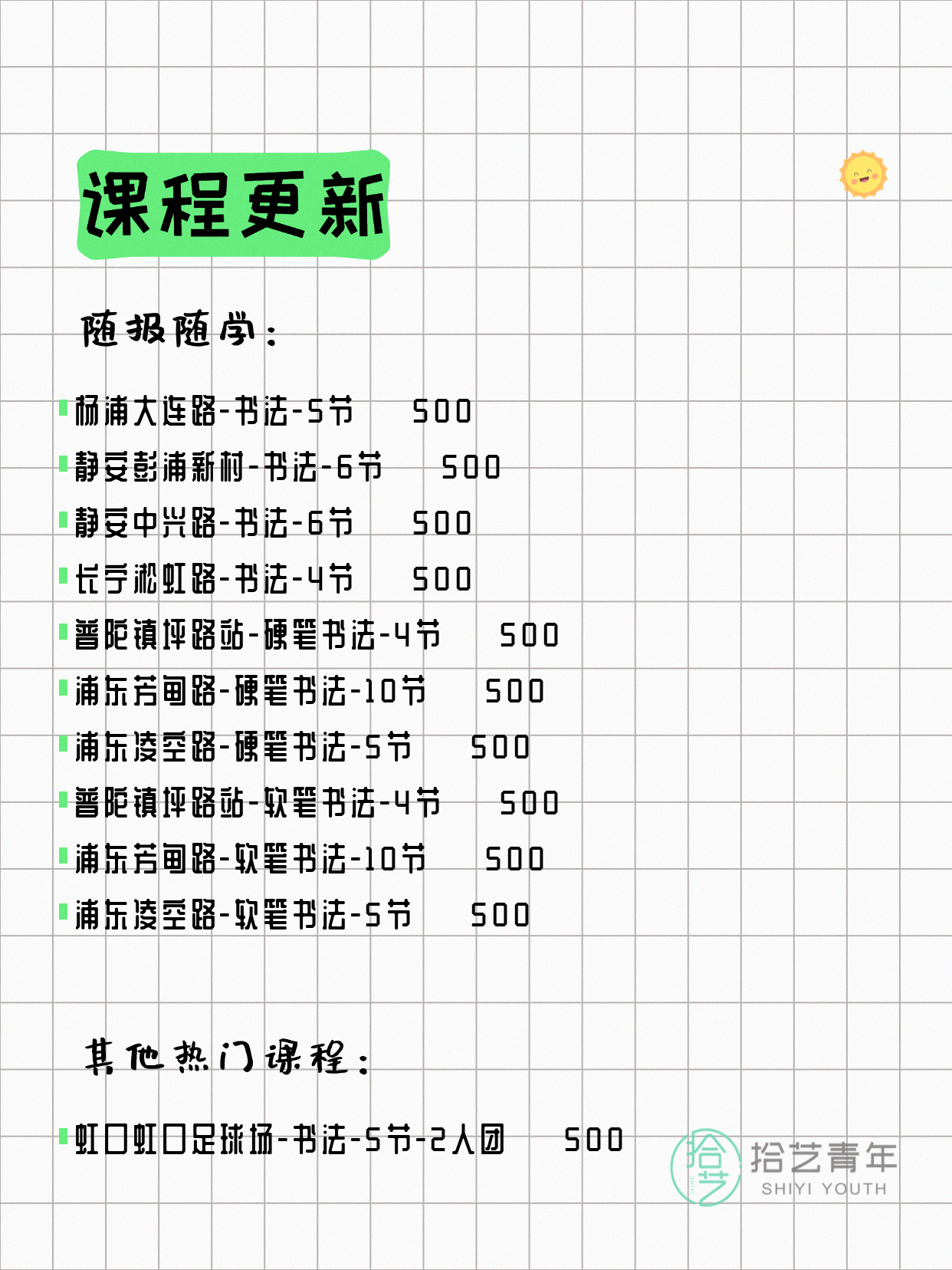 💡 提示:以上课程信息来自拾艺青年小程序,课程可能随报名动态变化,具体以小程序实时信息为准。