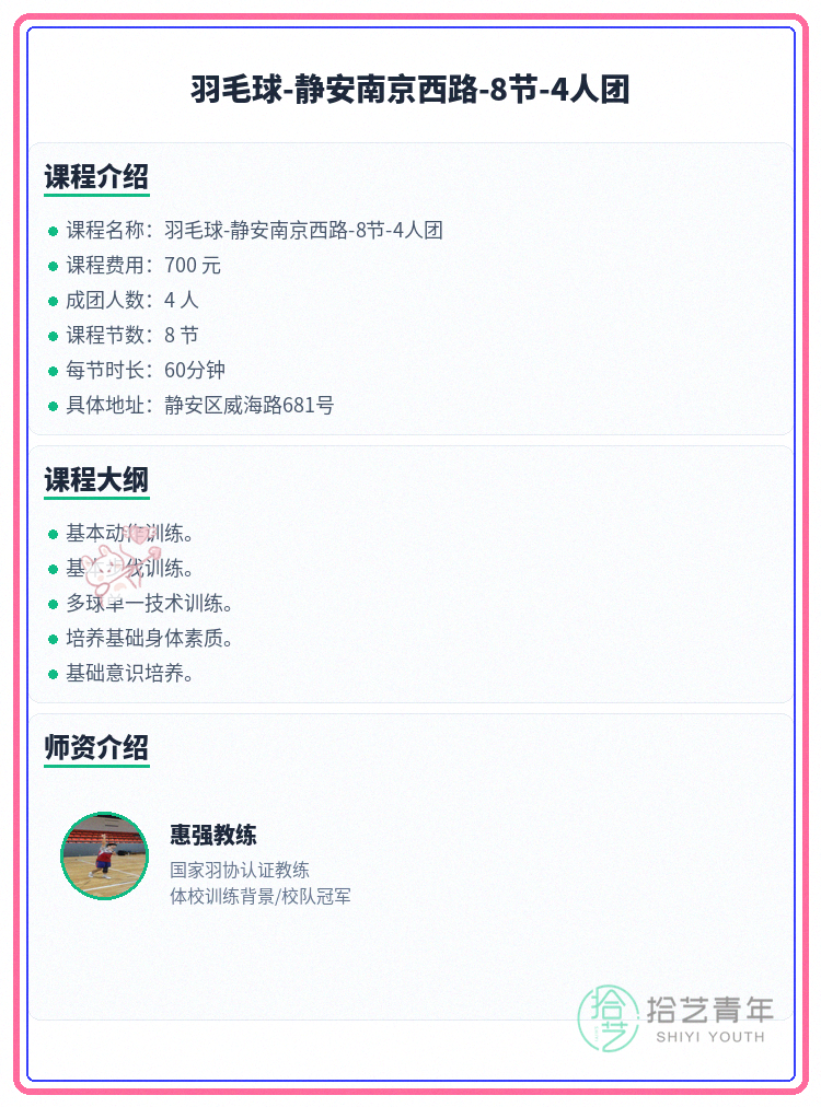 资讯>综合>正文南京西路羽毛球差1人就开课拾艺青年2026-04-091 / 2蹲南京西路球友!差你1个咱们就能开课啦🏸🏫 上课地点:静安区威海路681号📅 课程安排:共8节 | 周日 10:00-12:00📖 课程大纲:基本动作训练。基本步伐训练。多球单一技术训练。培养基础身体素质。基础意识培养。👥 4人团 | 已报3人 | 还差1人开课#上海夜校 #静安夜校 #羽毛球课程 #夜校拼团 #上海线下课相关标签#上海夜校#静安夜校#羽毛球课程#夜校拼团#上海线下课