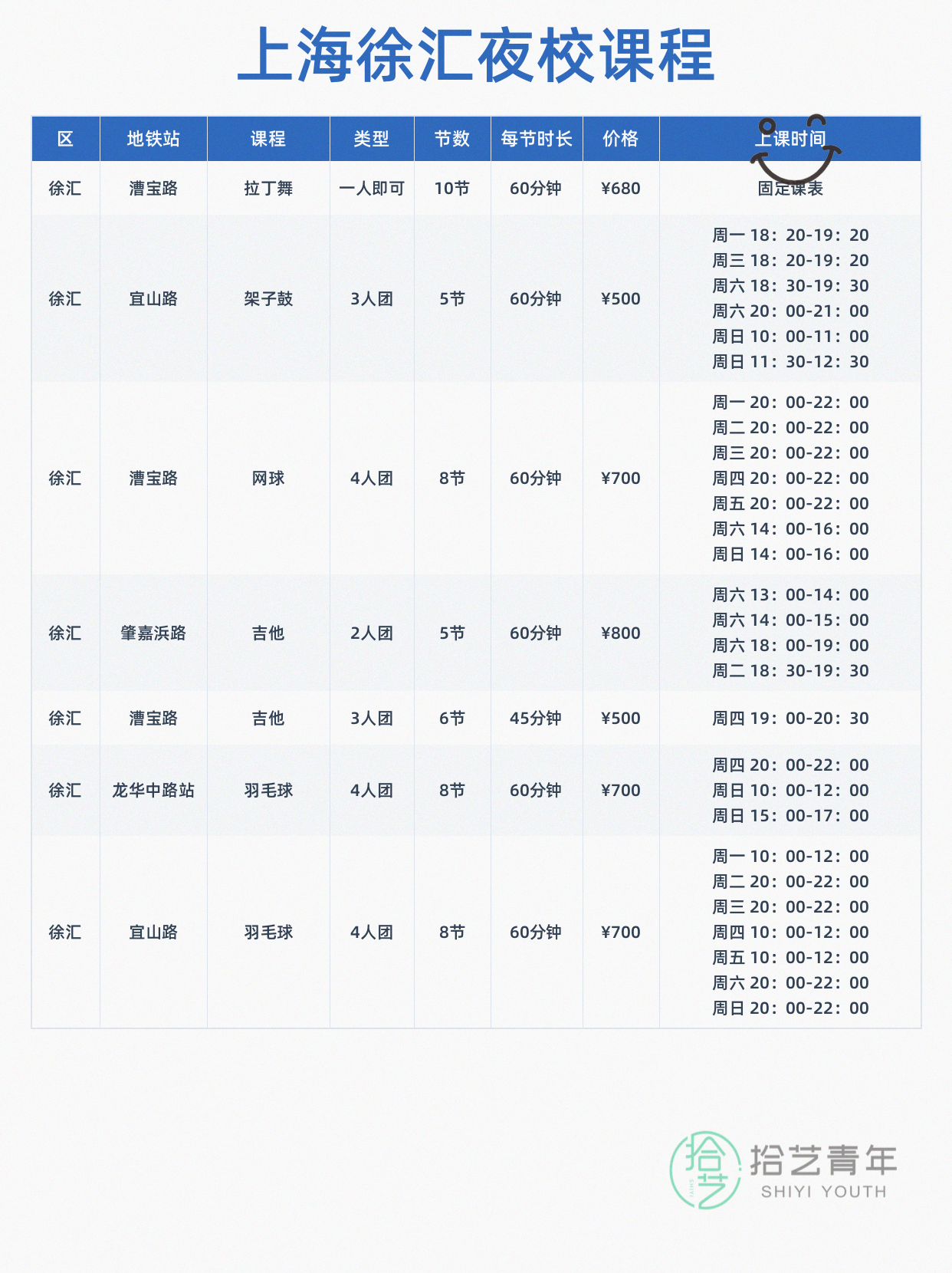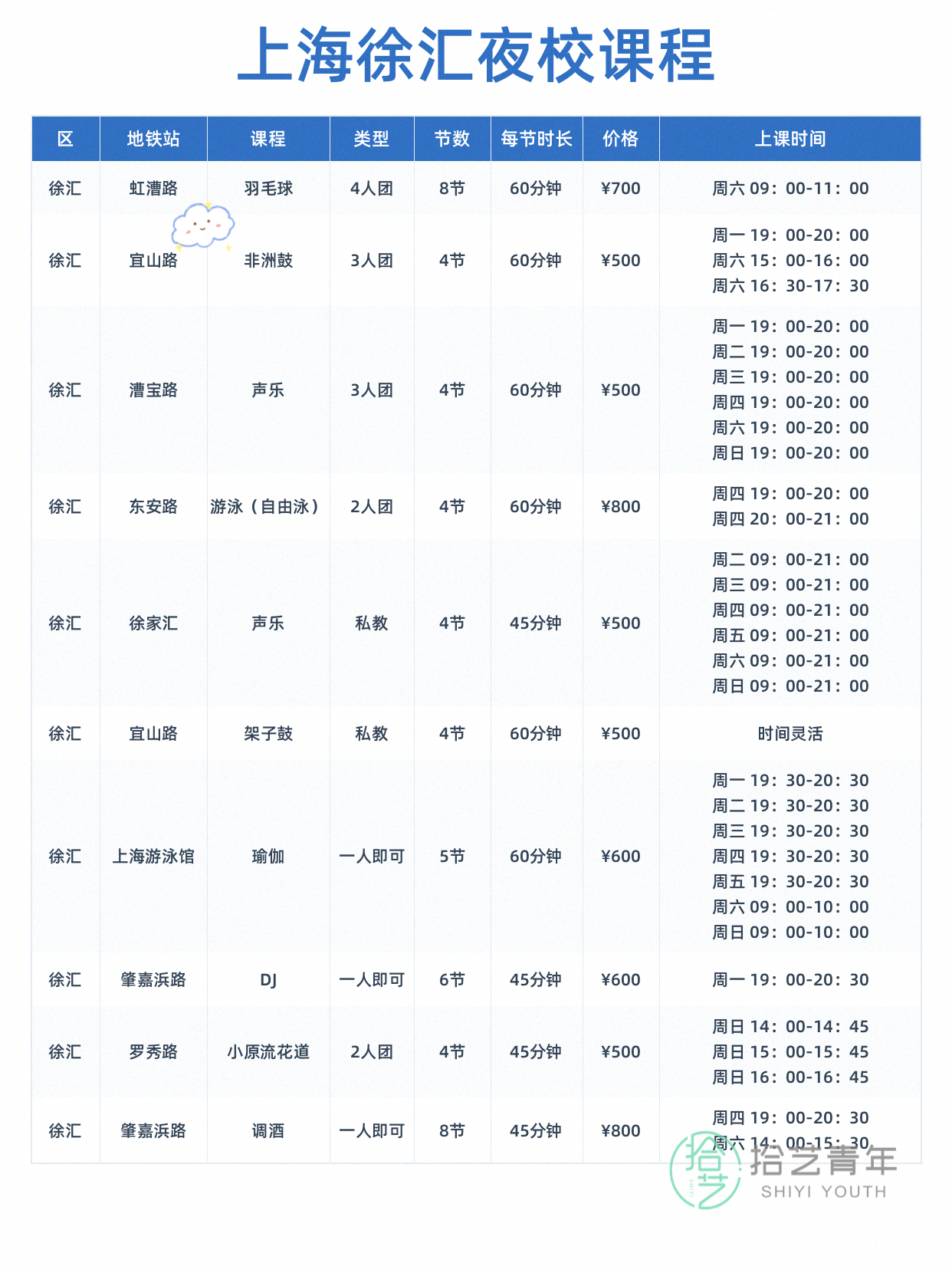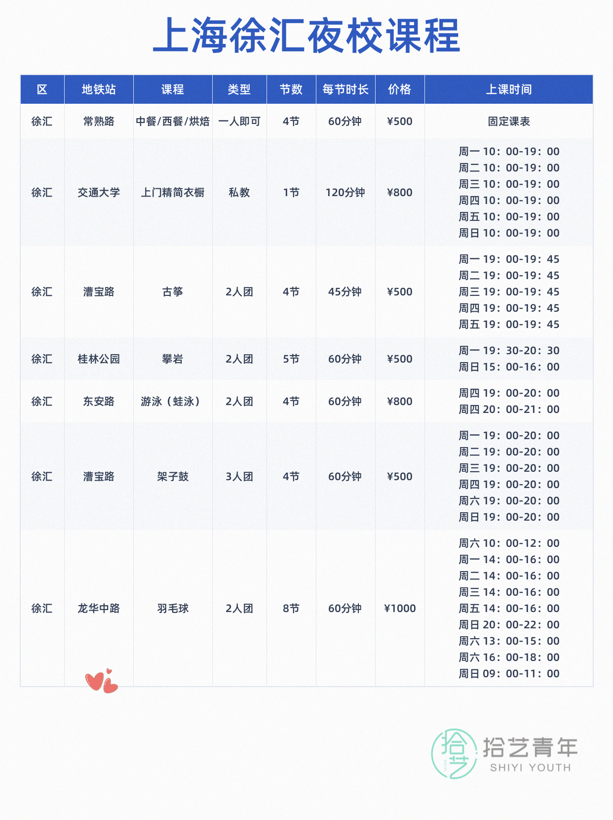 资讯>综合>正文徐汇课程竟这么多?拾艺青年2026-04-101 / 4刚同事发的徐汇夜校课表📌游泳(自由泳) 🎤声乐 🎾网球地铁直达超方便,先存图啦相关标签##上海夜校##徐汇##打工人日常##下班后的生活##兴趣培养