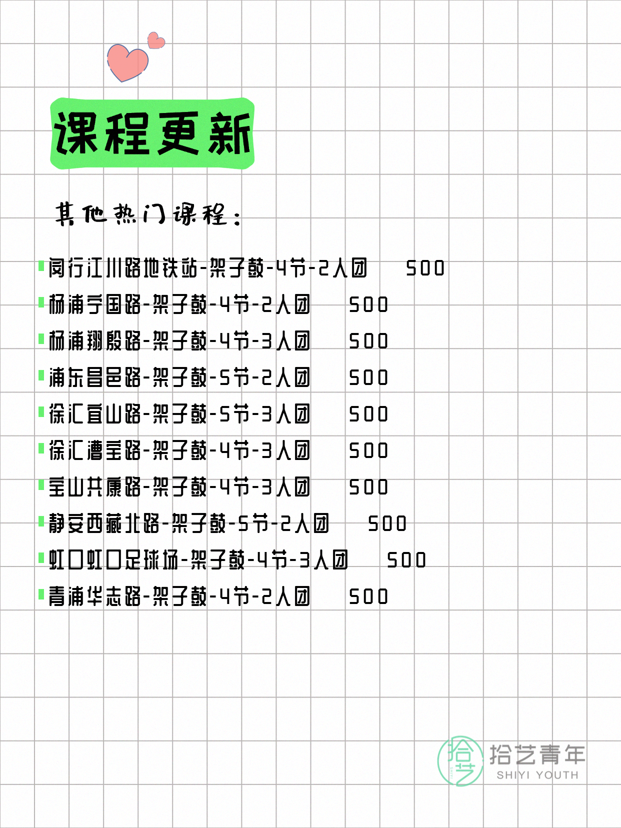 💡 提示:以上课程信息来自拾艺青年小程序,课程可能随报名动态变化,具体以小程序实时信息为准。