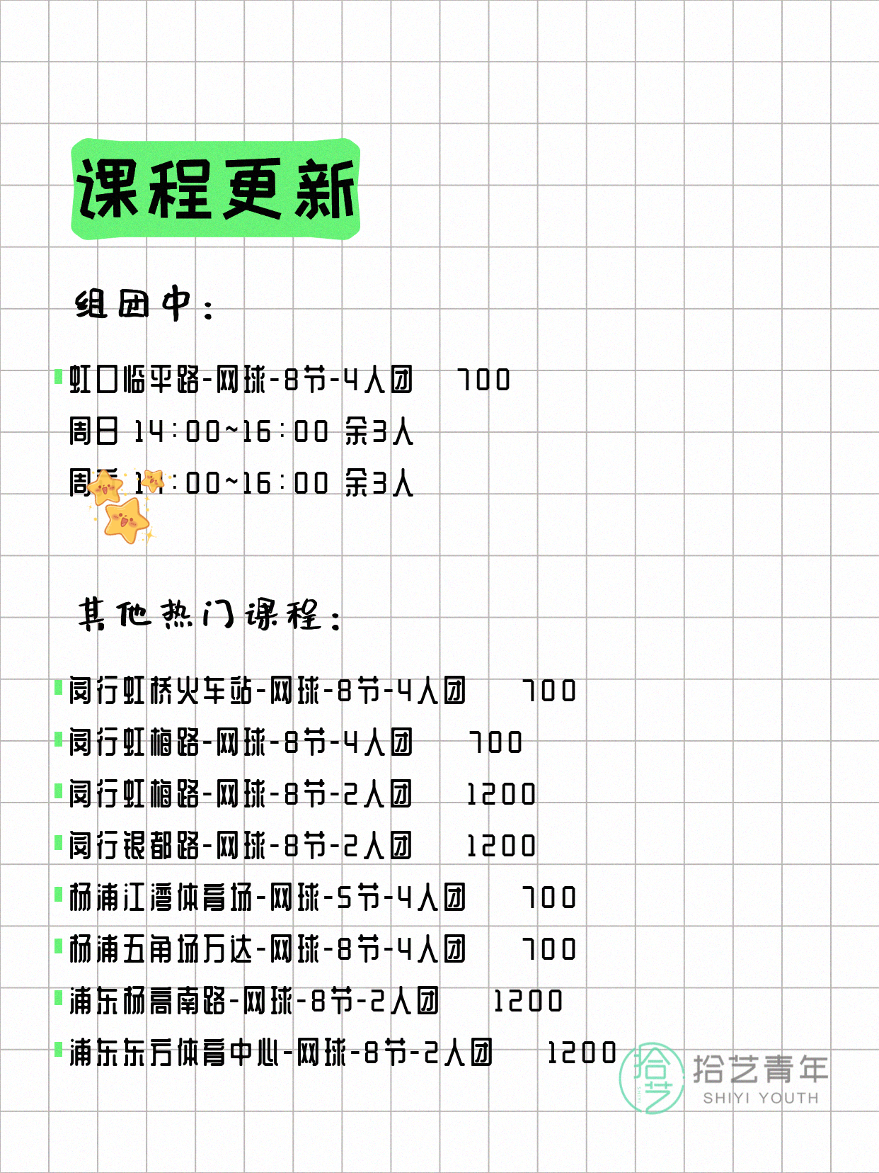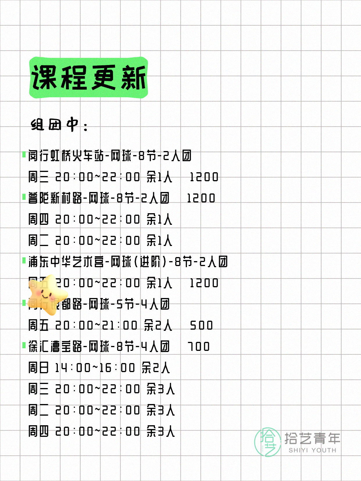 💡 提示:以上课程信息来自拾艺青年小程序,课程可能随报名动态变化,具体以小程序实时信息为准。