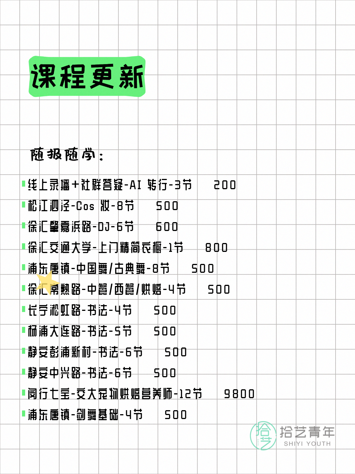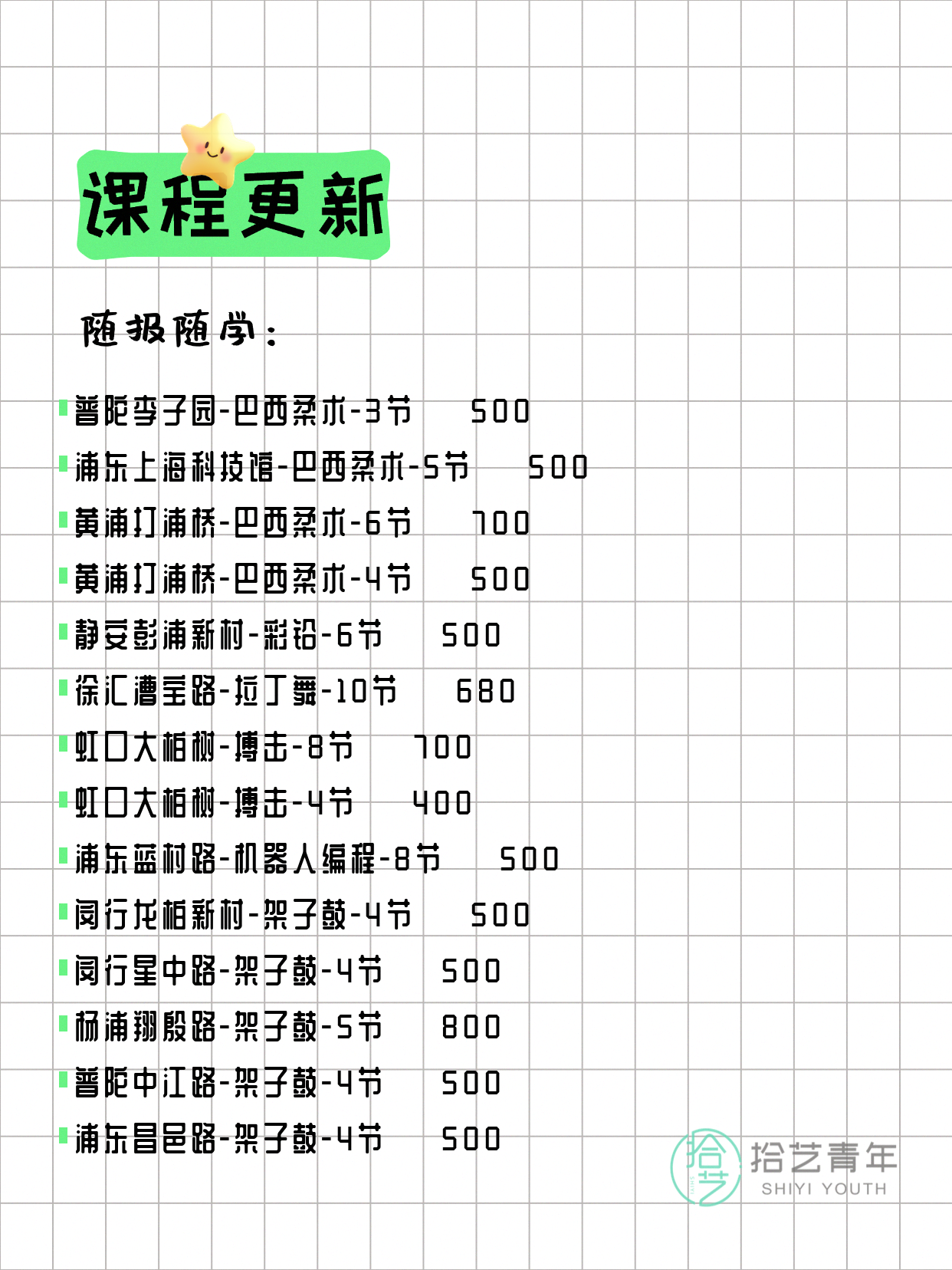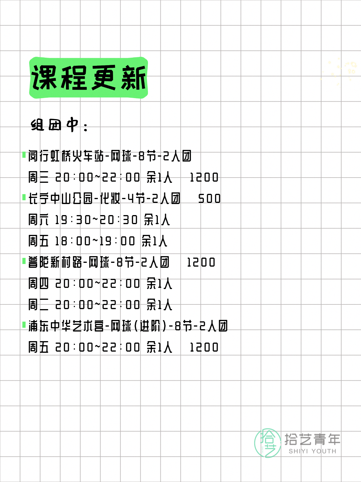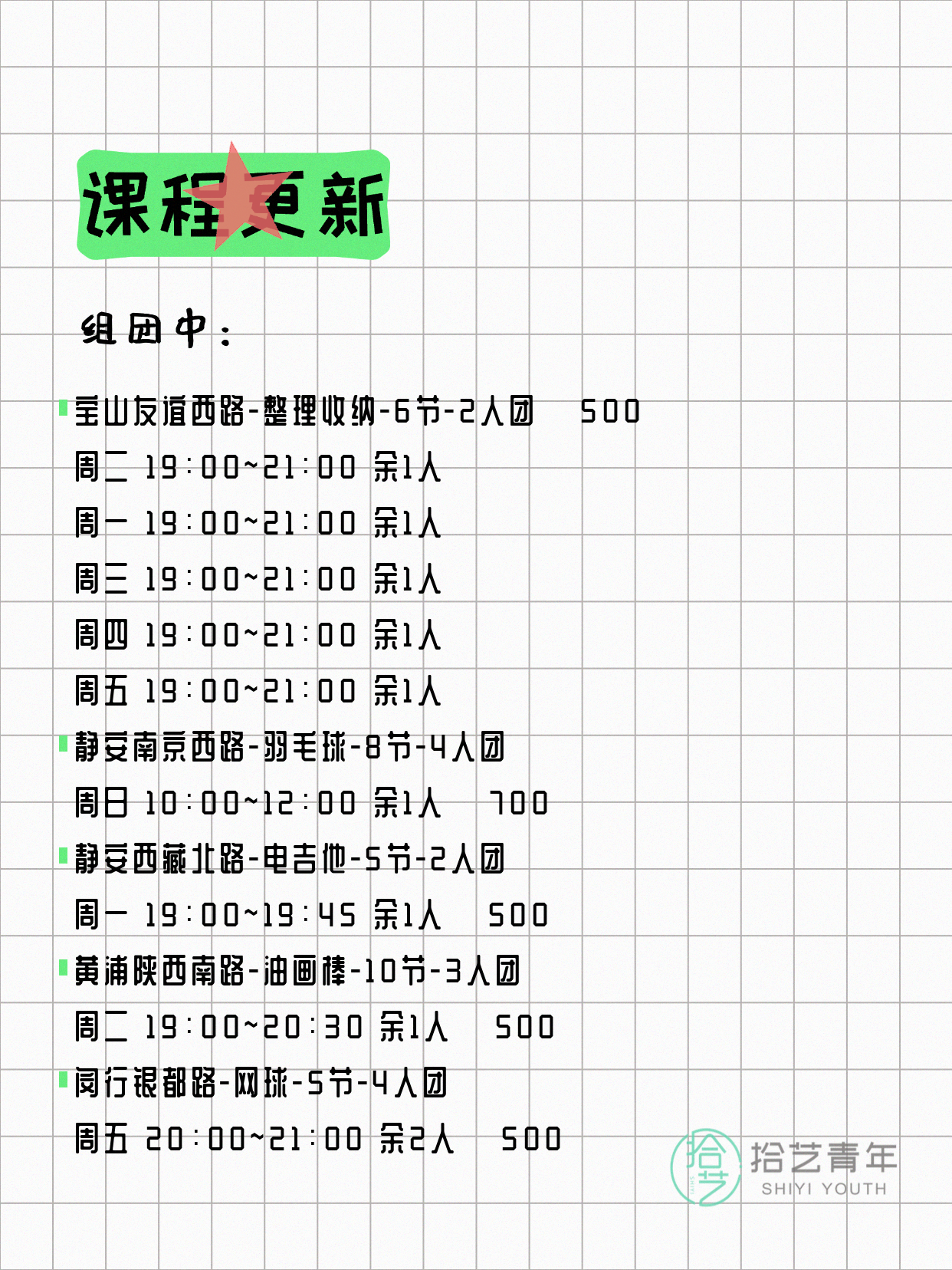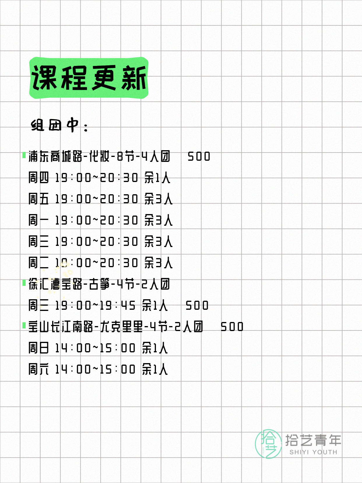 💡 提示:以上课程信息来自拾艺青年小程序,课程可能随报名动态变化,具体以小程序实时信息为准。