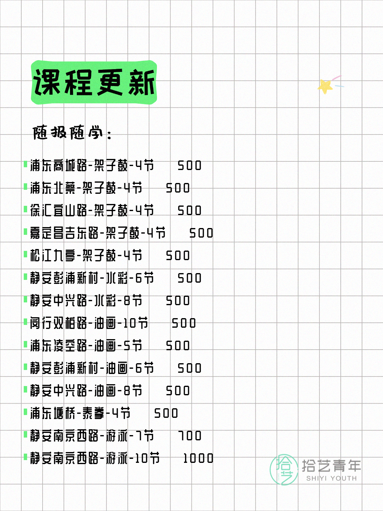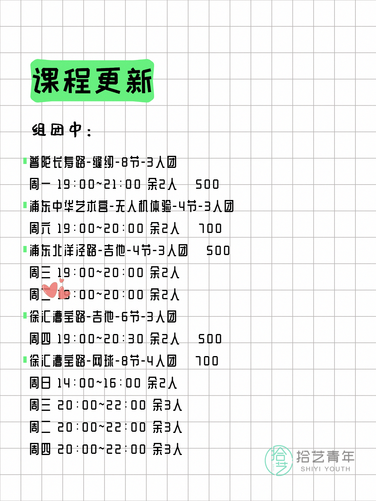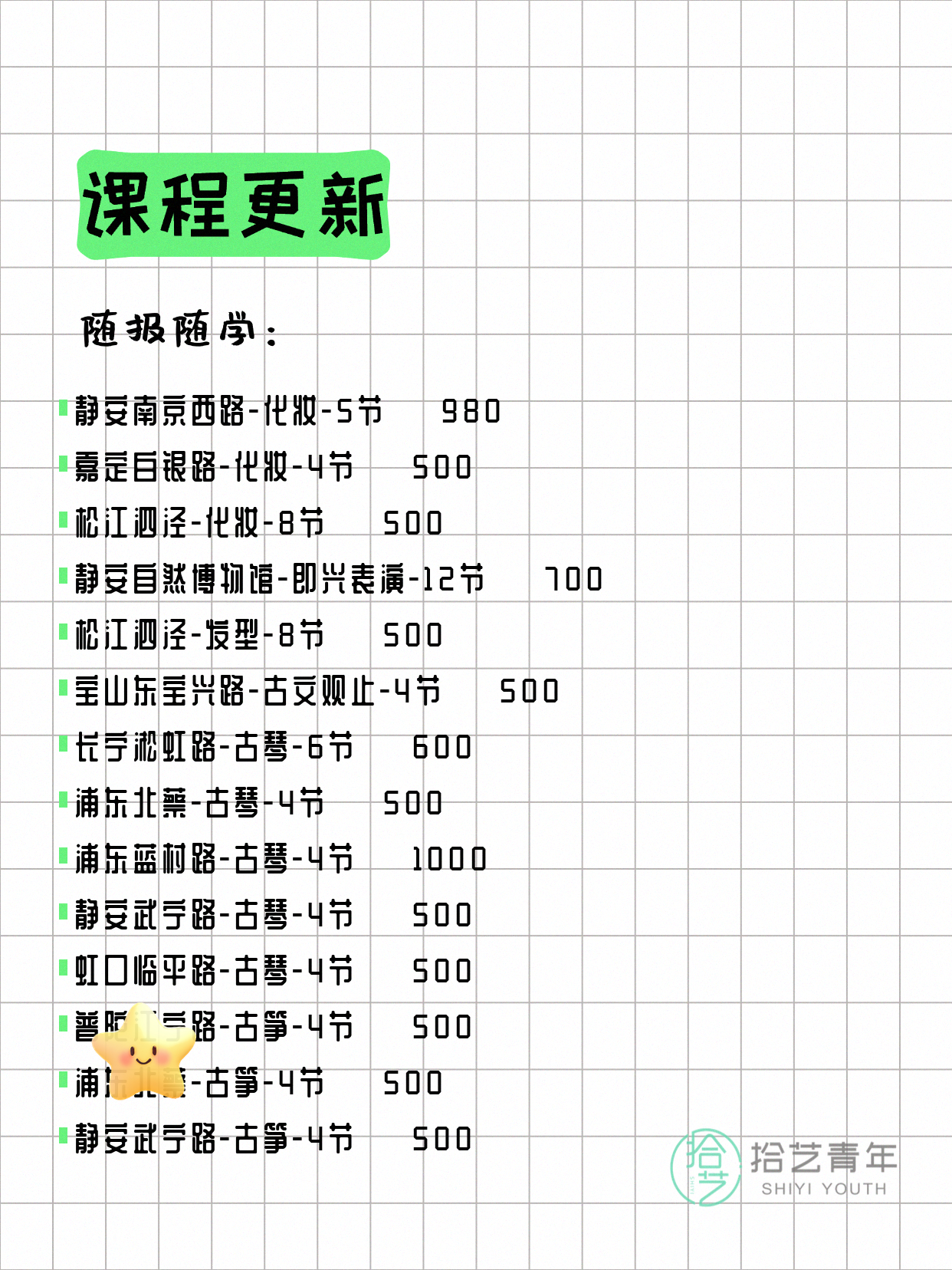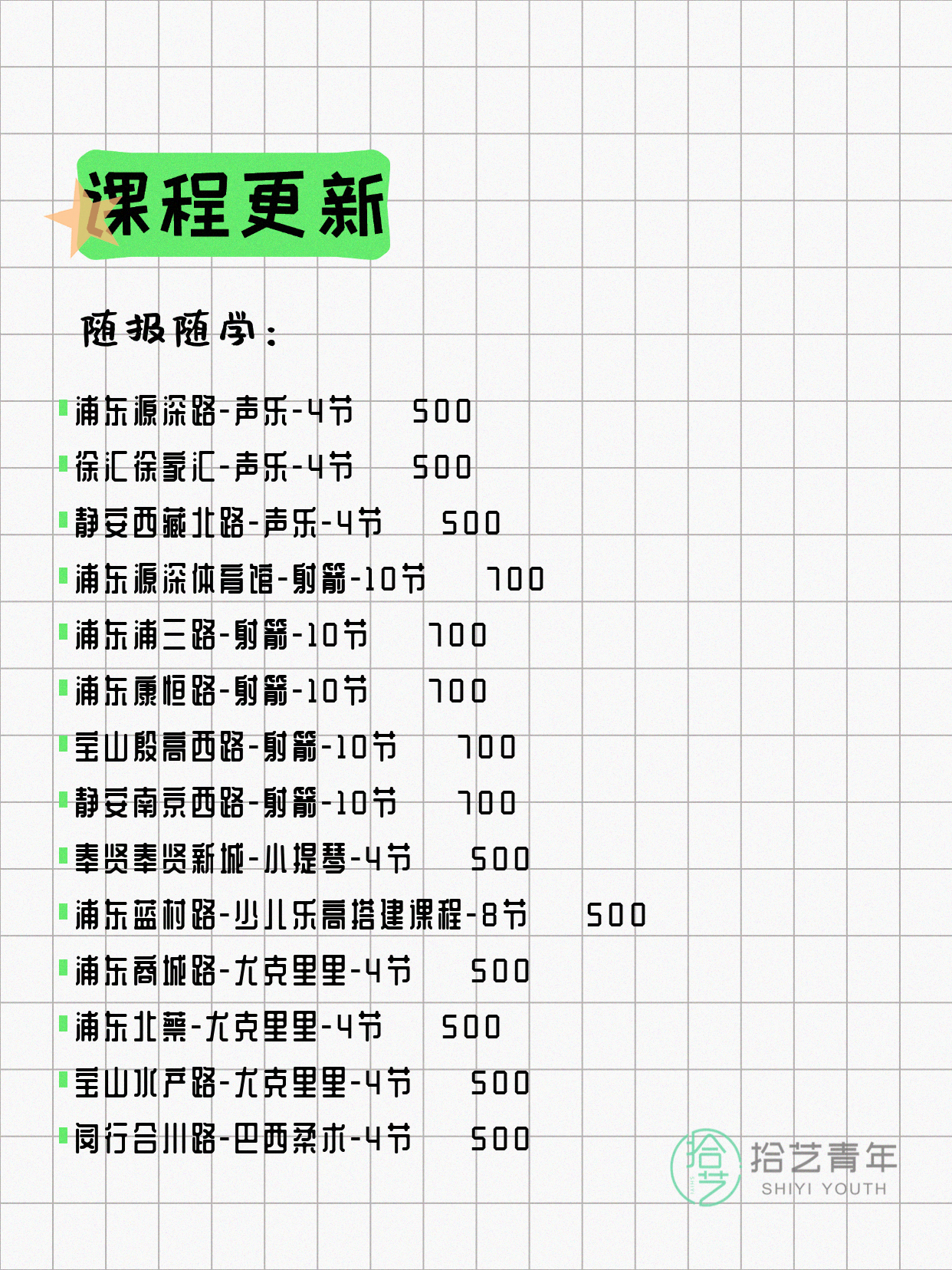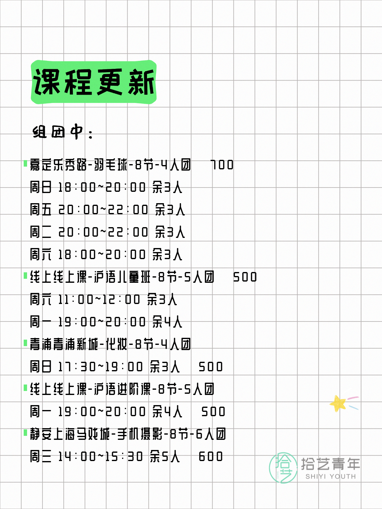 💡 提示:以上课程信息来自拾艺青年小程序,课程可能随报名动态变化,具体以小程序实时信息为准。