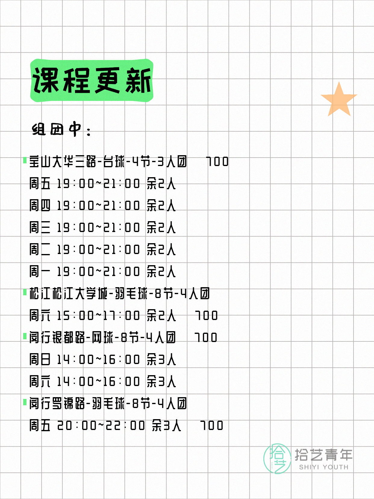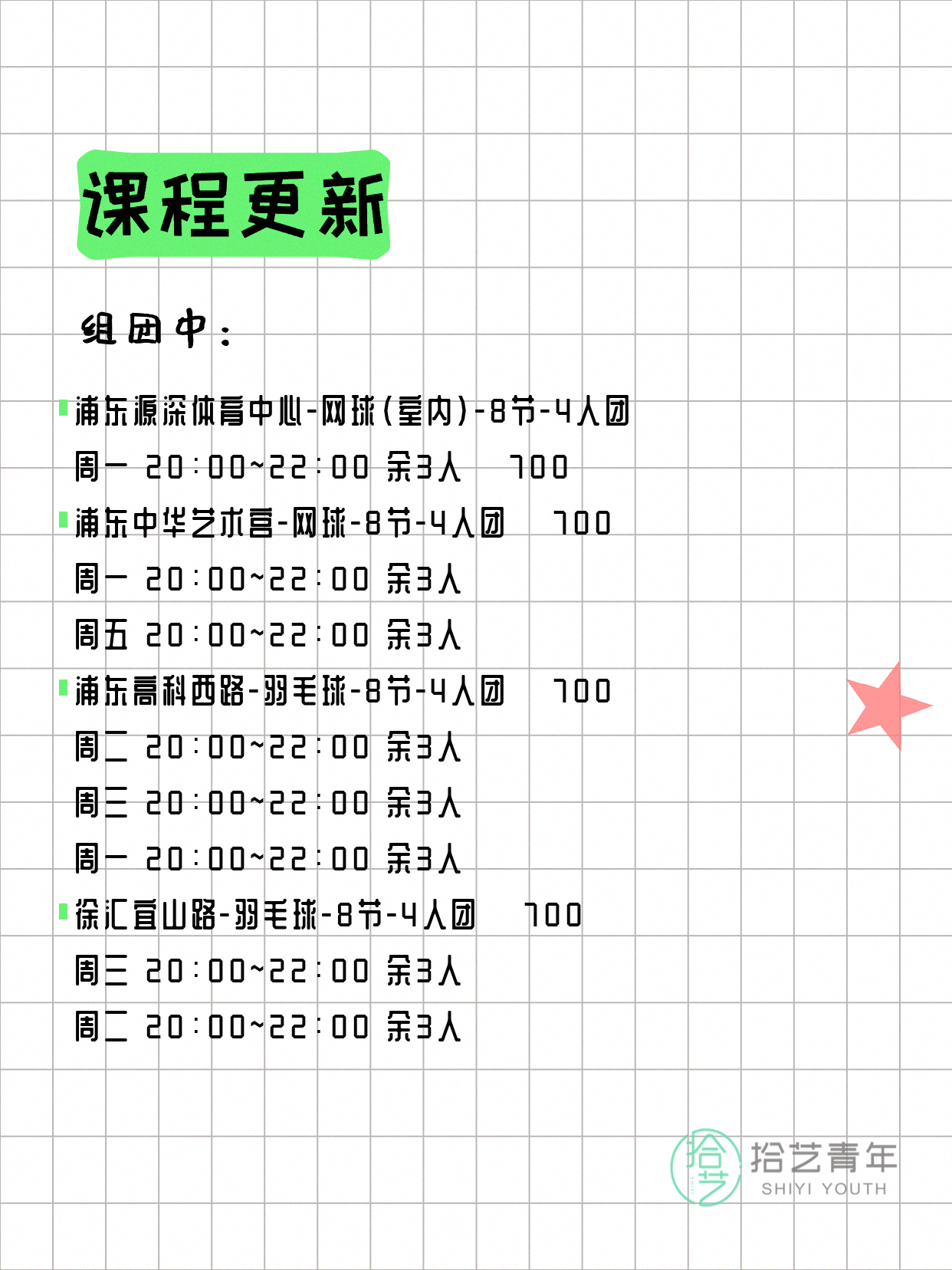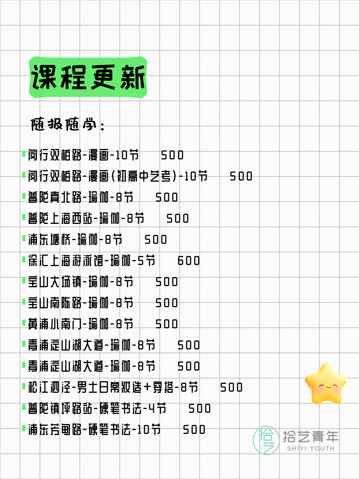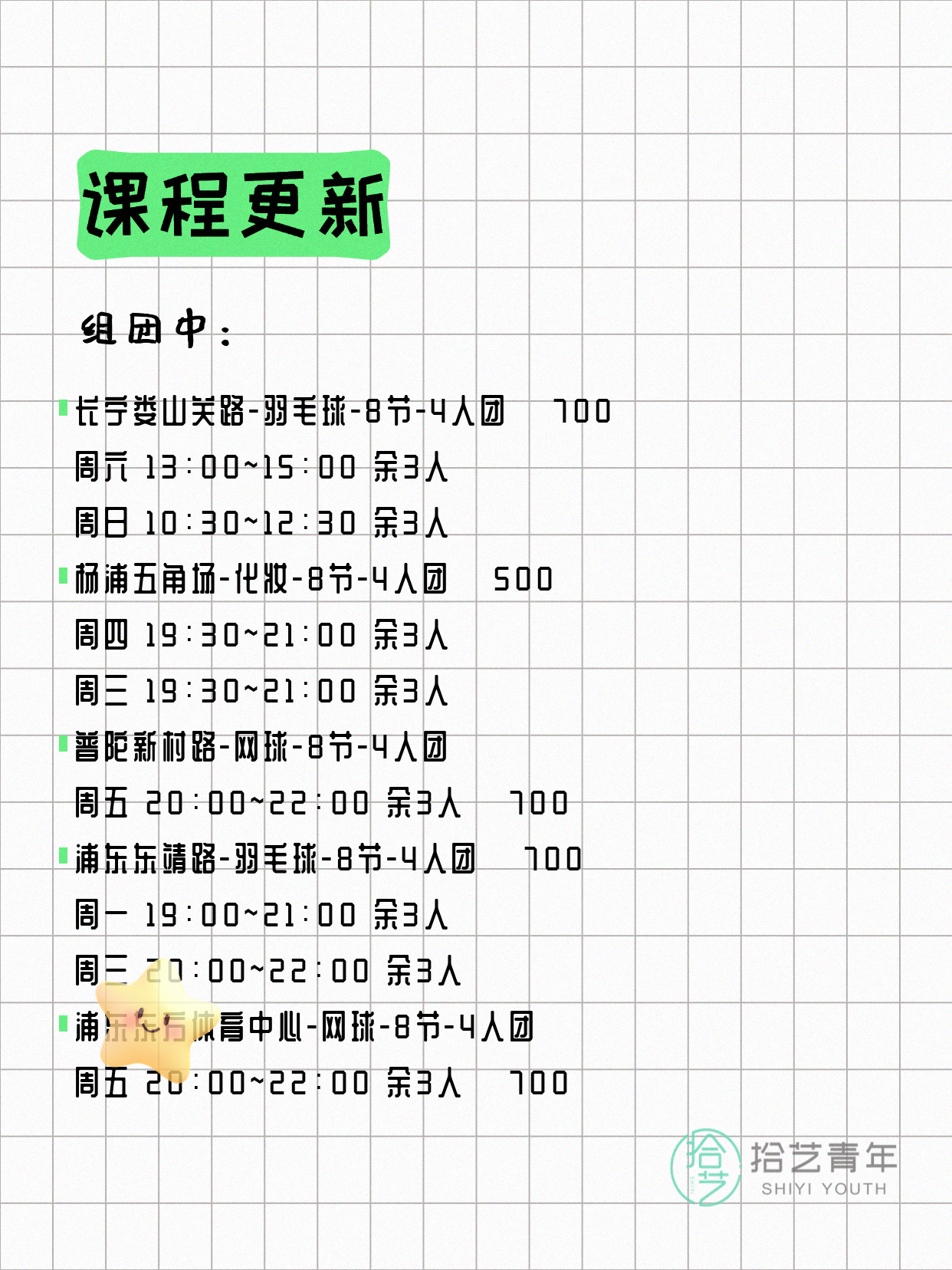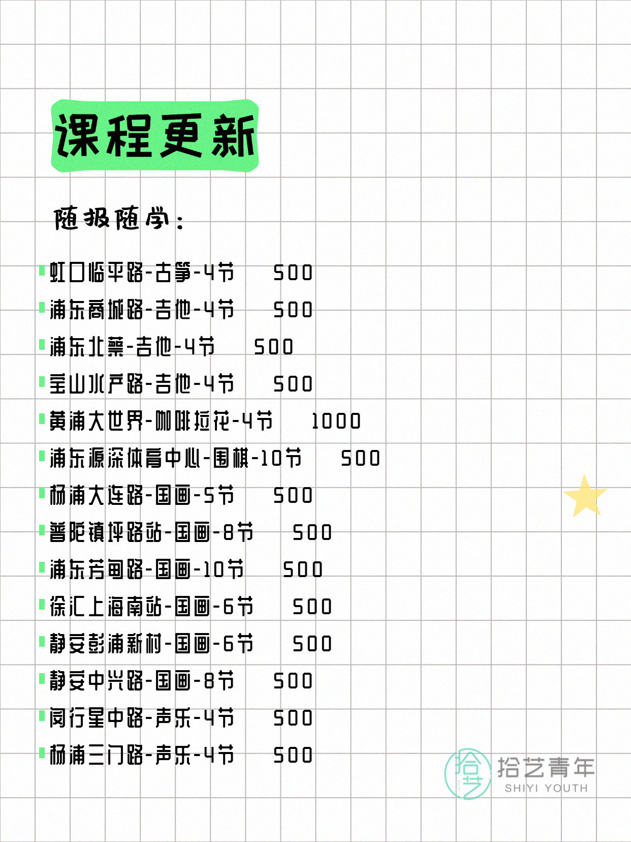 💡 提示:以上课程信息来自拾艺青年小程序,课程可能随报名动态变化,具体以小程序实时信息为准。