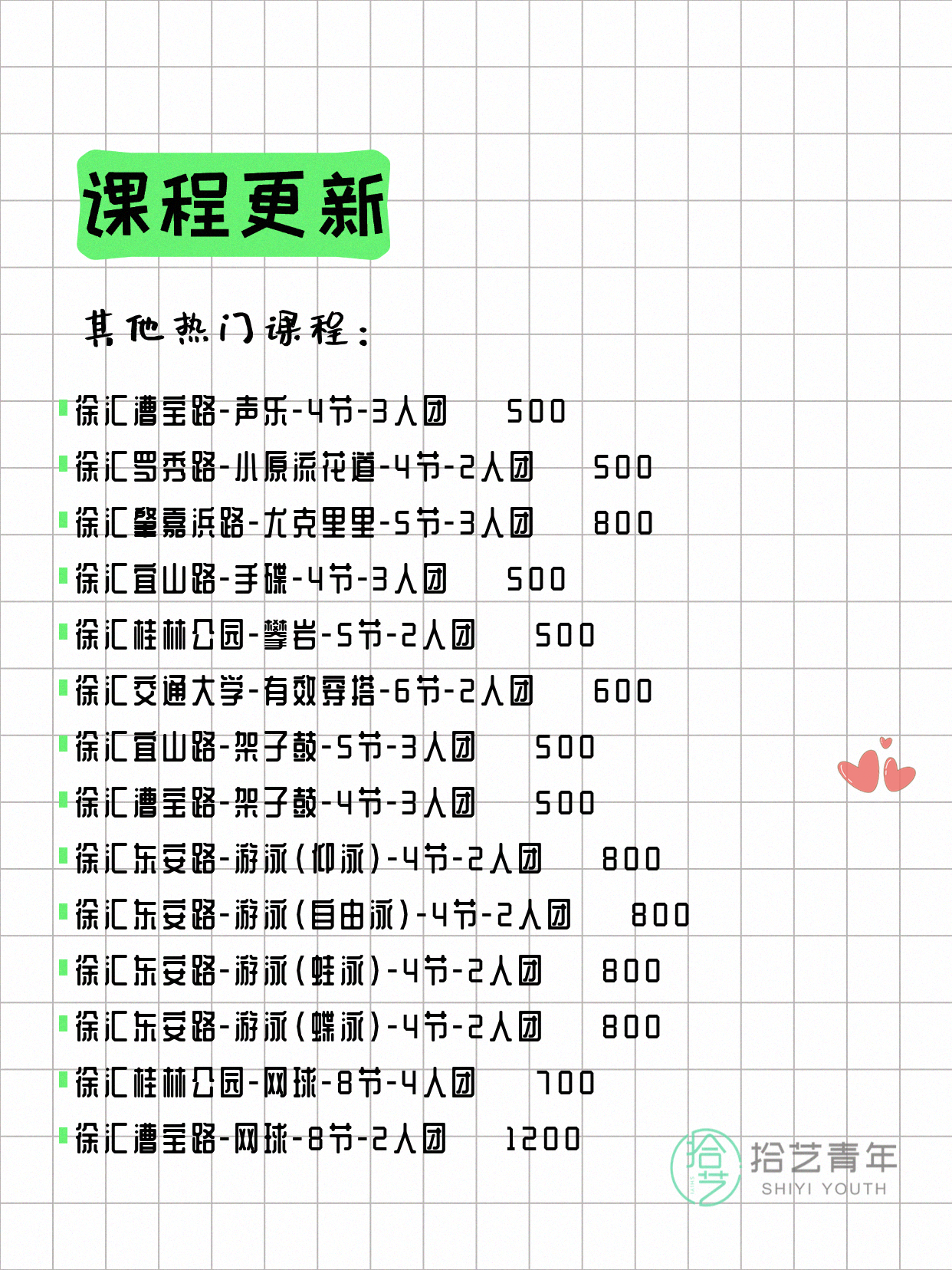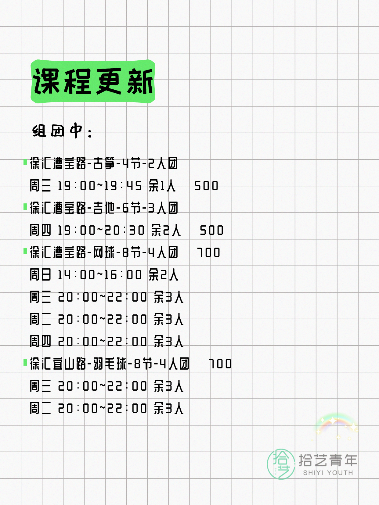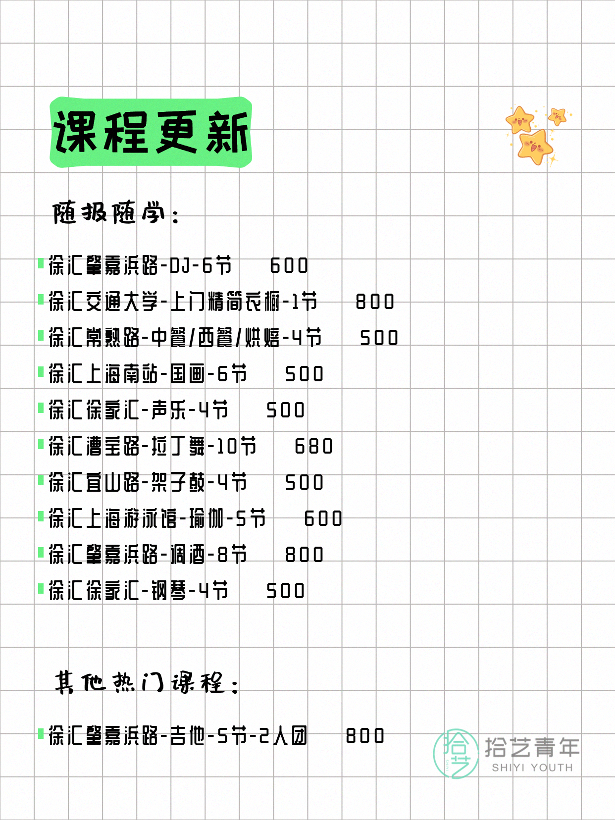 💡 提示:以上课程信息来自拾艺青年小程序,课程可能随报名动态变化,具体以小程序实时信息为准。