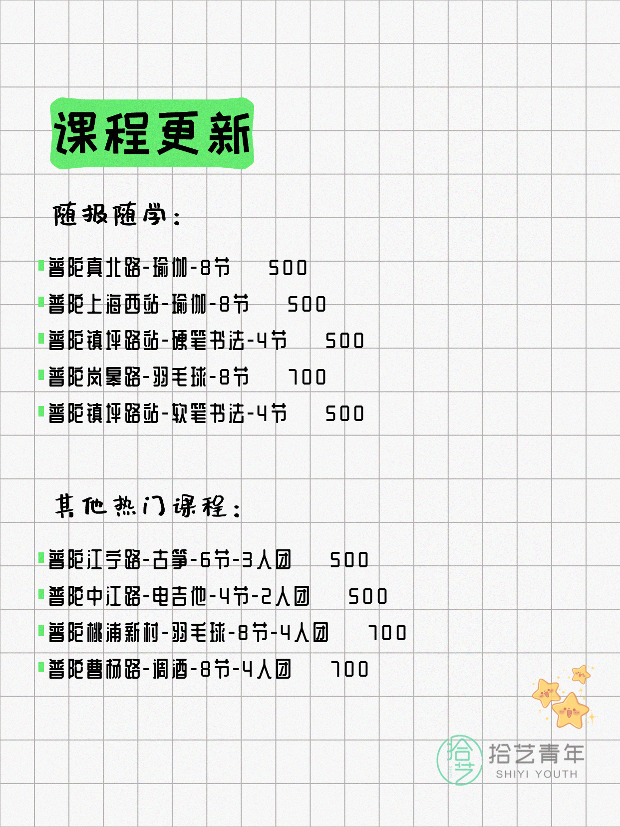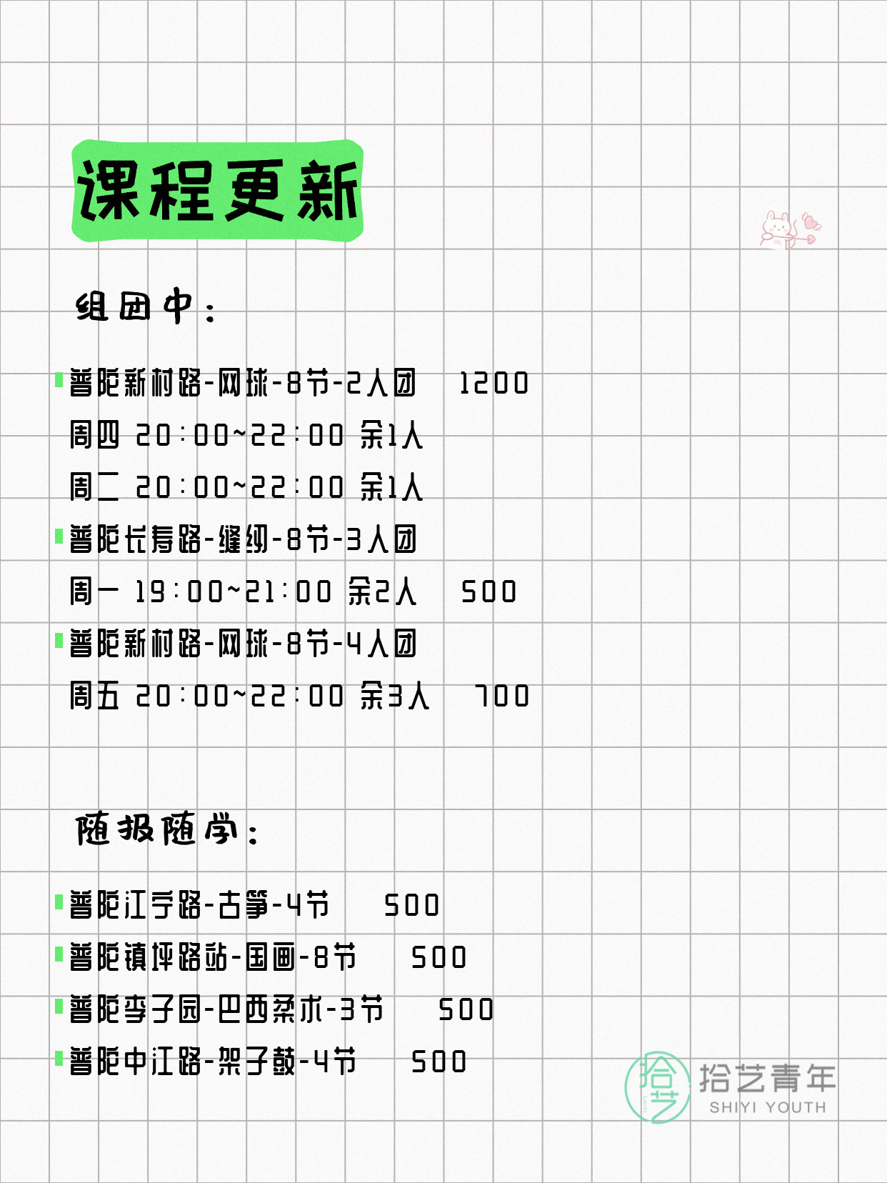 💡 提示:以上课程信息来自拾艺青年小程序,课程可能随报名动态变化,具体以小程序实时信息为准。