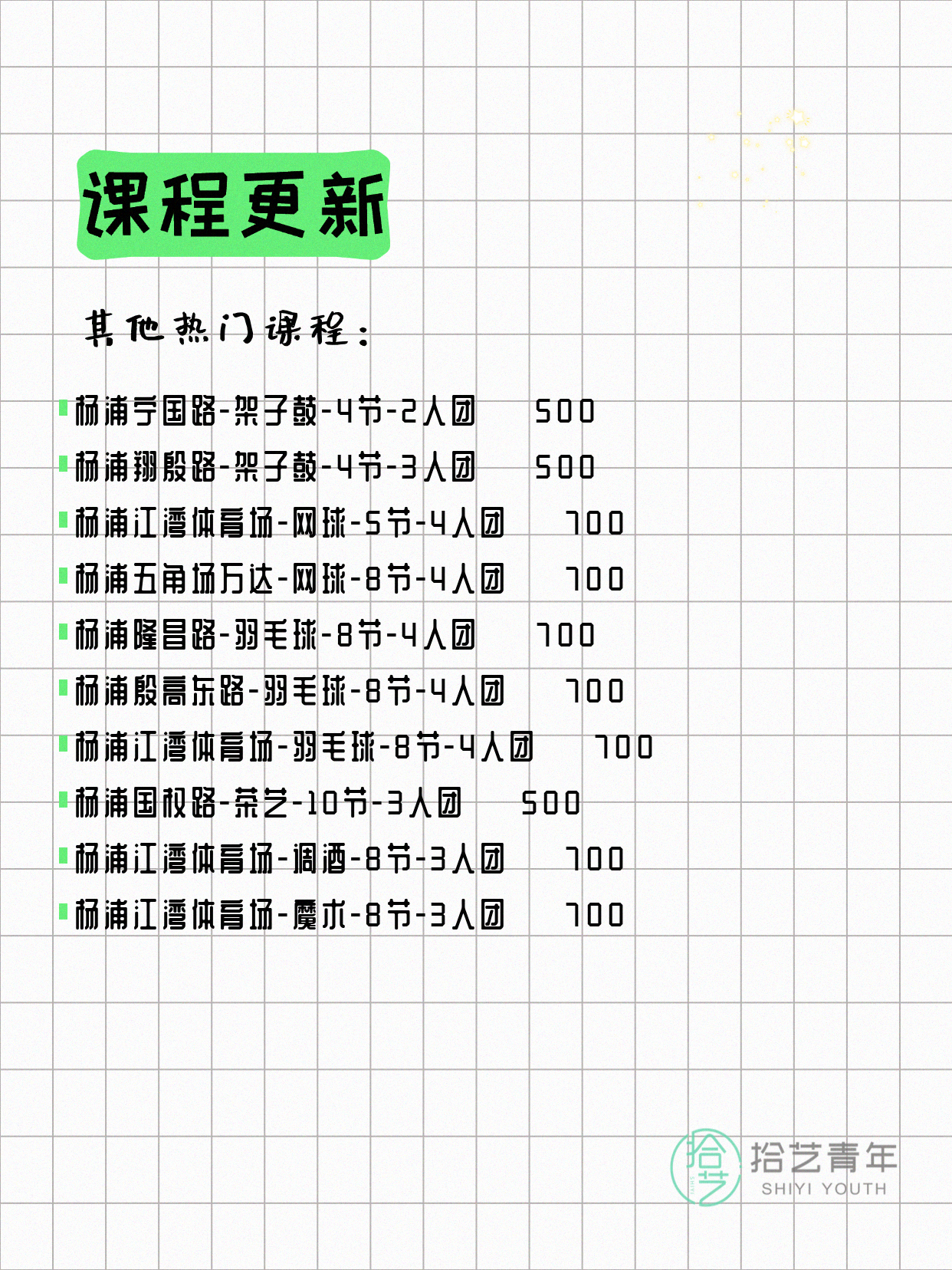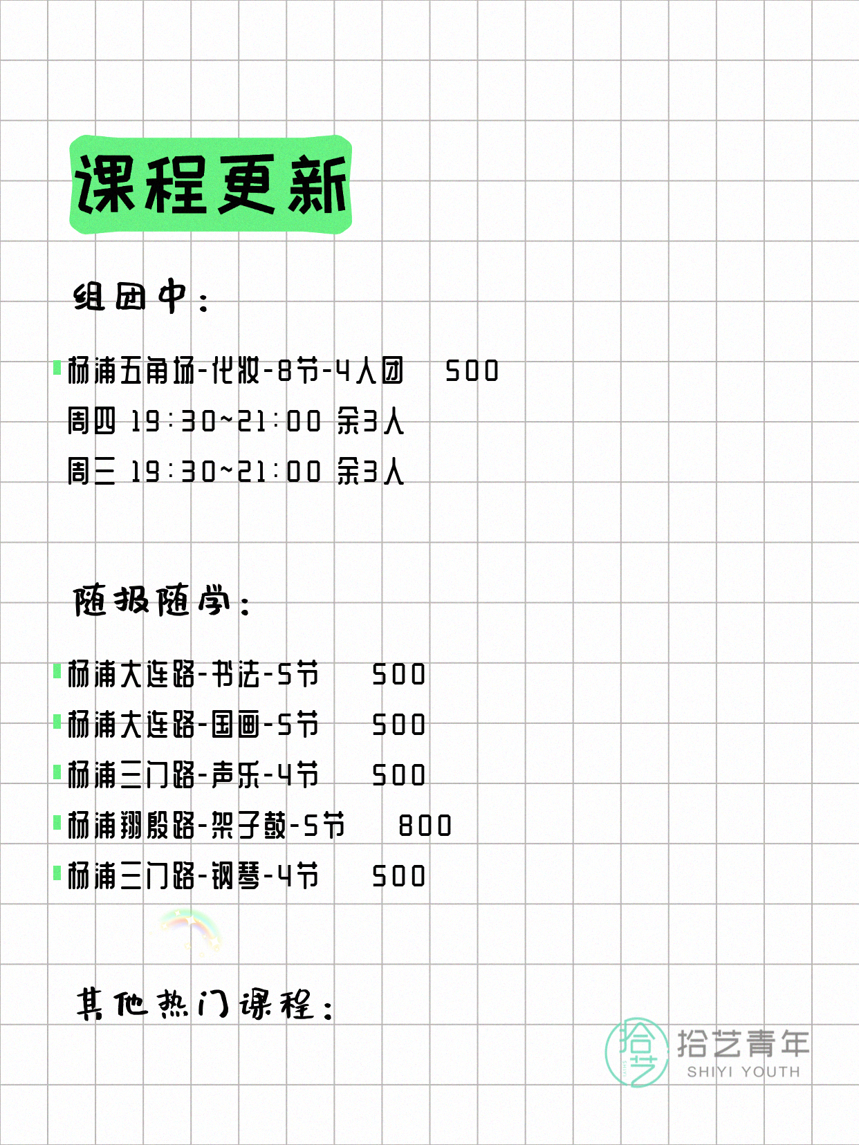 💡 提示:以上课程信息来自拾艺青年小程序,课程可能随报名动态变化,具体以小程序实时信息为准。