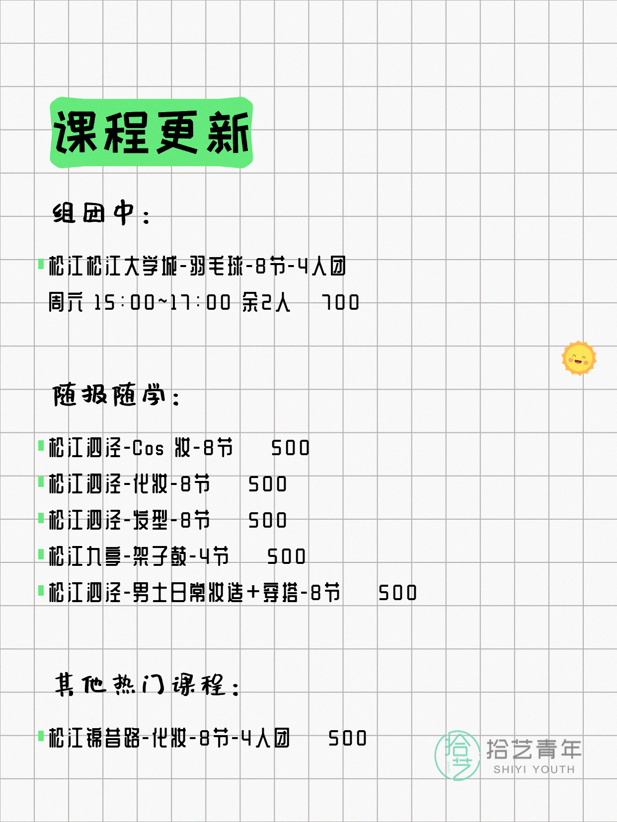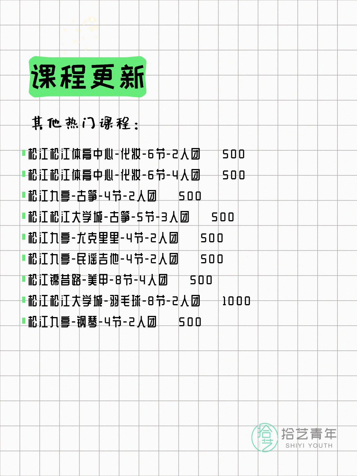 💡 提示:以上课程信息来自拾艺青年小程序,课程可能随报名动态变化,具体以小程序实时信息为准。