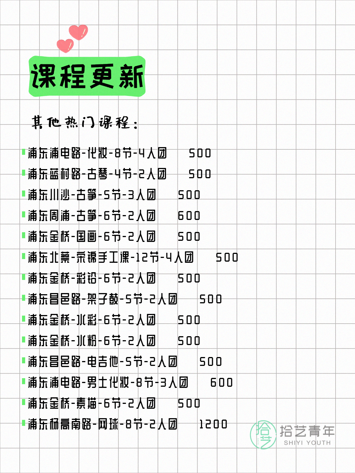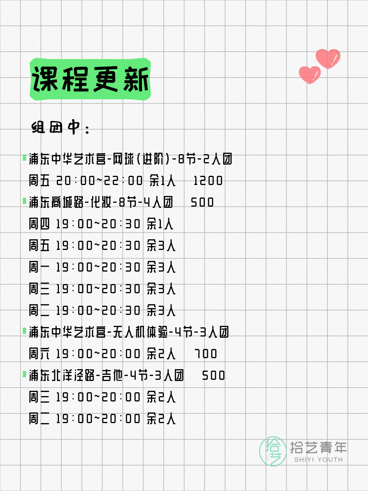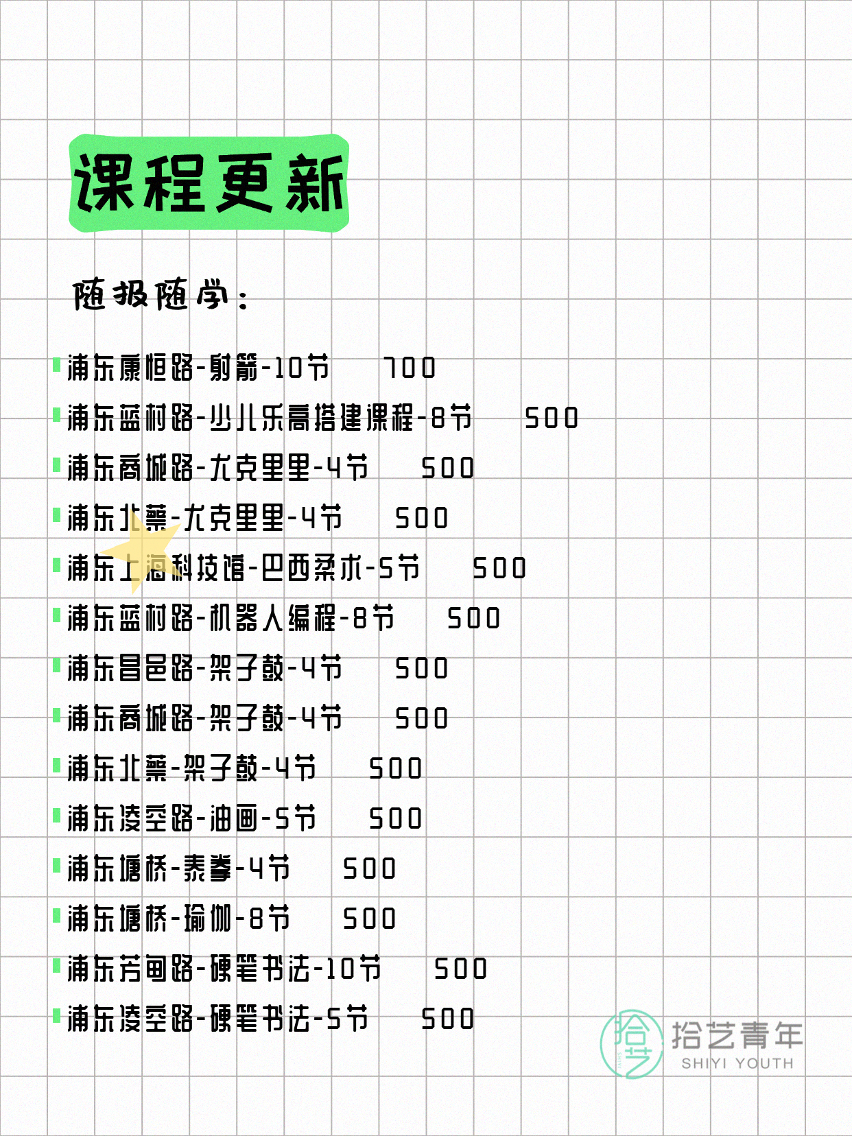 💡 提示:以上课程信息来自拾艺青年小程序,课程可能随报名动态变化,具体以小程序实时信息为准。
