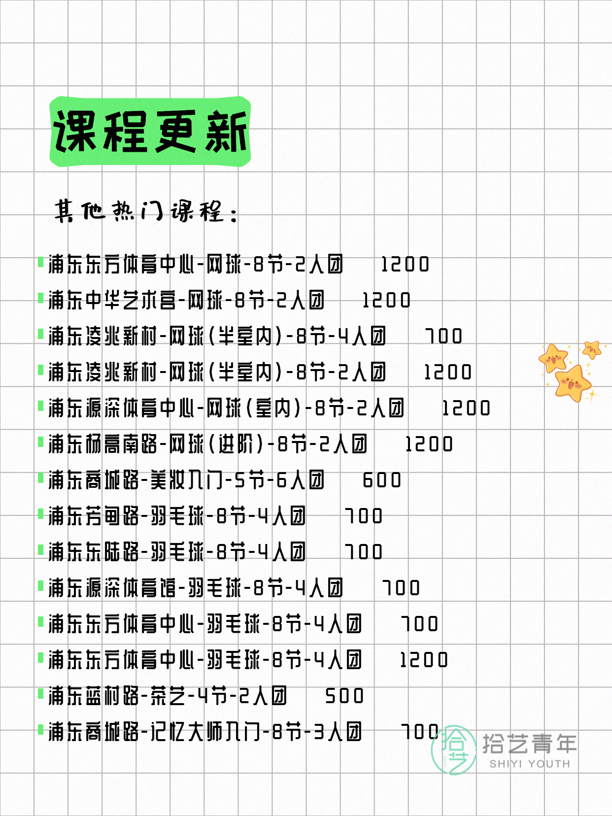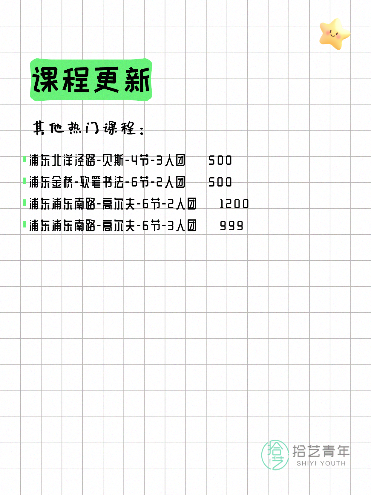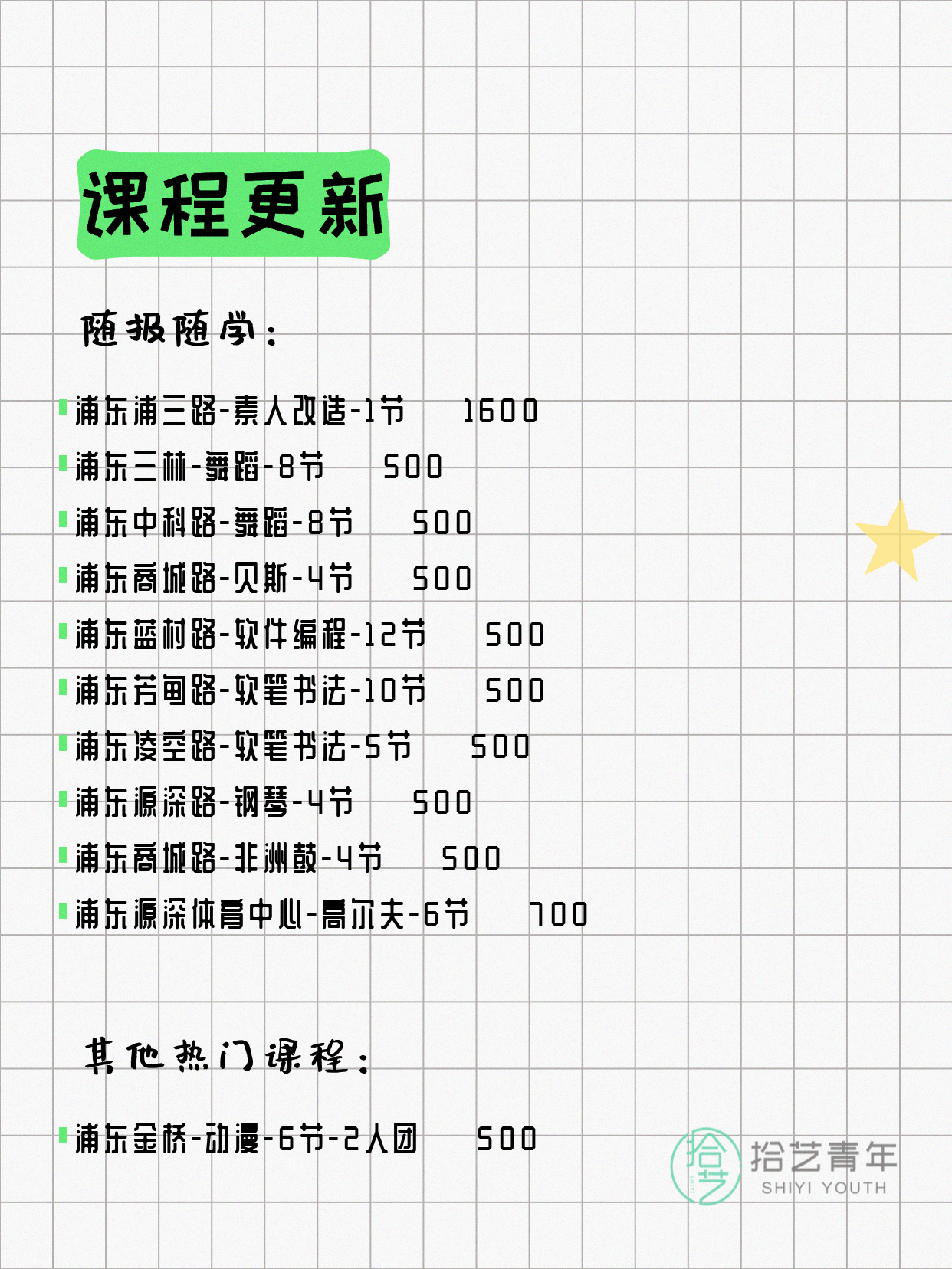 💡 提示:以上课程信息来自拾艺青年小程序,课程可能随报名动态变化,具体以小程序实时信息为准。