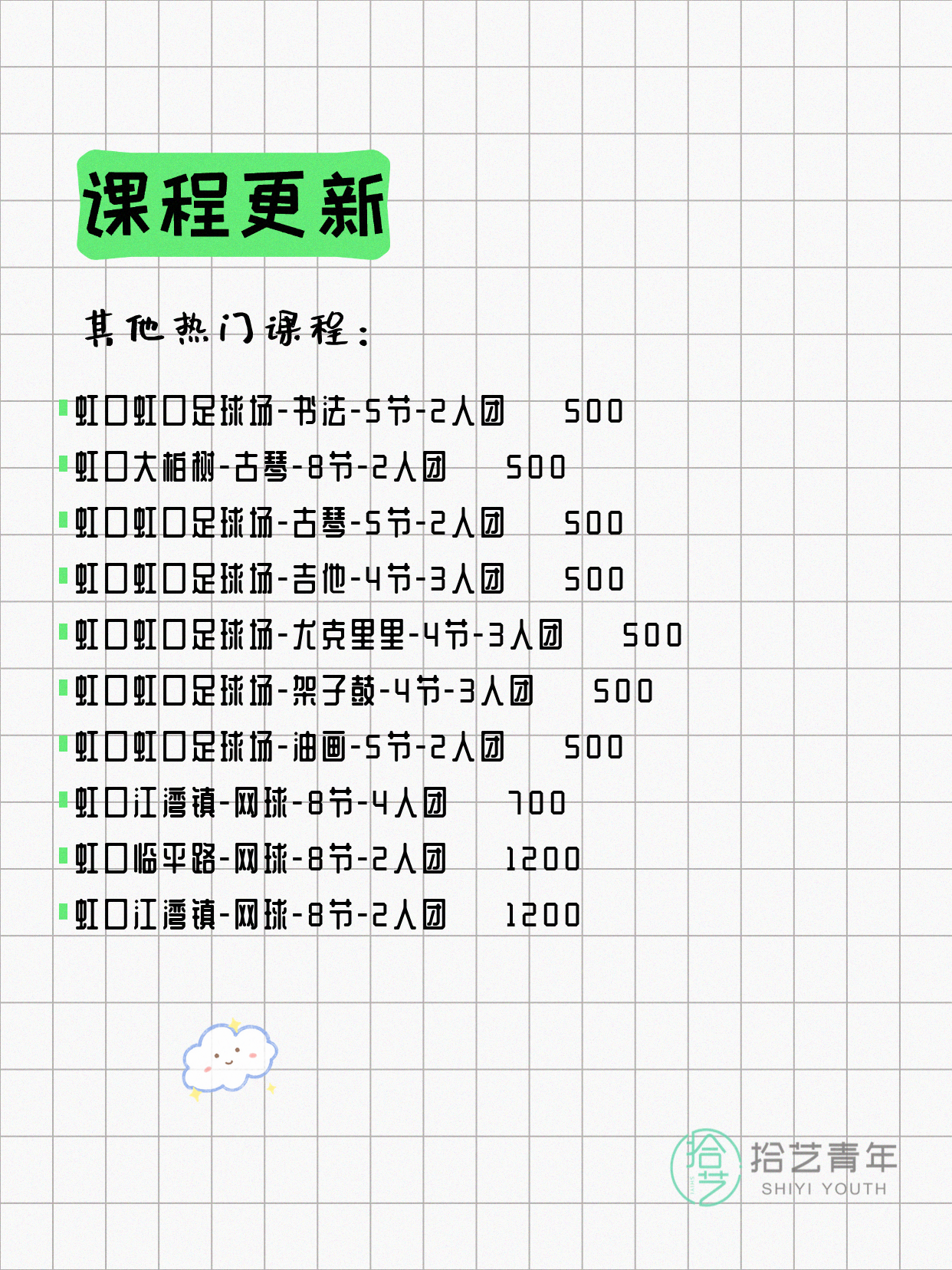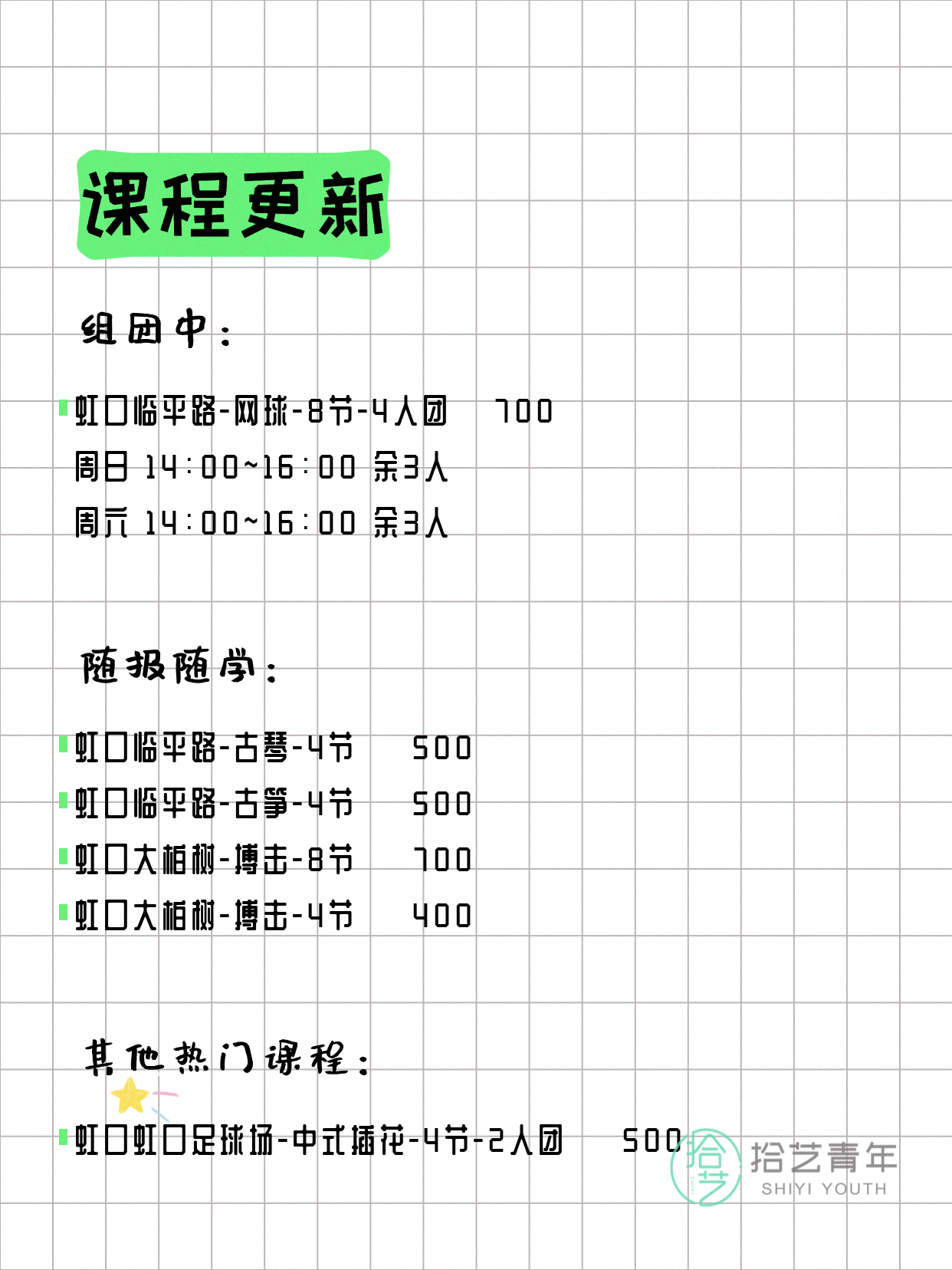 💡 提示:以上课程信息来自拾艺青年小程序,课程可能随报名动态变化,具体以小程序实时信息为准。