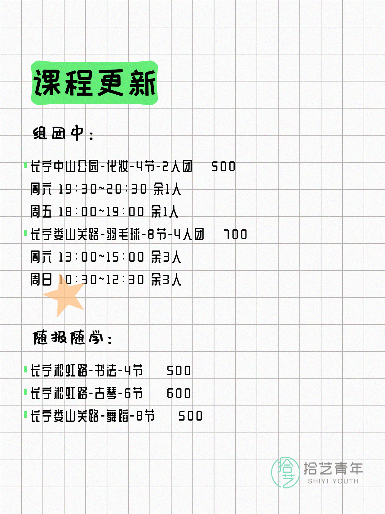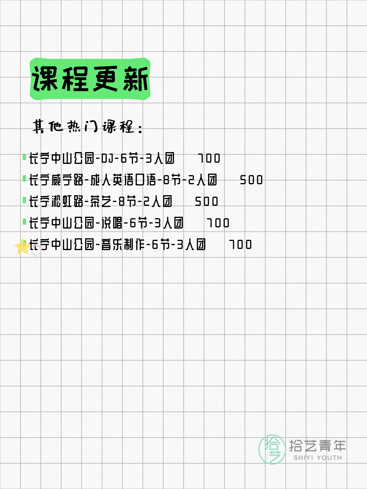💡 提示:以上课程信息来自拾艺青年小程序,课程可能随报名动态变化,具体以小程序实时信息为准。