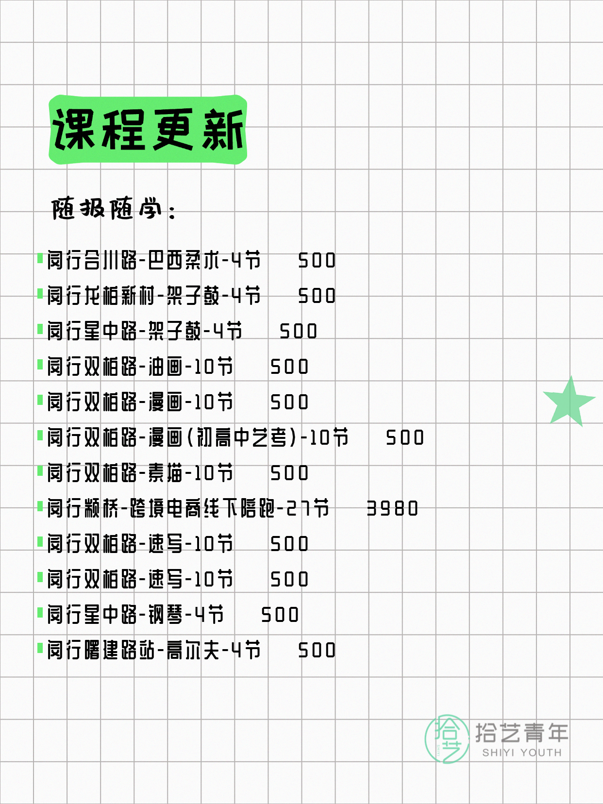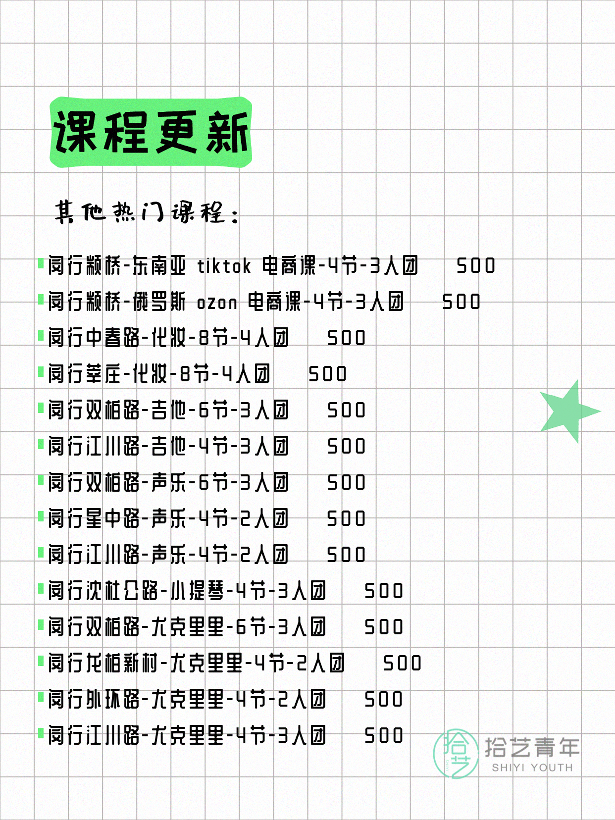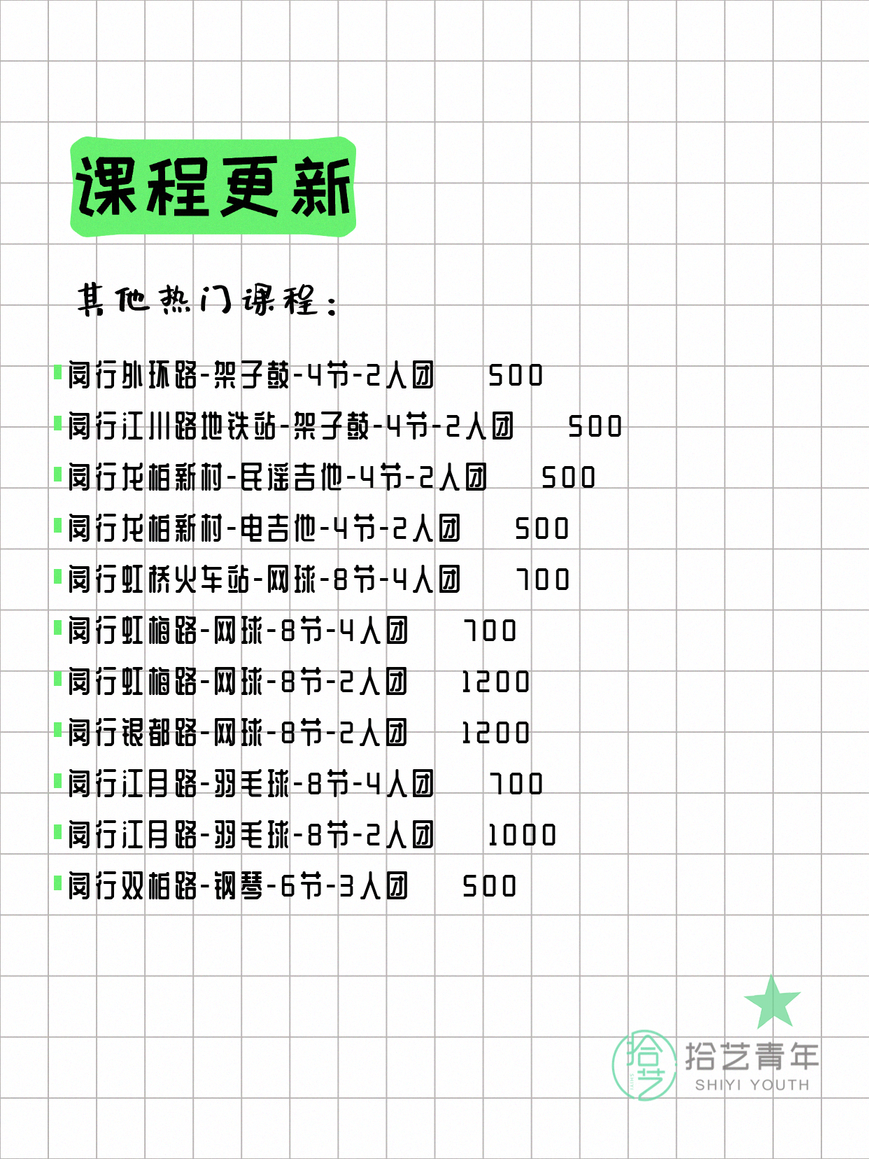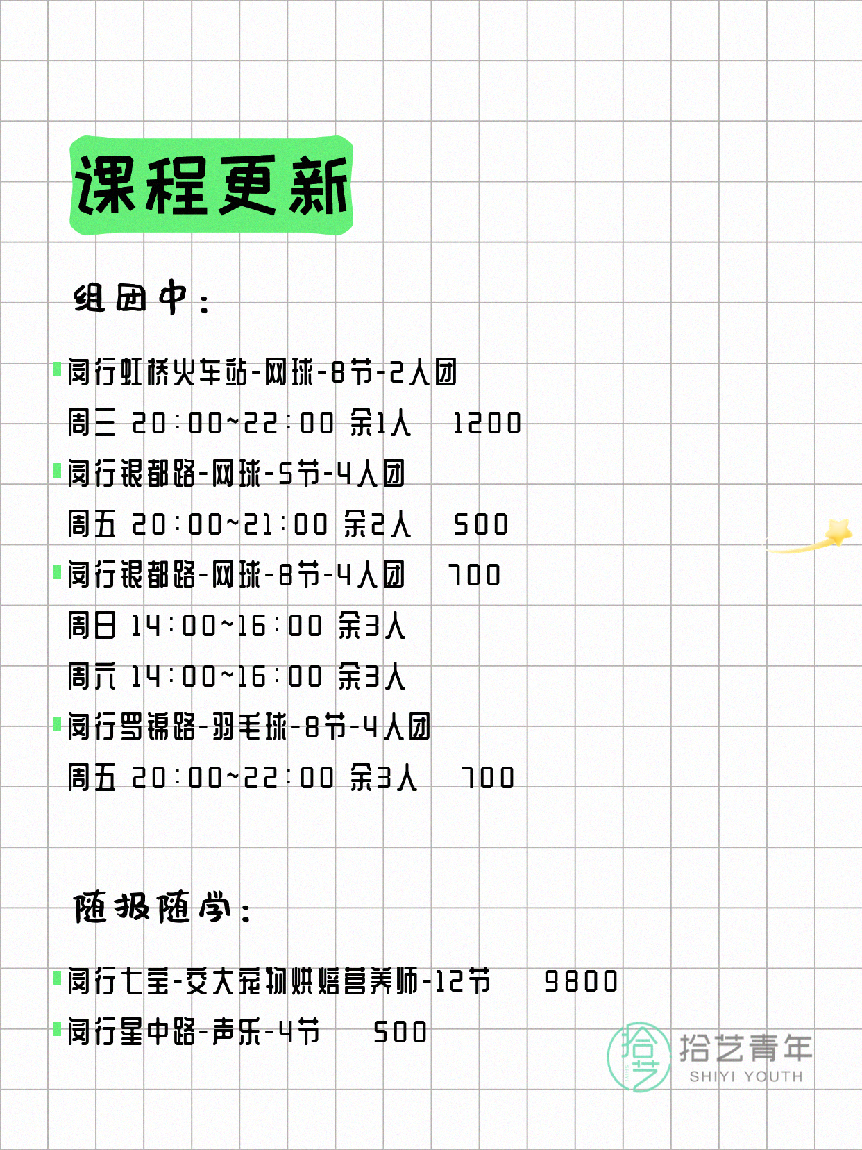 💡 提示:以上课程信息来自拾艺青年小程序,课程可能随报名动态变化,具体以小程序实时信息为准。