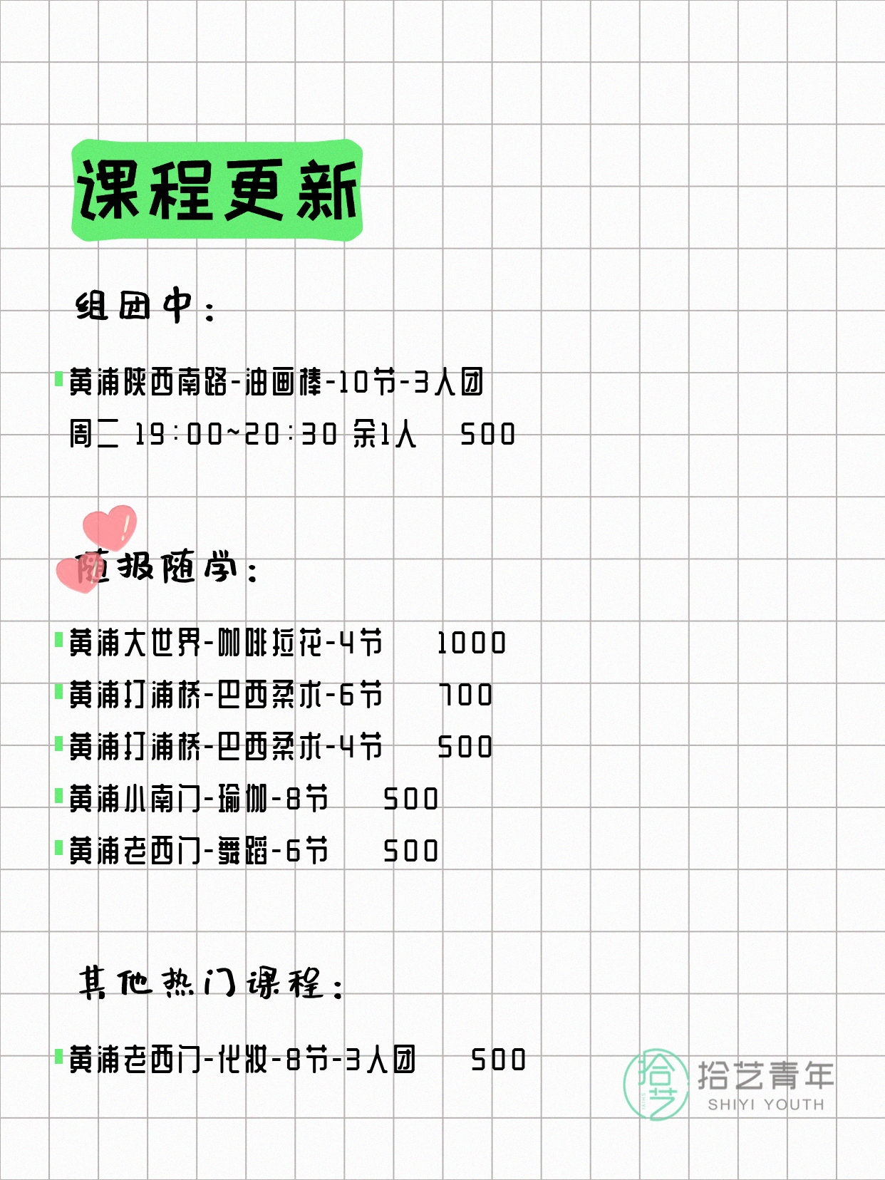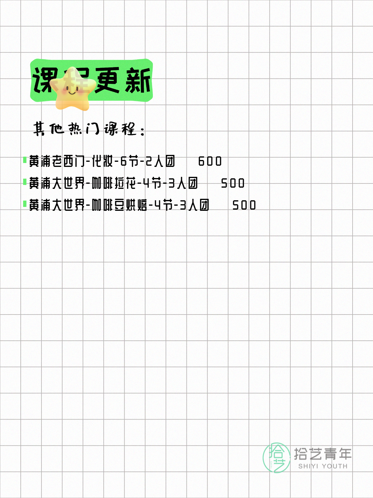 💡 提示:以上课程信息来自拾艺青年小程序,课程可能随报名动态变化,具体以小程序实时信息为准。