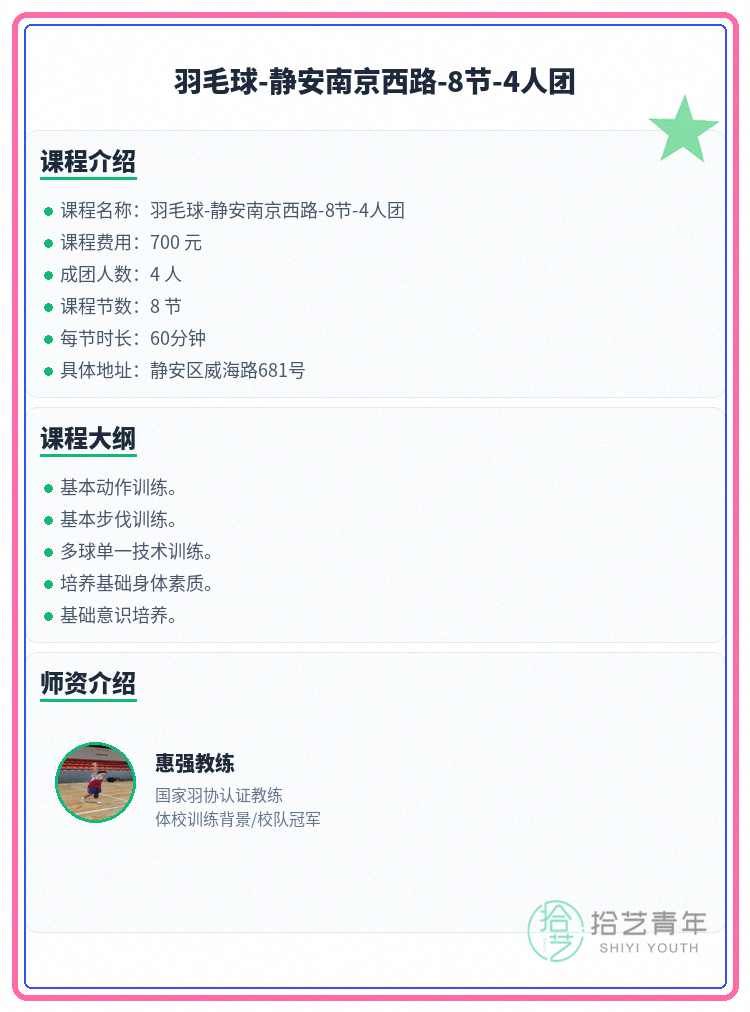 资讯>综合>正文静安南京西路羽毛球差1人 快来拾艺青年2026-04-101 / 2羽毛球课团人差最后1个,早报早开课~🏫 上课地点:静安区威海路681号📅 课程安排:共8节 | 周日 10:00-12:00📖 课程大纲:基本动作训练。基本步伐训练。多球单一技术训练。培养基础身体素质。基础意识培养。👥 4人团 | 已报3人 | 还差1人开课#上海夜校 #静安夜校 #羽毛球课程 #夜校拼团 #上海线下课相关标签#上海夜校#静安夜校#羽毛球课程#夜校拼团#上海线下课