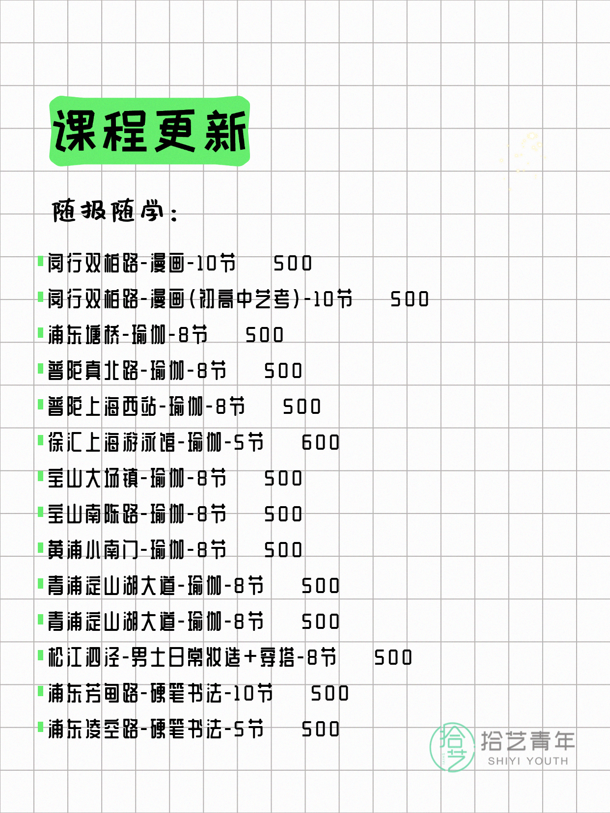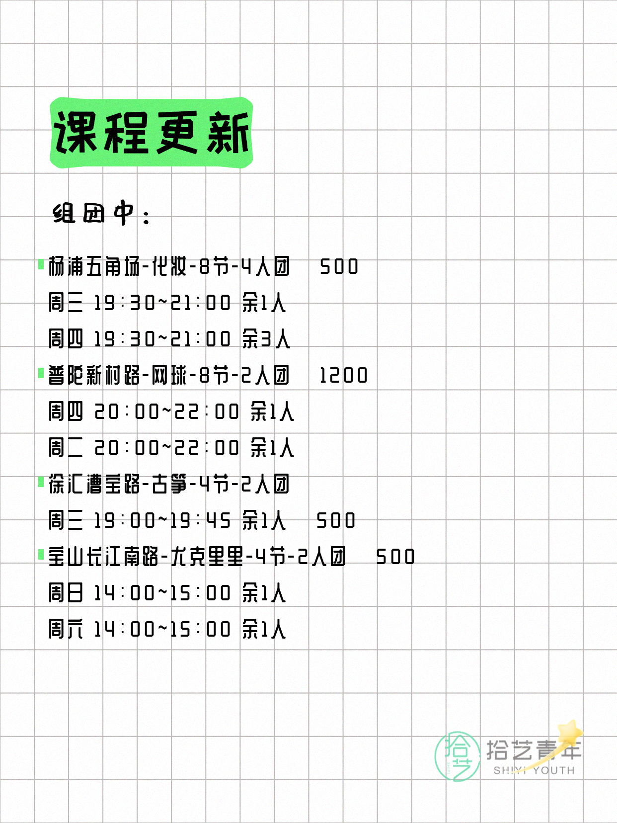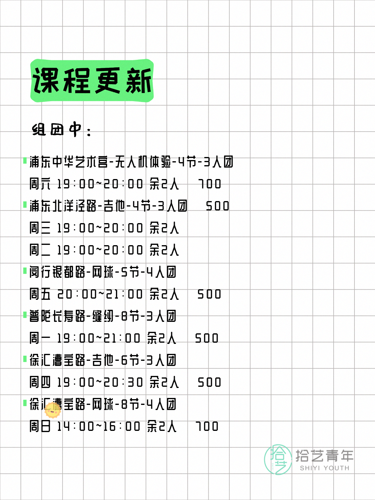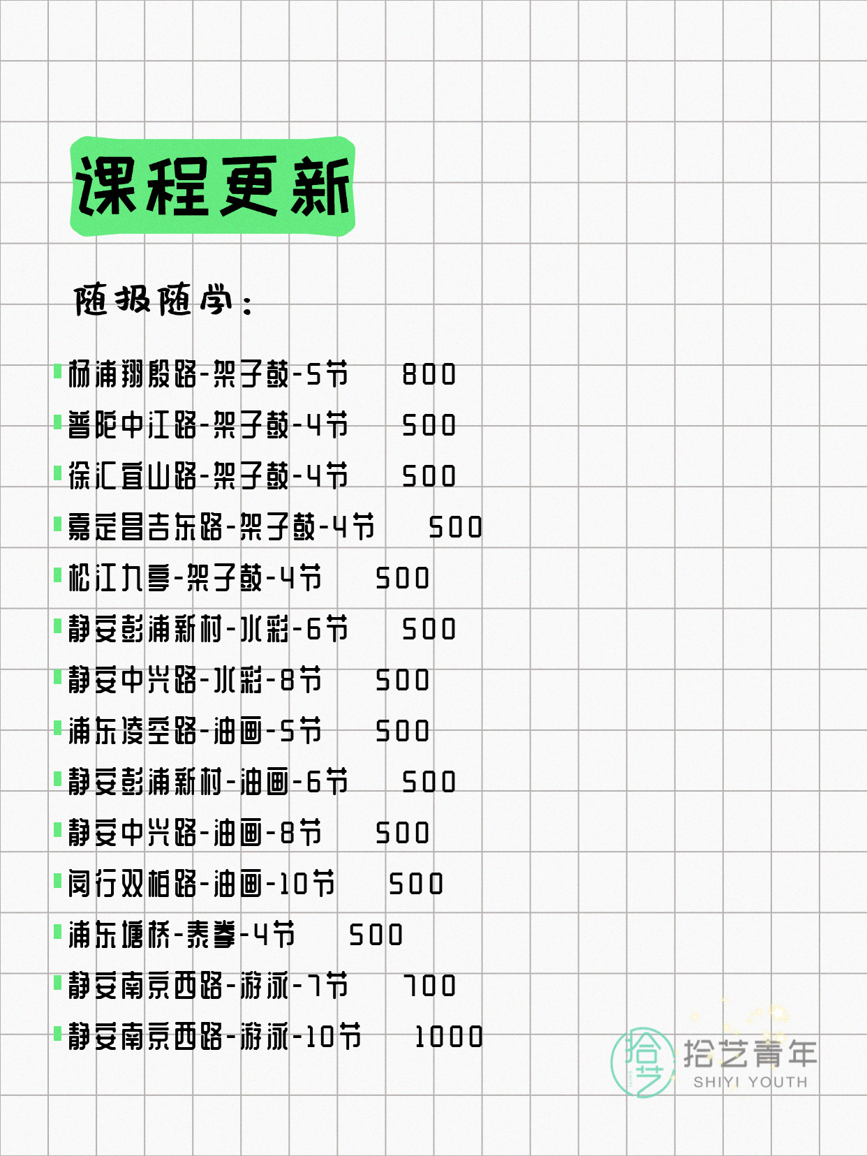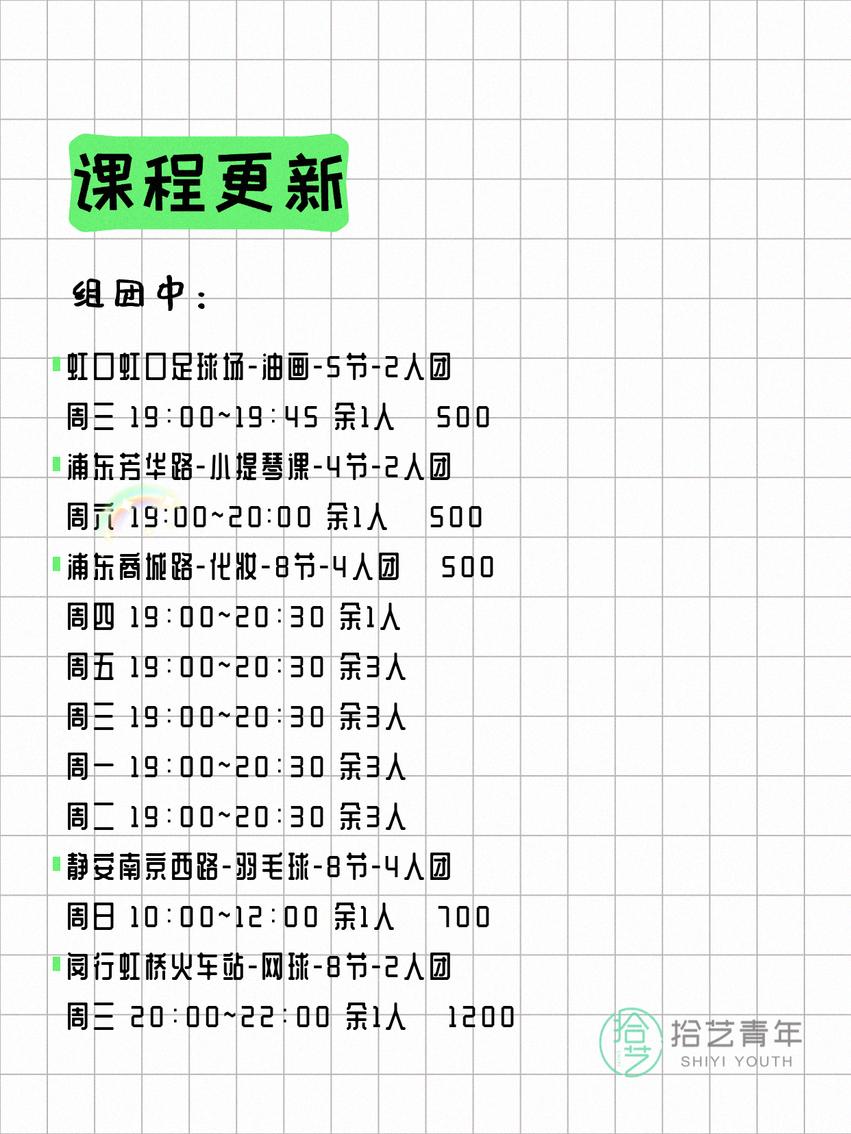 💡 提示:以上课程信息来自拾艺青年小程序,课程可能随报名动态变化,具体以小程序实时信息为准。
