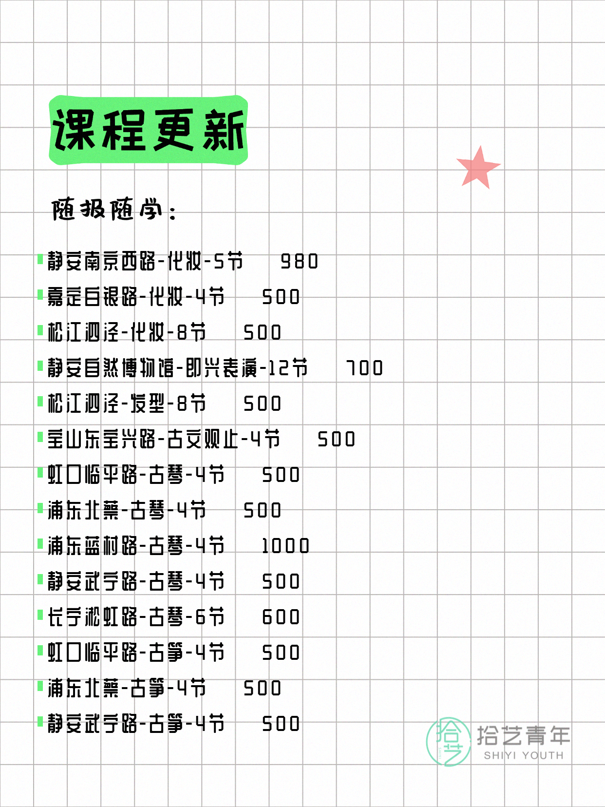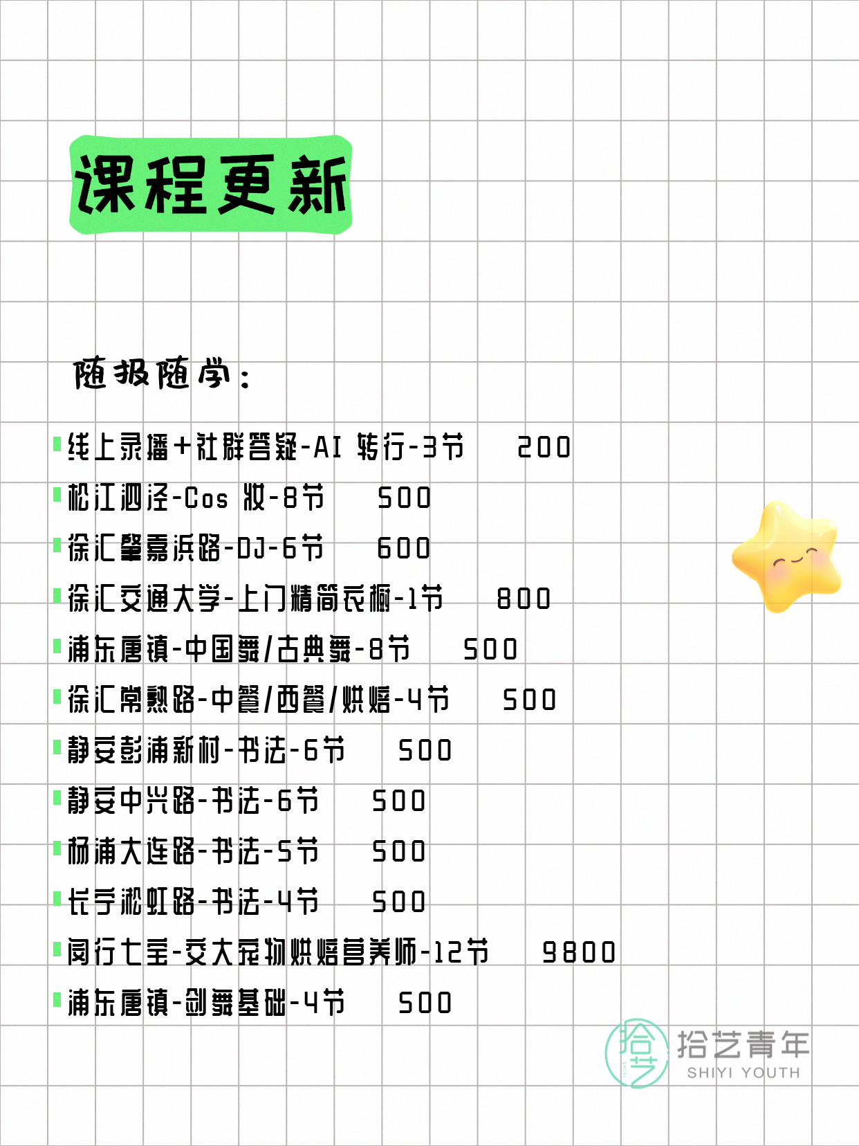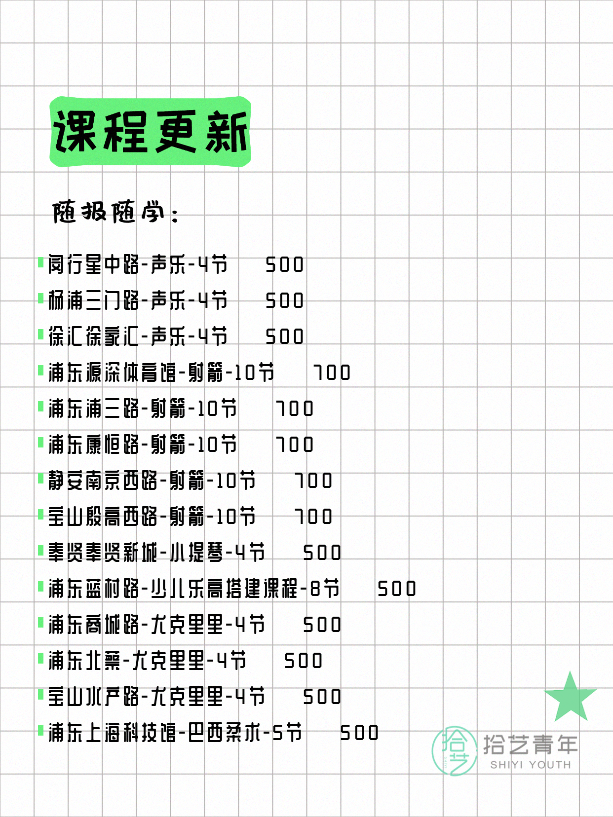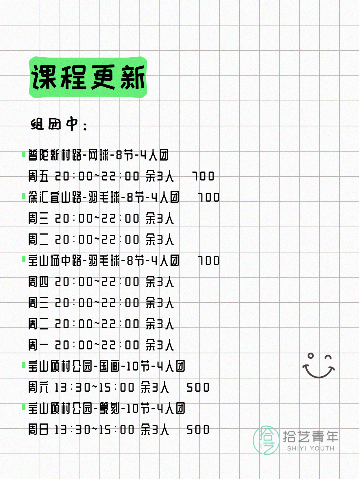 💡 提示:以上课程信息来自拾艺青年小程序,课程可能随报名动态变化,具体以小程序实时信息为准。