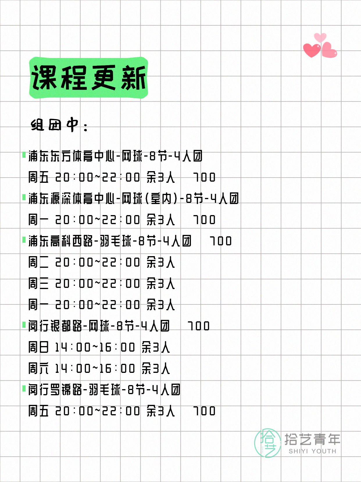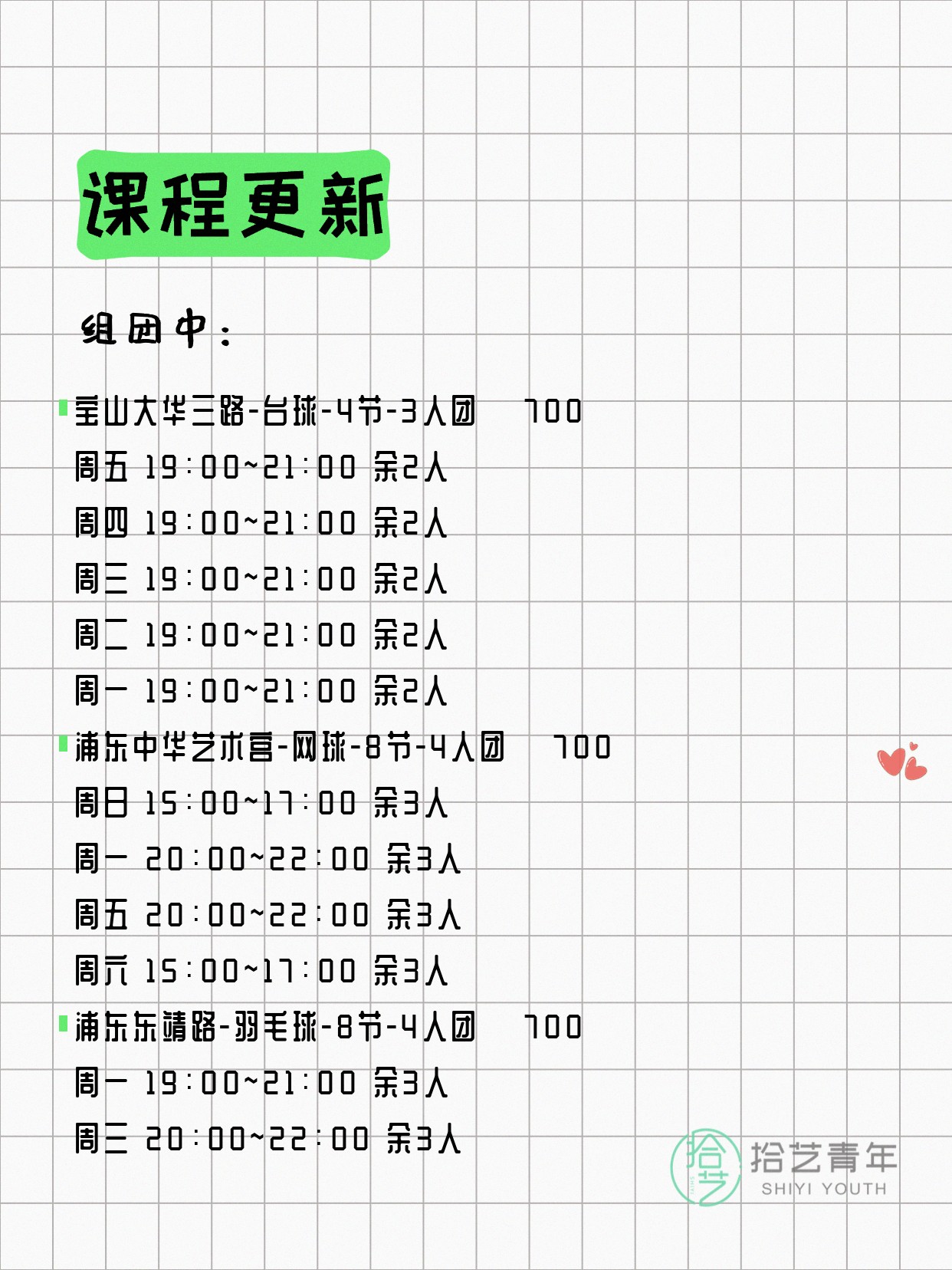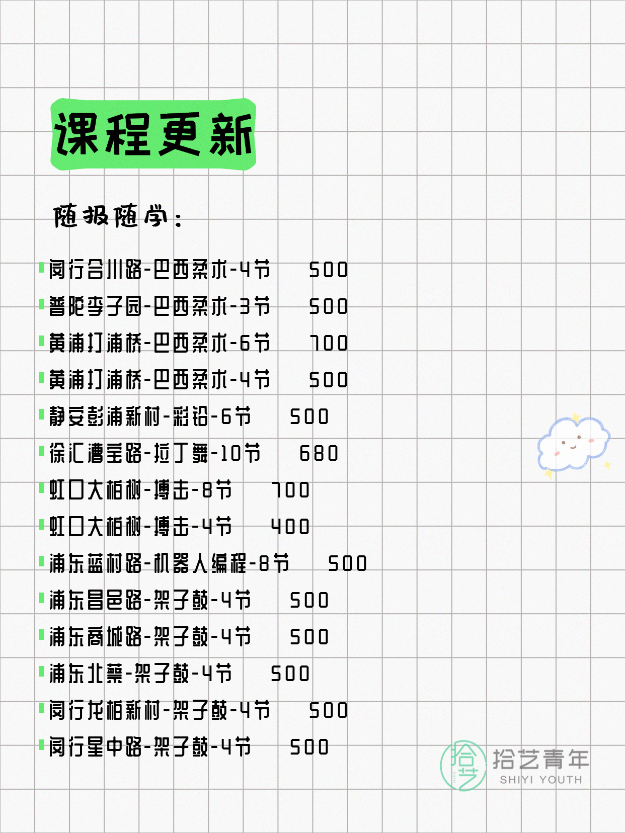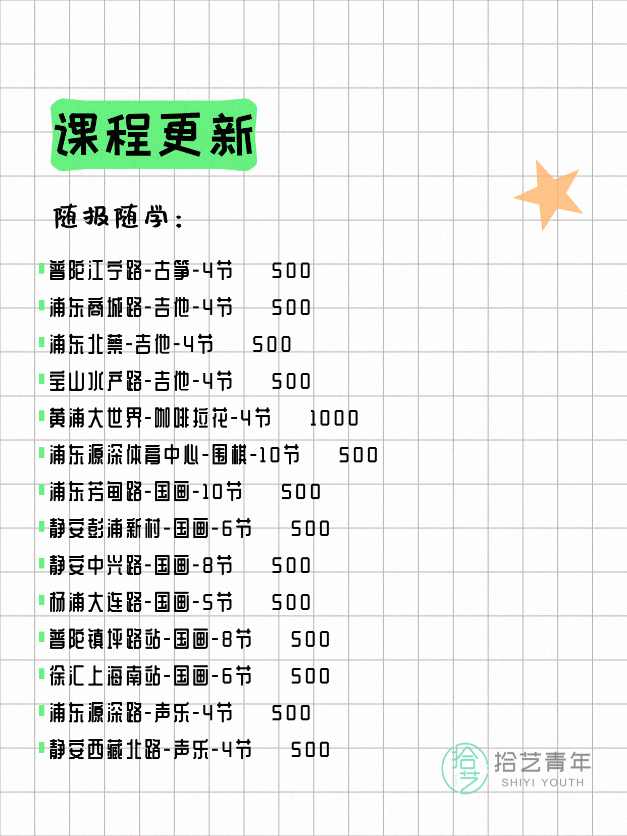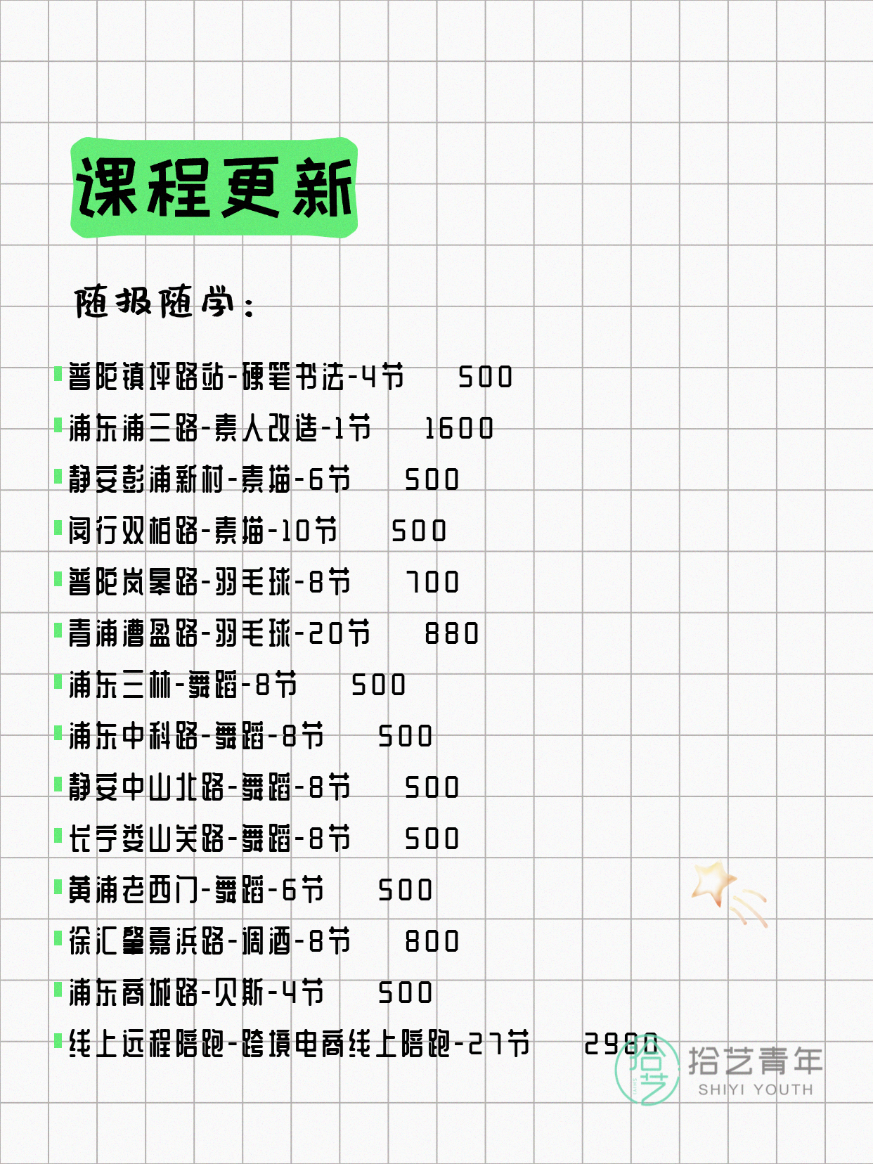 💡 提示:以上课程信息来自拾艺青年小程序,课程可能随报名动态变化,具体以小程序实时信息为准。