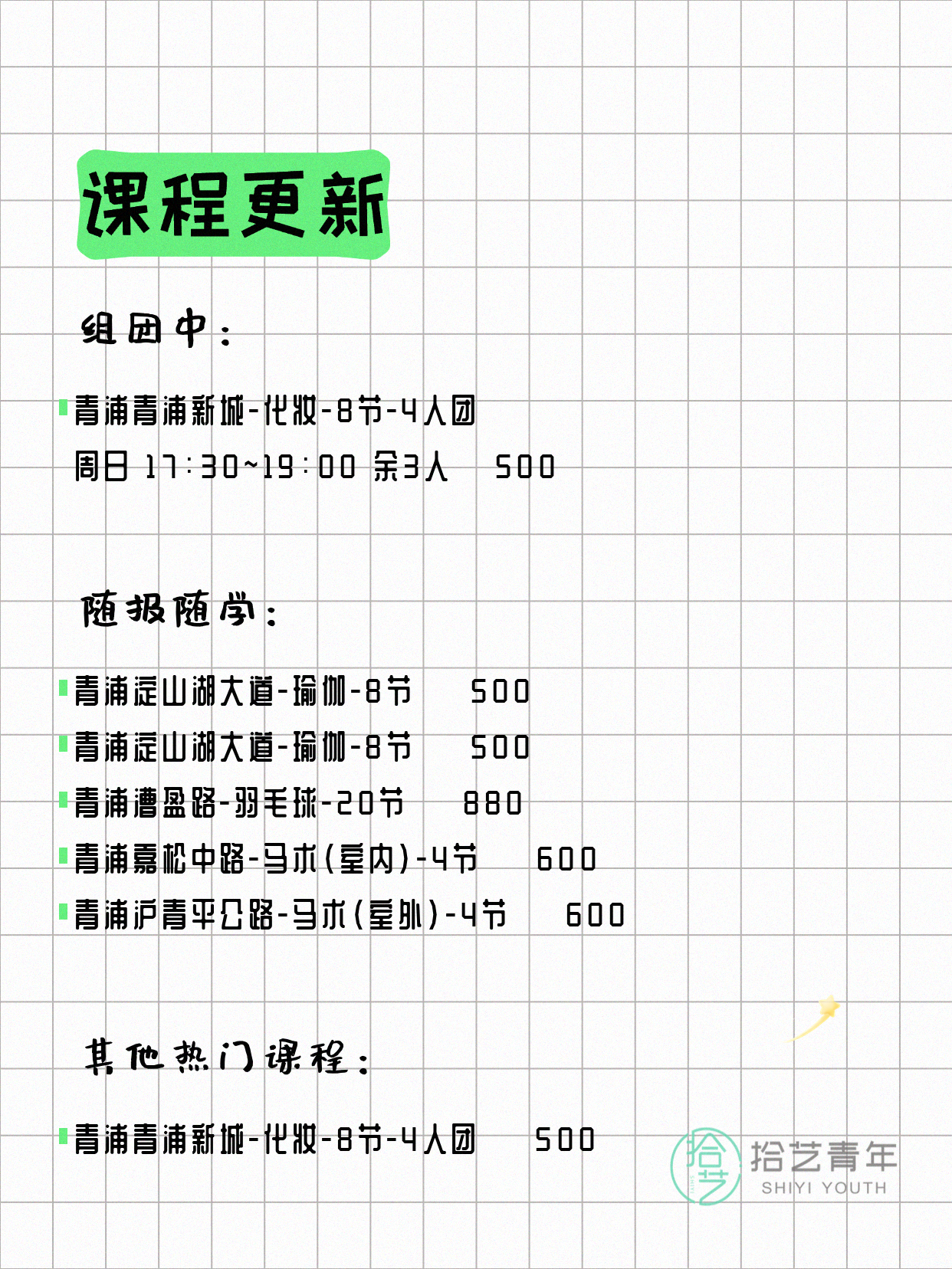 💡 提示:以上课程信息来自拾艺青年小程序,课程可能随报名动态变化,具体以小程序实时信息为准。
