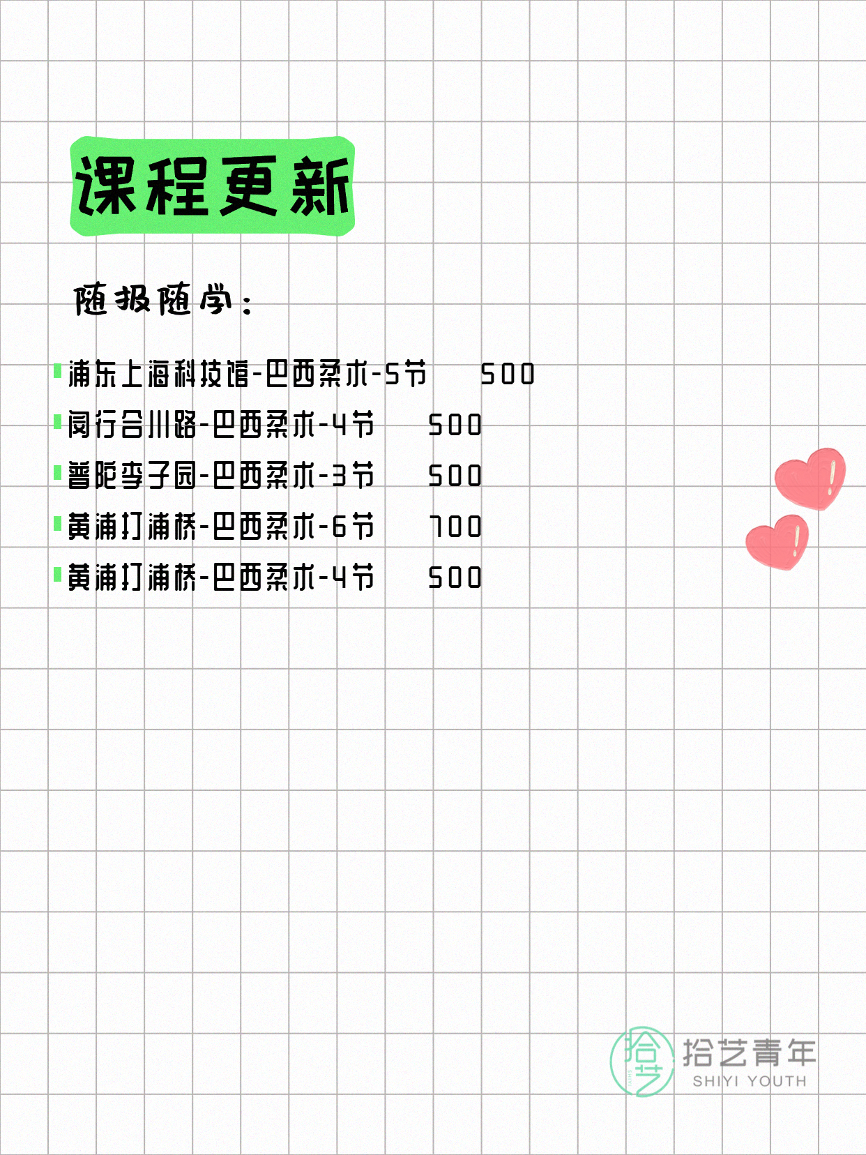 💡 提示:以上课程信息来自拾艺青年小程序,课程可能随报名动态变化,具体以小程序实时信息为准。