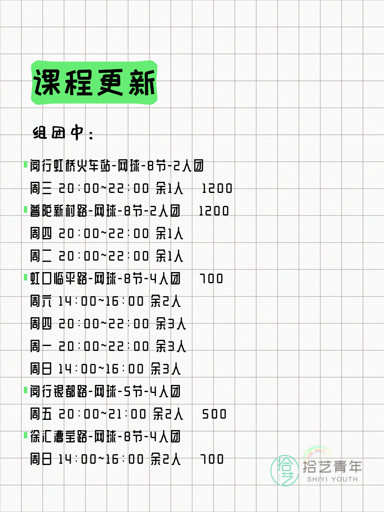 🔥 网球-闵行虹桥火车站-8节-2人团 💰1200
