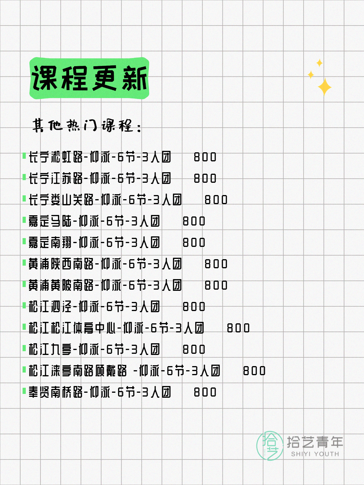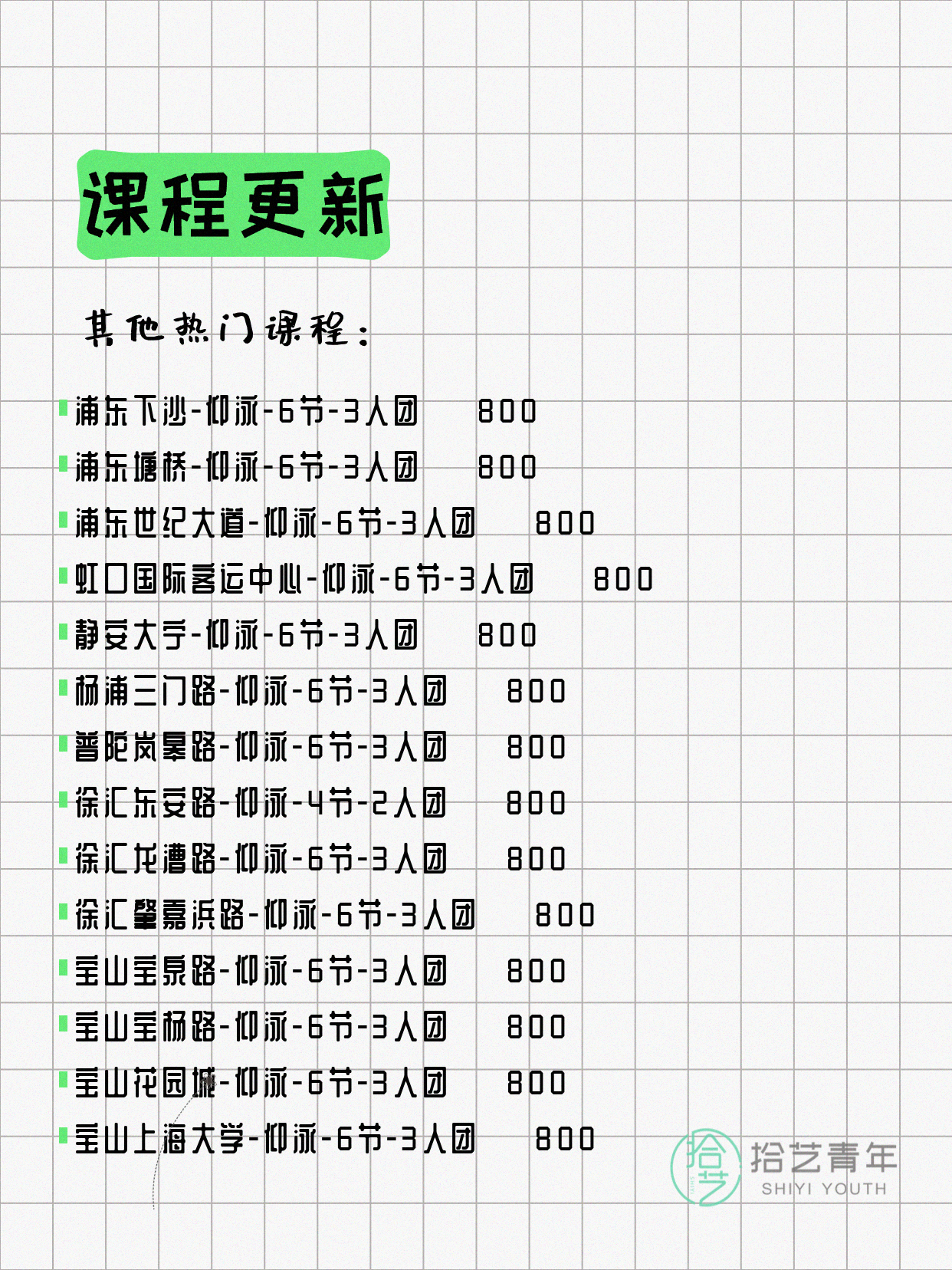 资讯>综合>正文4月12日上海仰泳课程合集拾艺青年2026-04-121 / 3【热门课程推荐】⭐ 仰泳-杨浦三门路-6节-3人团 💰800⭐ 仰泳-松江泗泾-6节-3人团 💰800⭐ 仰泳-长宁淞虹路-6节-3人团 💰800⭐ 仰泳-徐汇肇嘉浜路-6节-3人团 💰800⭐ 仰泳-长宁娄山关路-6节-3人团 💰800详见小程序了解详细信息,欢迎报名咨询。💡 提示:以上课程信息来自拾艺青年小程序,课程可能随报名动态变化,具体以小程序实时信息为准。👉 微信小程序链接:#小程序://拾艺青年/WmfwH22mnQUxZwb