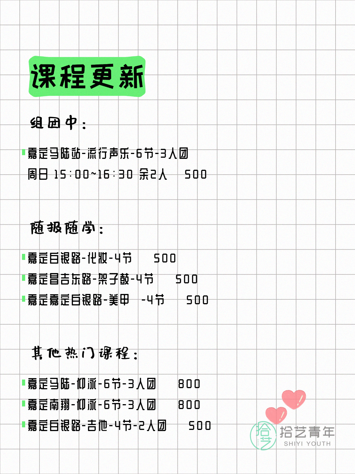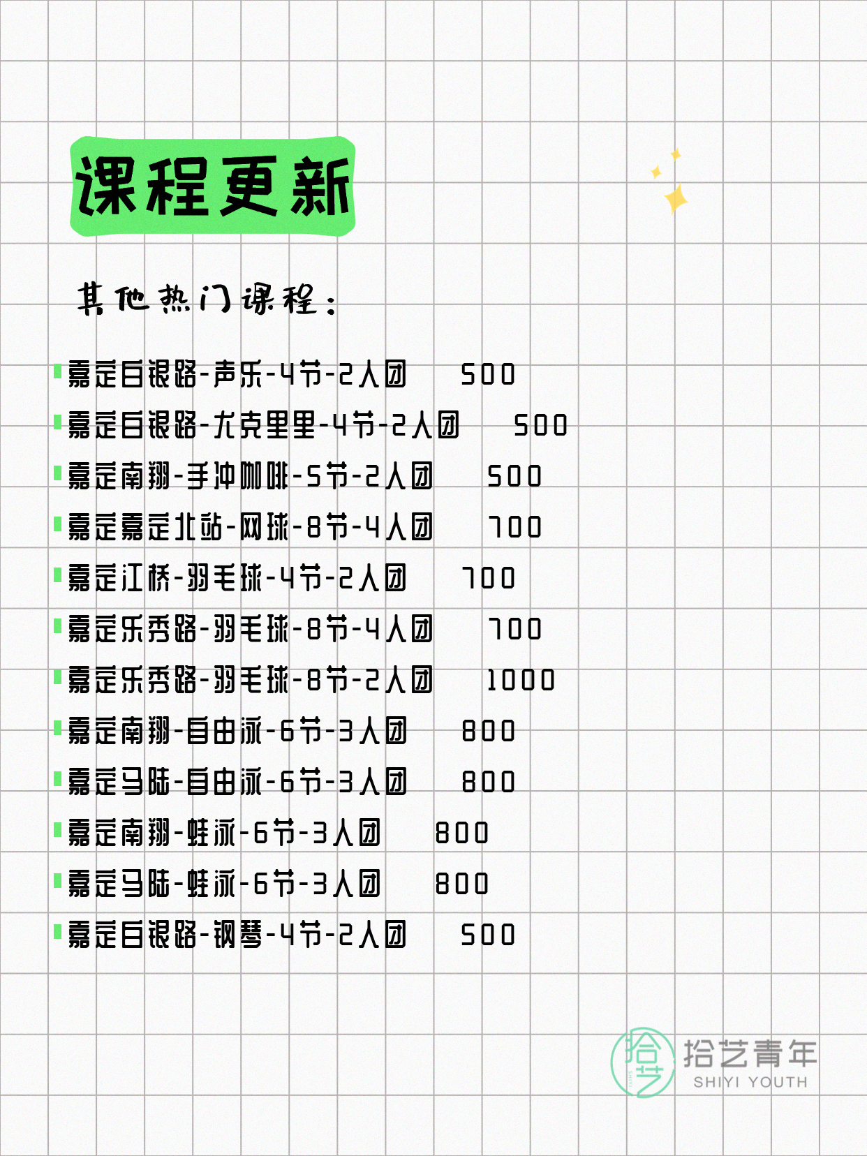 💡 提示:以上课程信息来自拾艺青年小程序,课程可能随报名动态变化,具体以小程序实时信息为准。