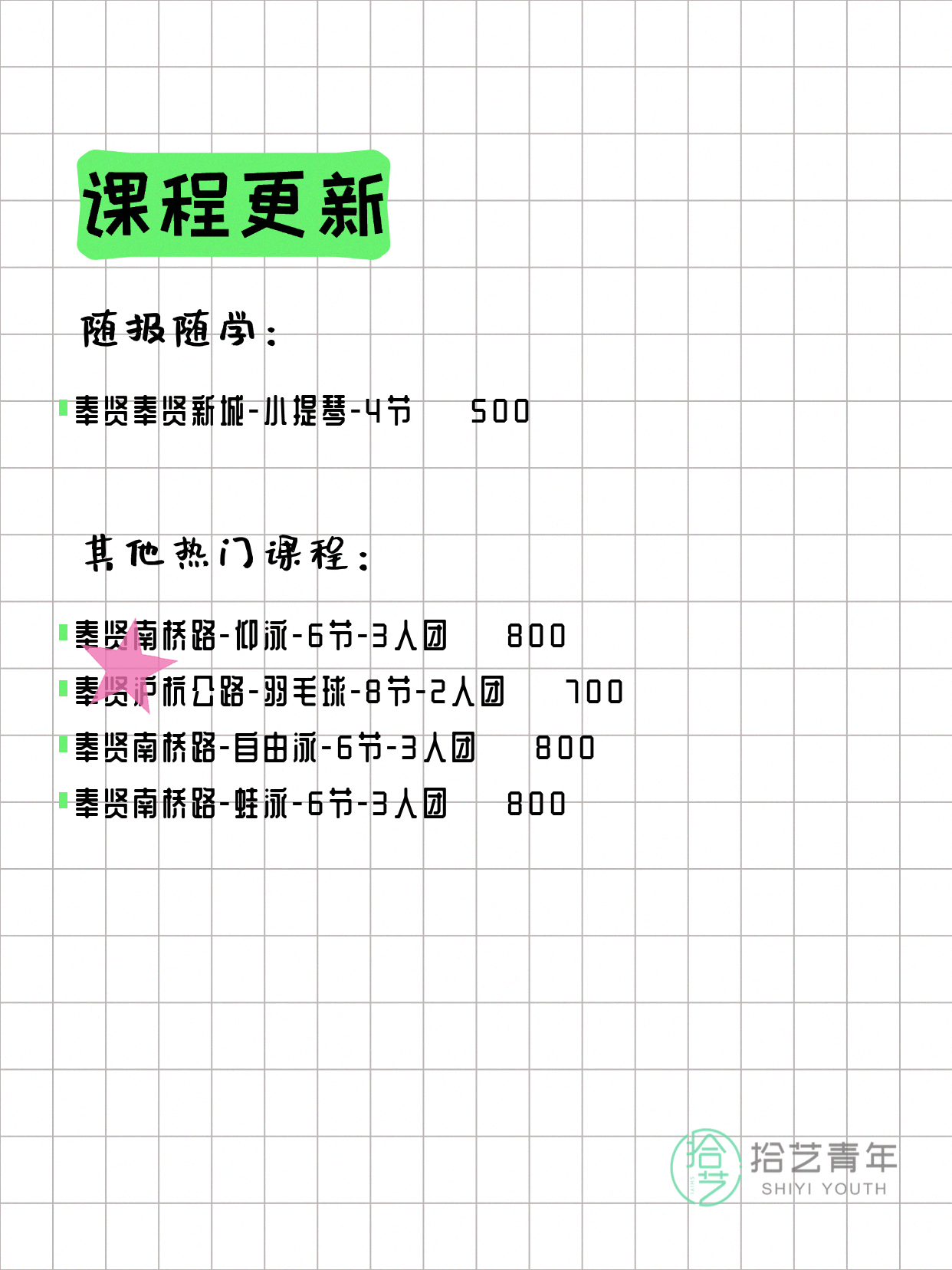 💡 提示:以上课程信息来自拾艺青年小程序,课程可能随报名动态变化,具体以小程序实时信息为准。