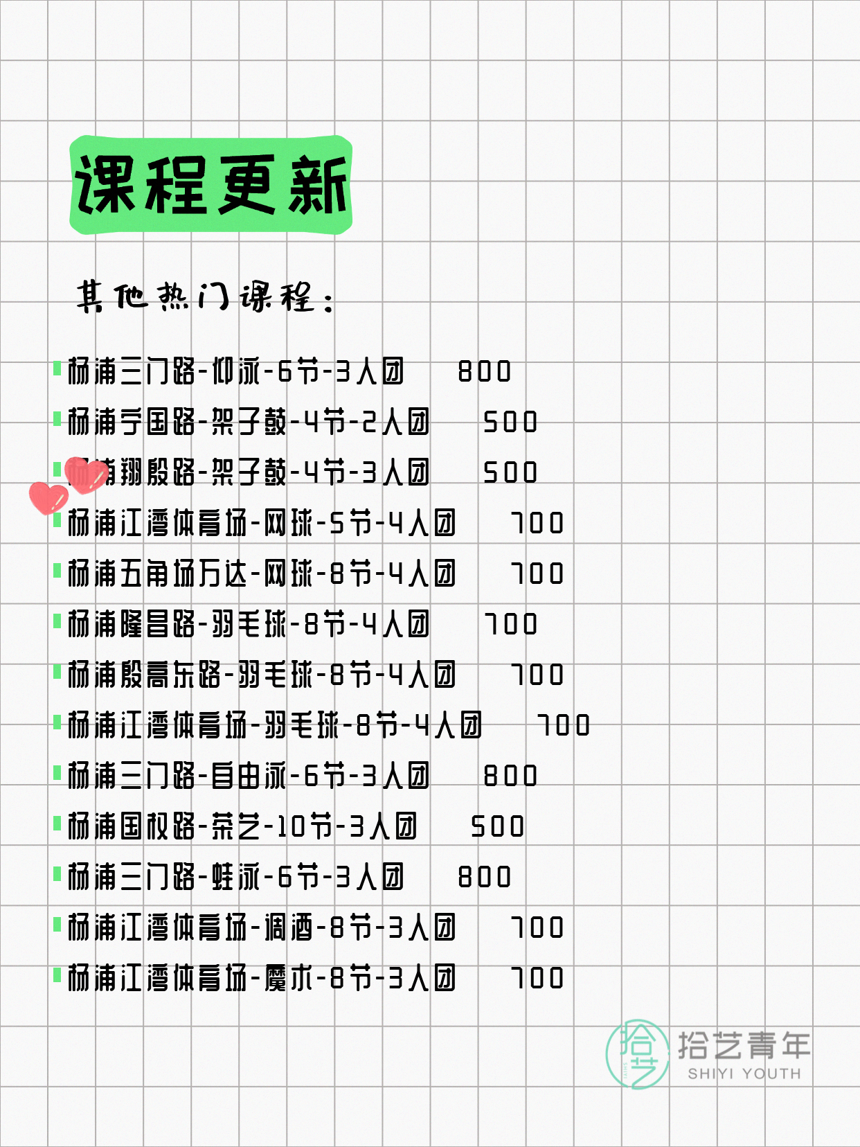 💡 提示:以上课程信息来自拾艺青年小程序,课程可能随报名动态变化,具体以小程序实时信息为准。