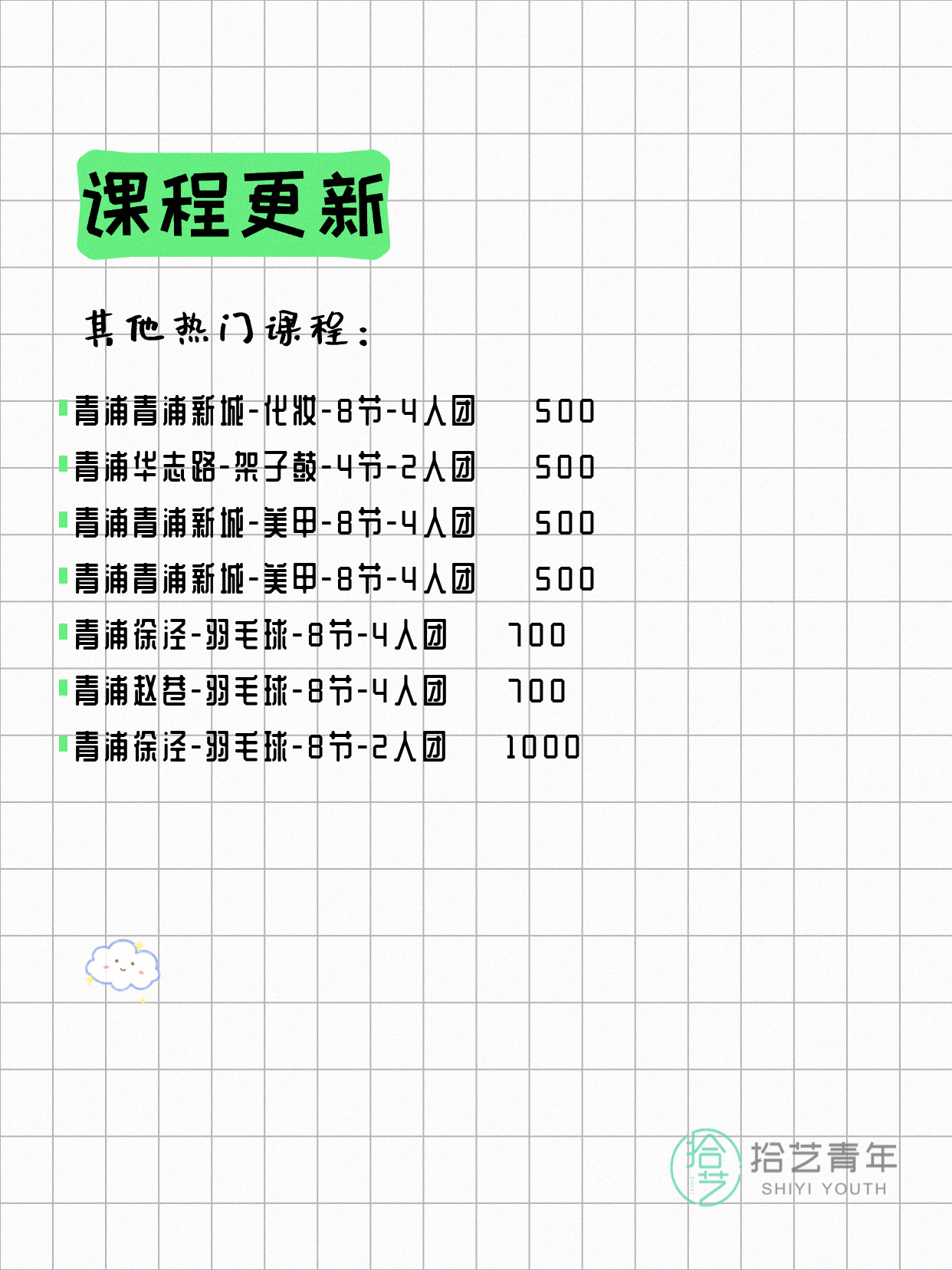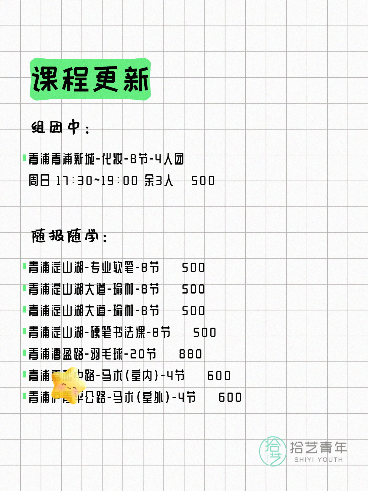 💡 提示:以上课程信息来自拾艺青年小程序,课程可能随报名动态变化,具体以小程序实时信息为准。
