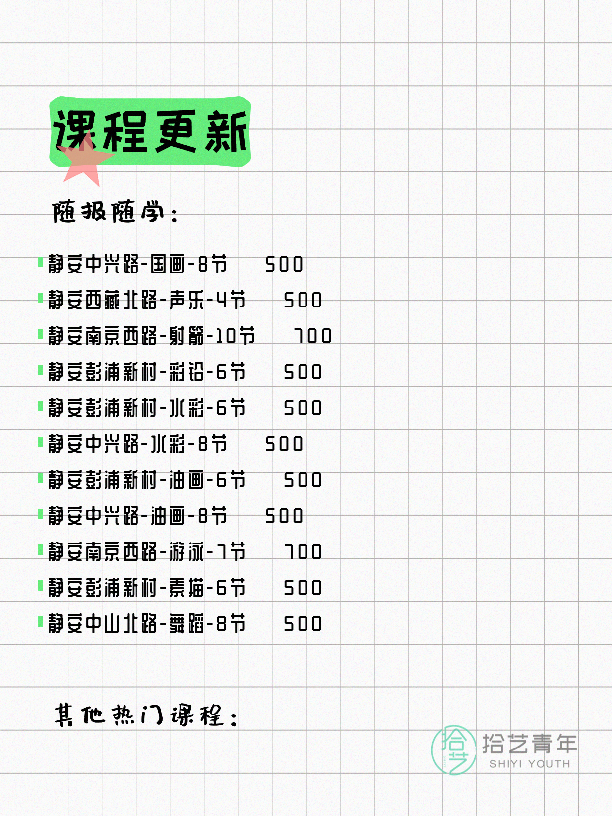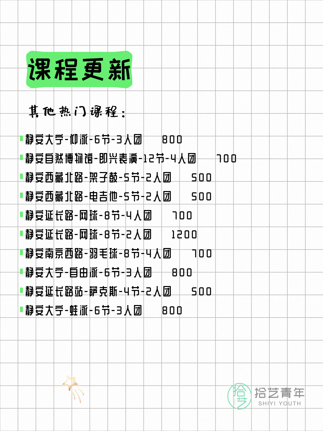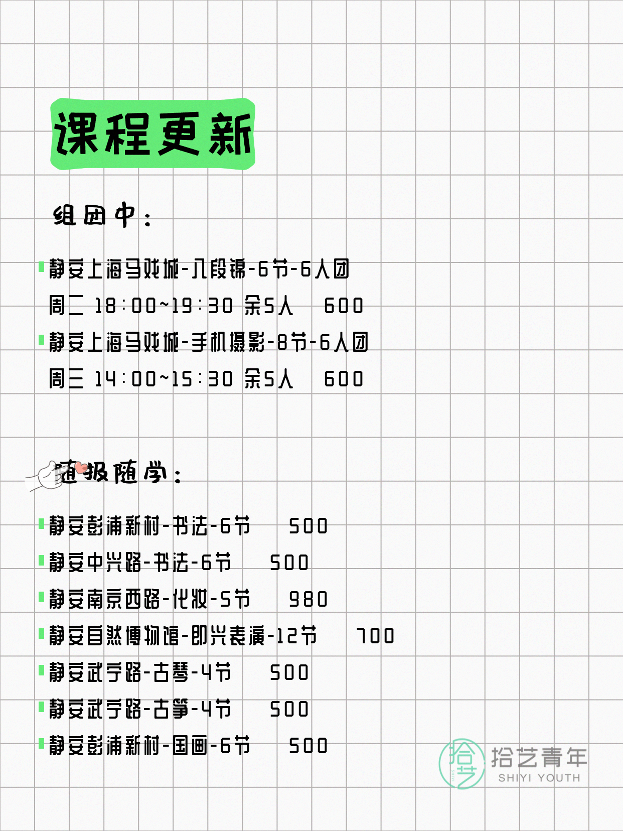 💡 提示:以上课程信息来自拾艺青年小程序,课程可能随报名动态变化,具体以小程序实时信息为准。