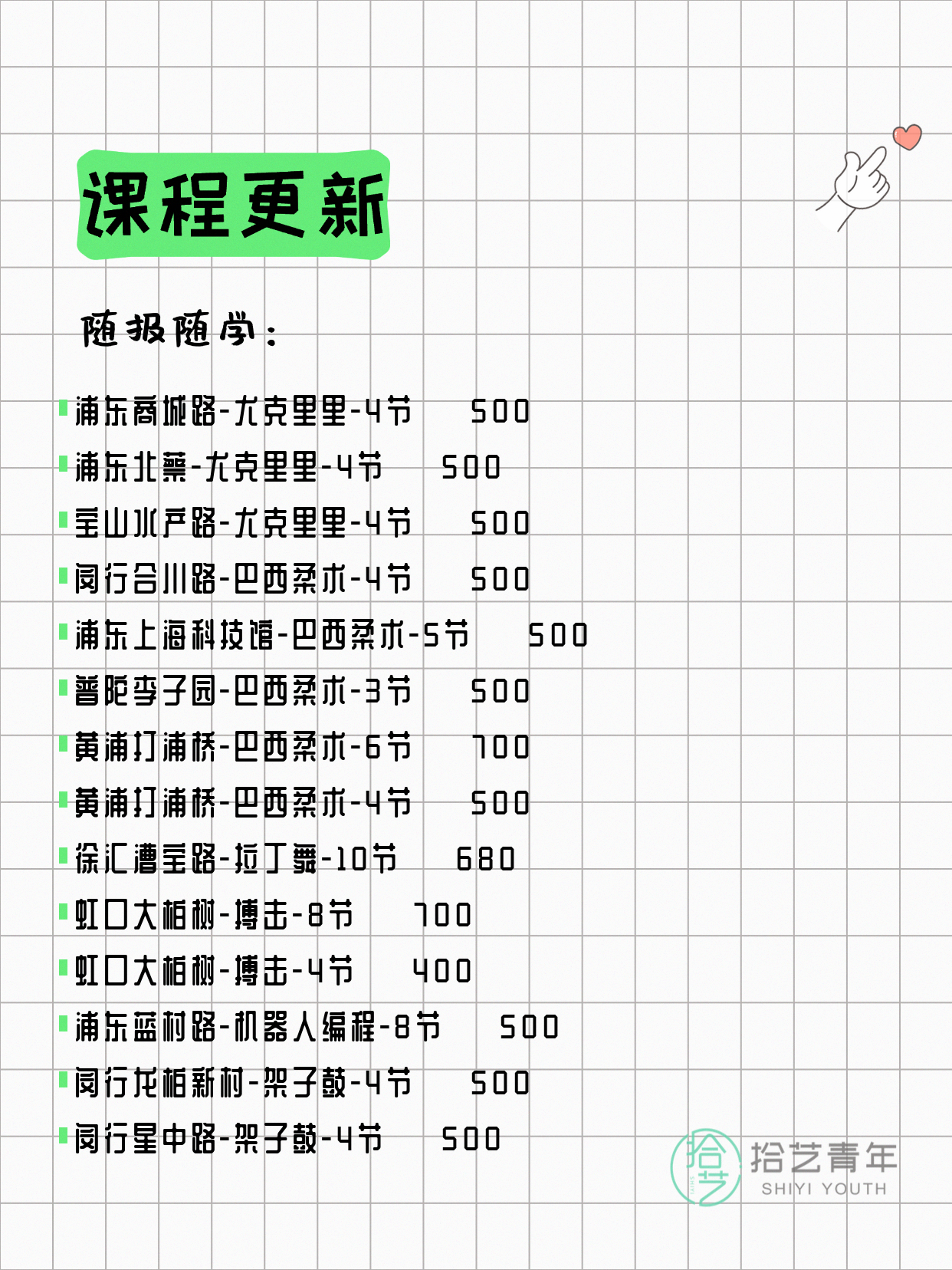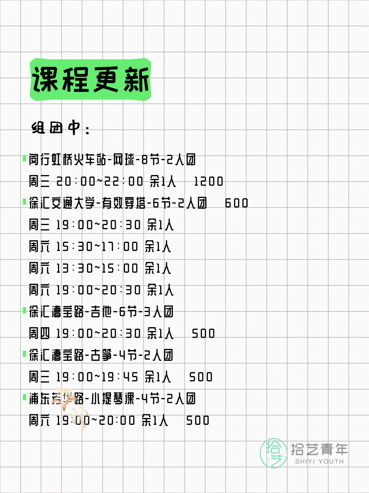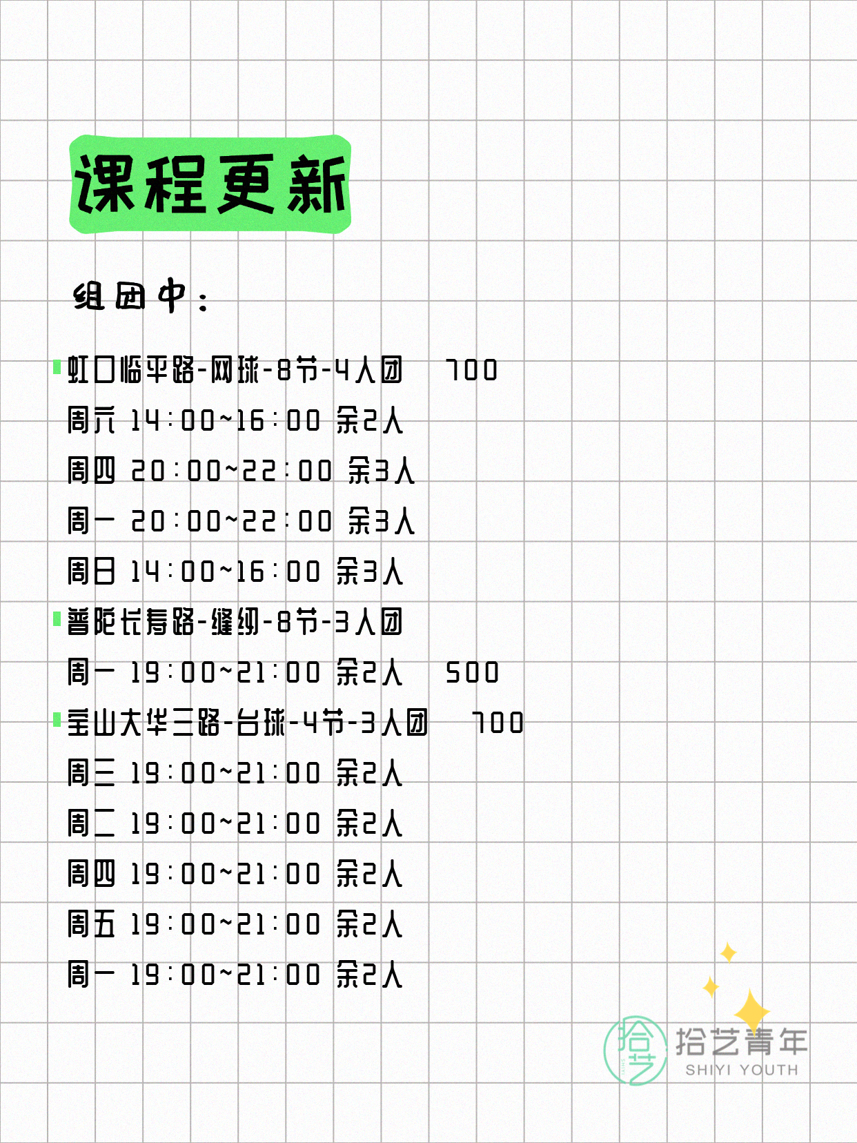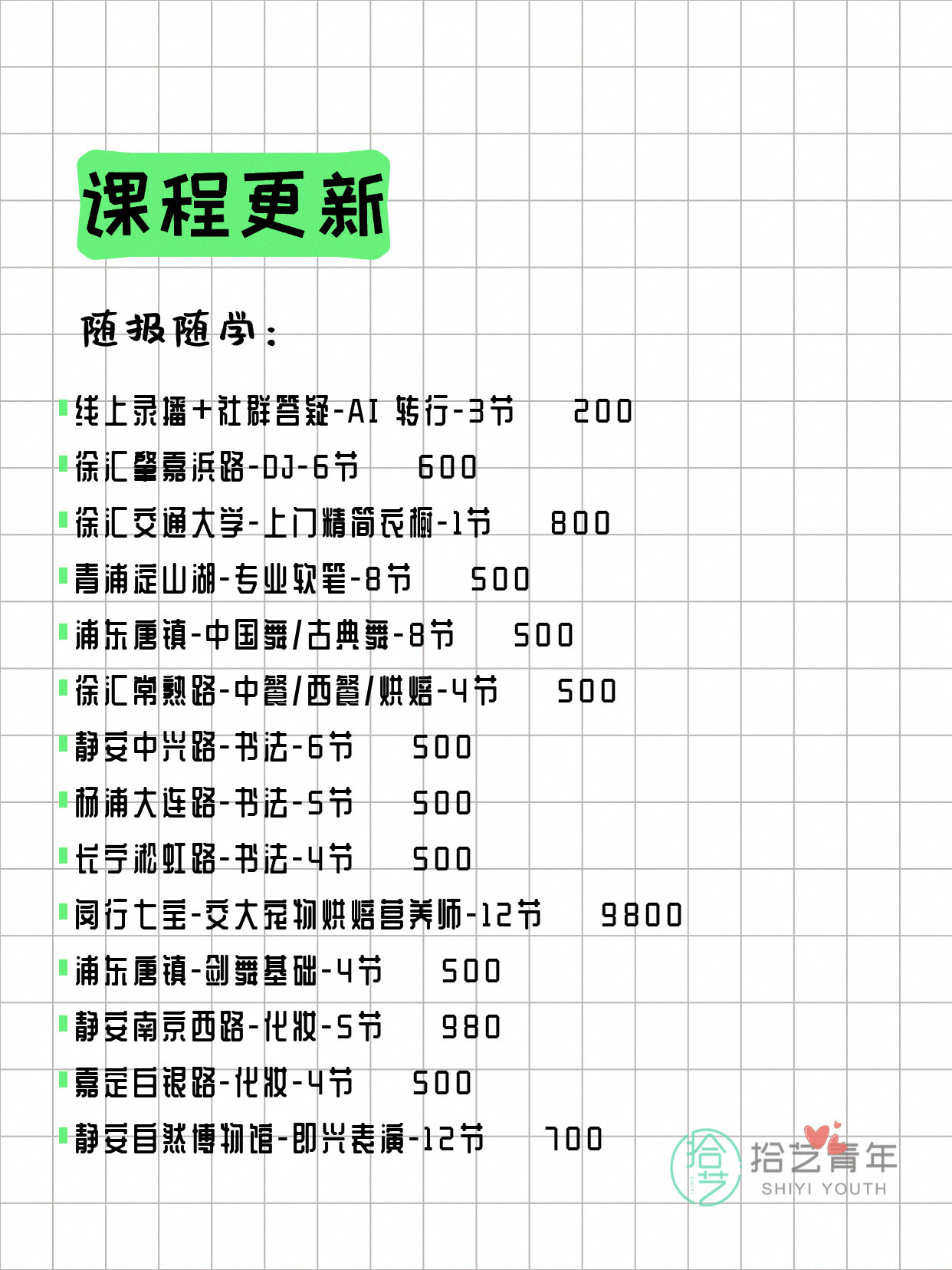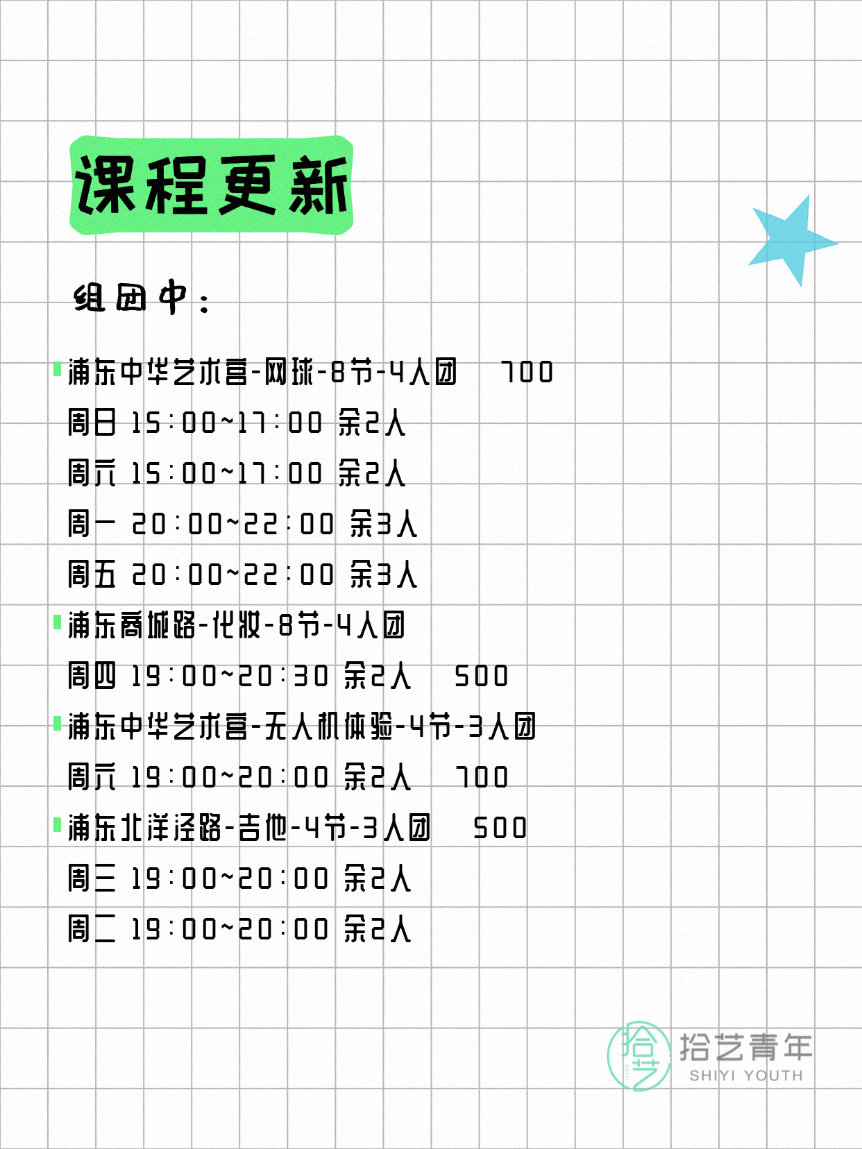 资讯>综合>正文4月13日上海夜校课程合集拾艺青年2026-04-131 / 17📊 本期课程概况• 总课程数:412门• 组团中课程:72门• 覆盖区域:15个区详见图片,欢迎报名咨询。💡 提示:以上课程信息来自拾艺青年小程序,课程可能随报名动态变化,具体以小程序实时信息为准。👉 微信小程序链接:#小程序://拾艺青年/WmfwH22mnQUxZwb