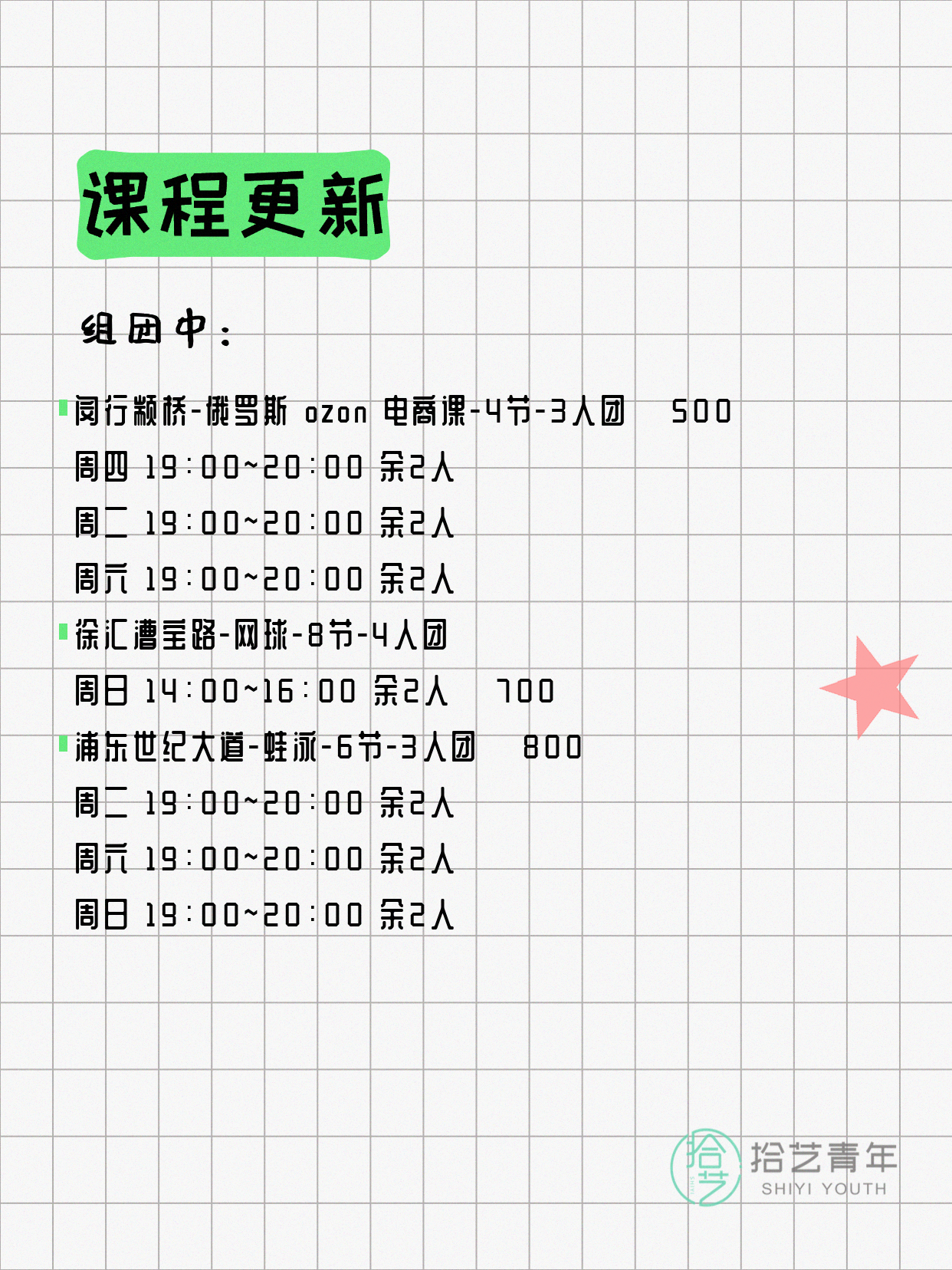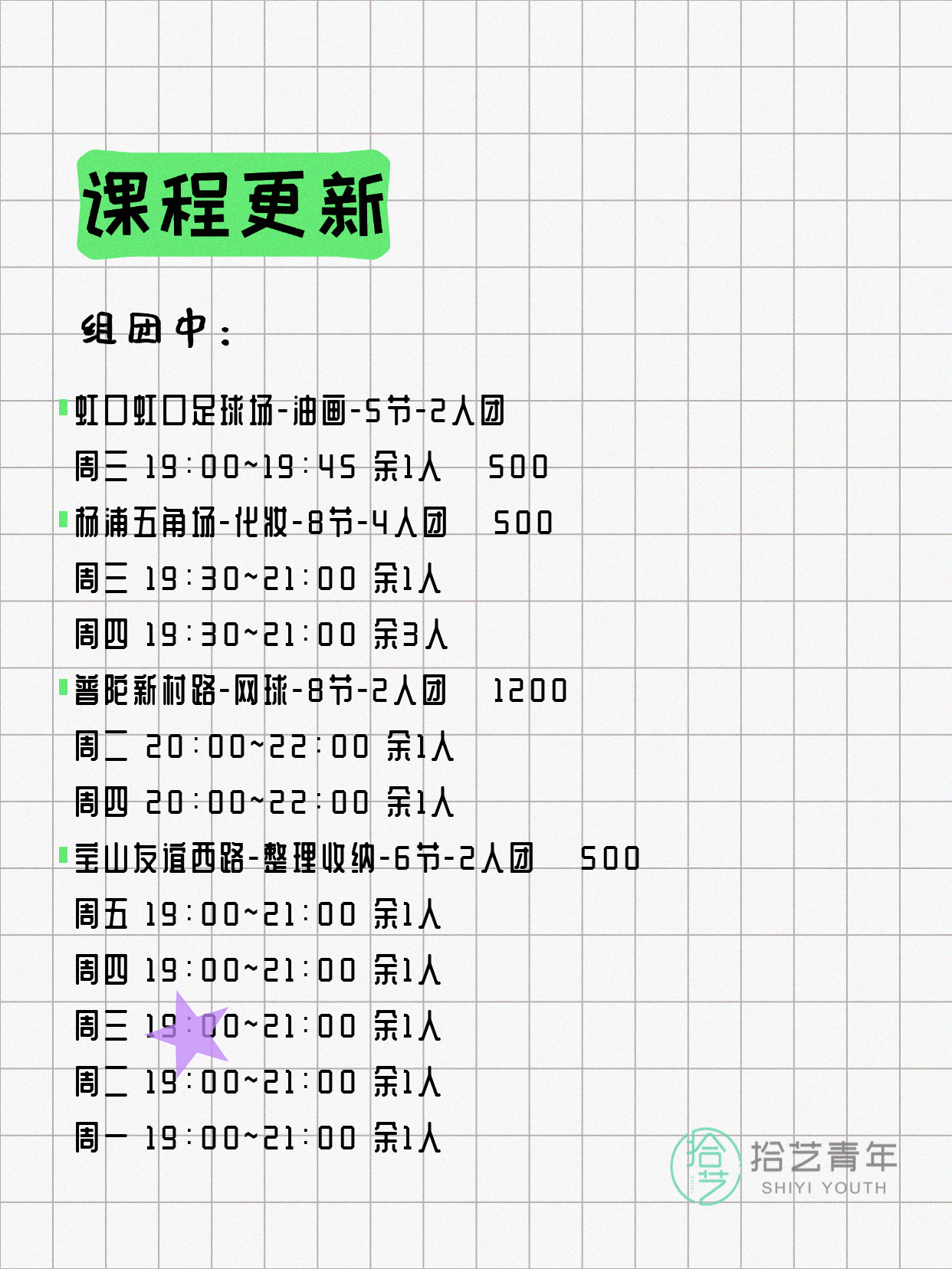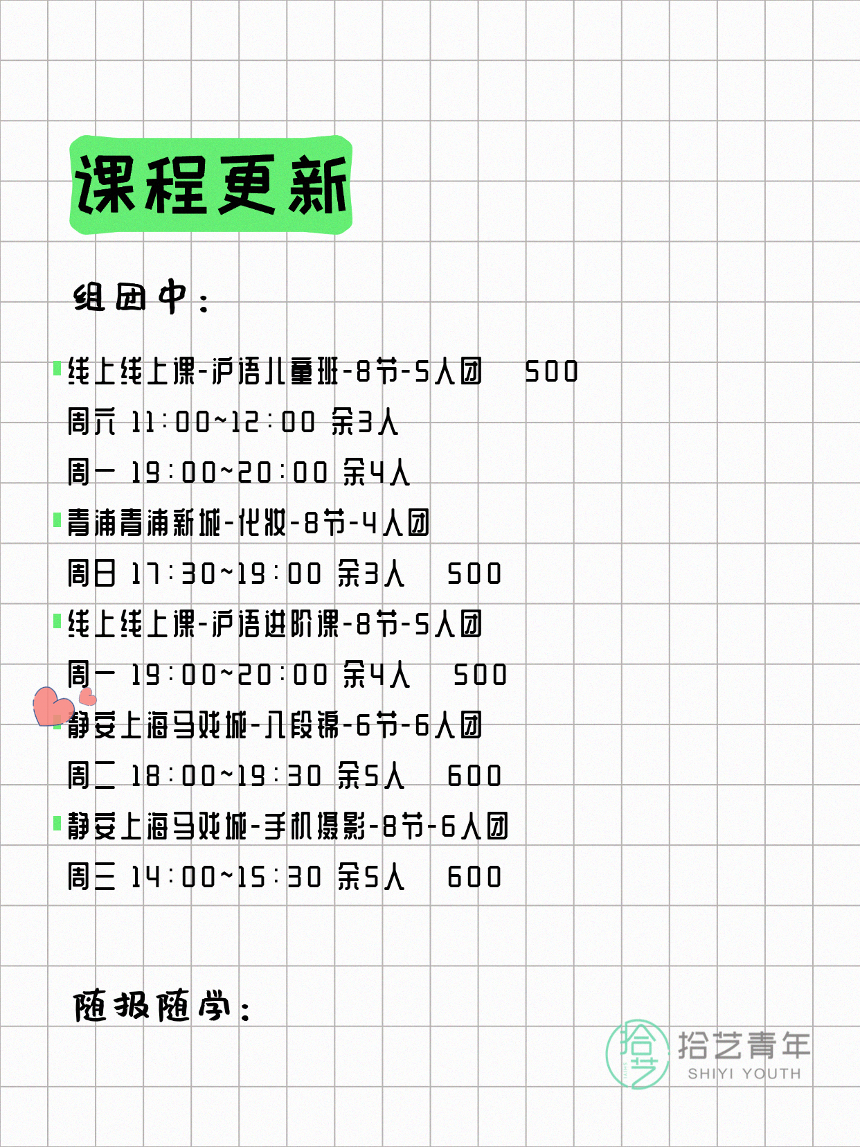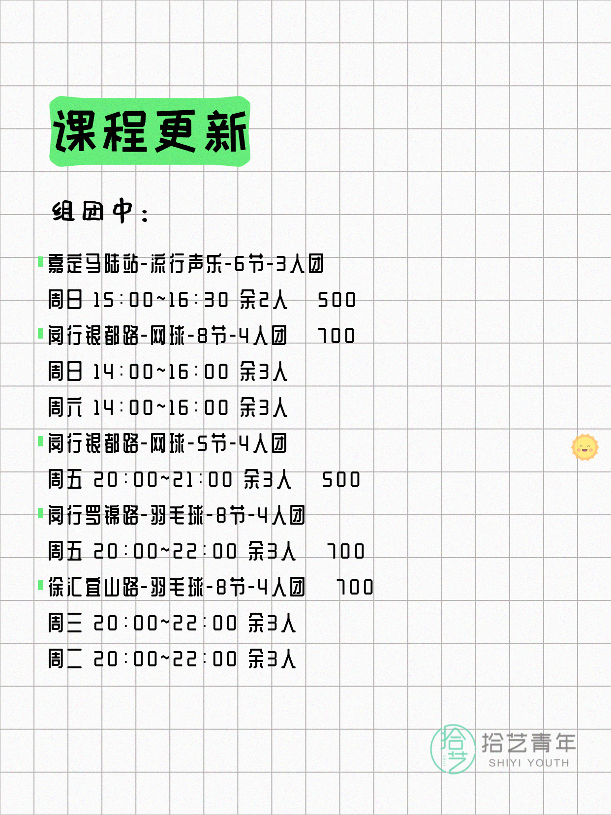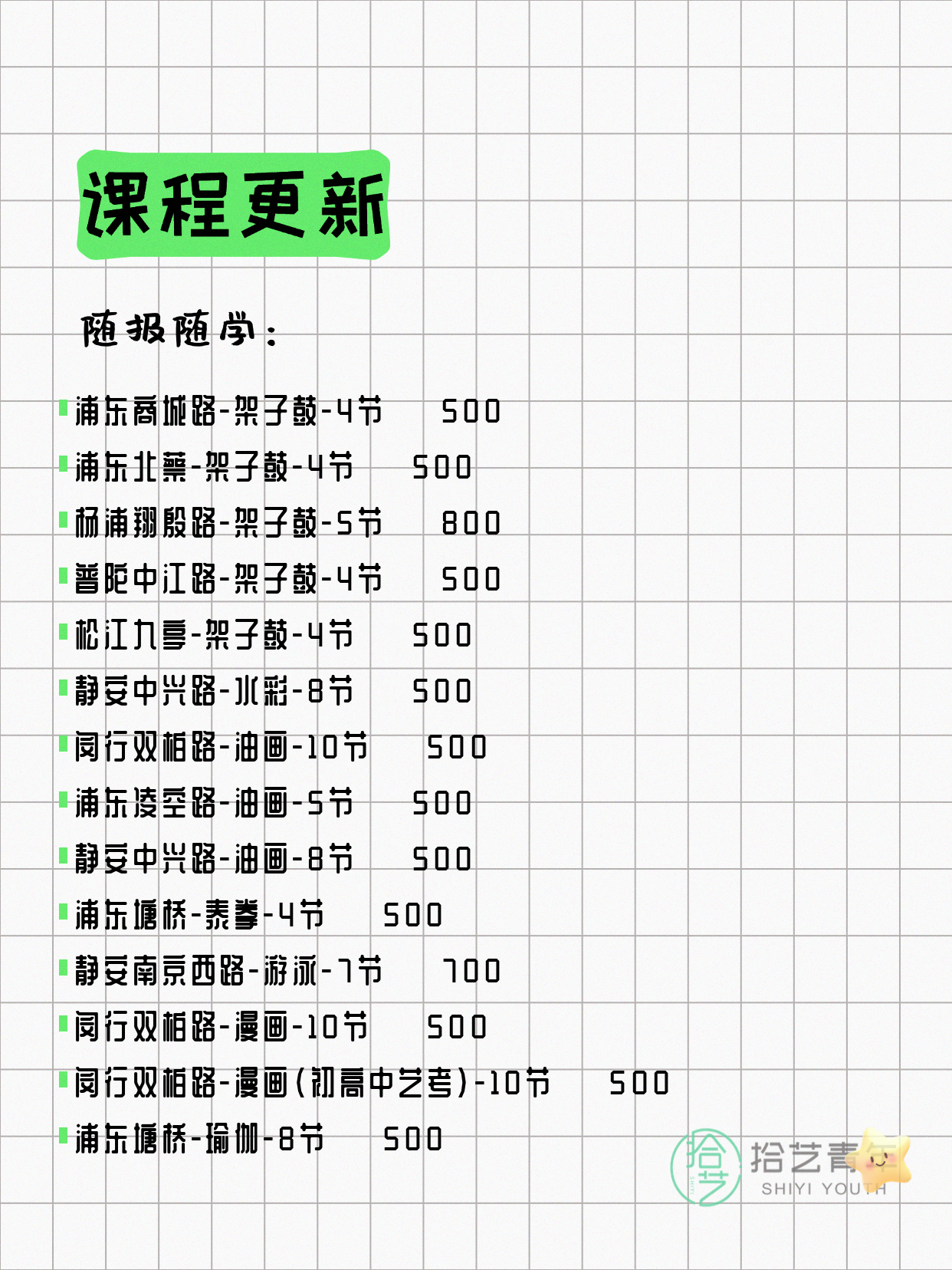 资讯>综合>正文4月13日上海夜校课程合集拾艺青年2026-04-131 / 17📊 本期课程概况• 总课程数:412门• 组团中课程:72门• 覆盖区域:15个区详见图片,欢迎报名咨询。💡 提示:以上课程信息来自拾艺青年小程序,课程可能随报名动态变化,具体以小程序实时信息为准。👉 微信小程序链接:#小程序://拾艺青年/WmfwH22mnQUxZwb