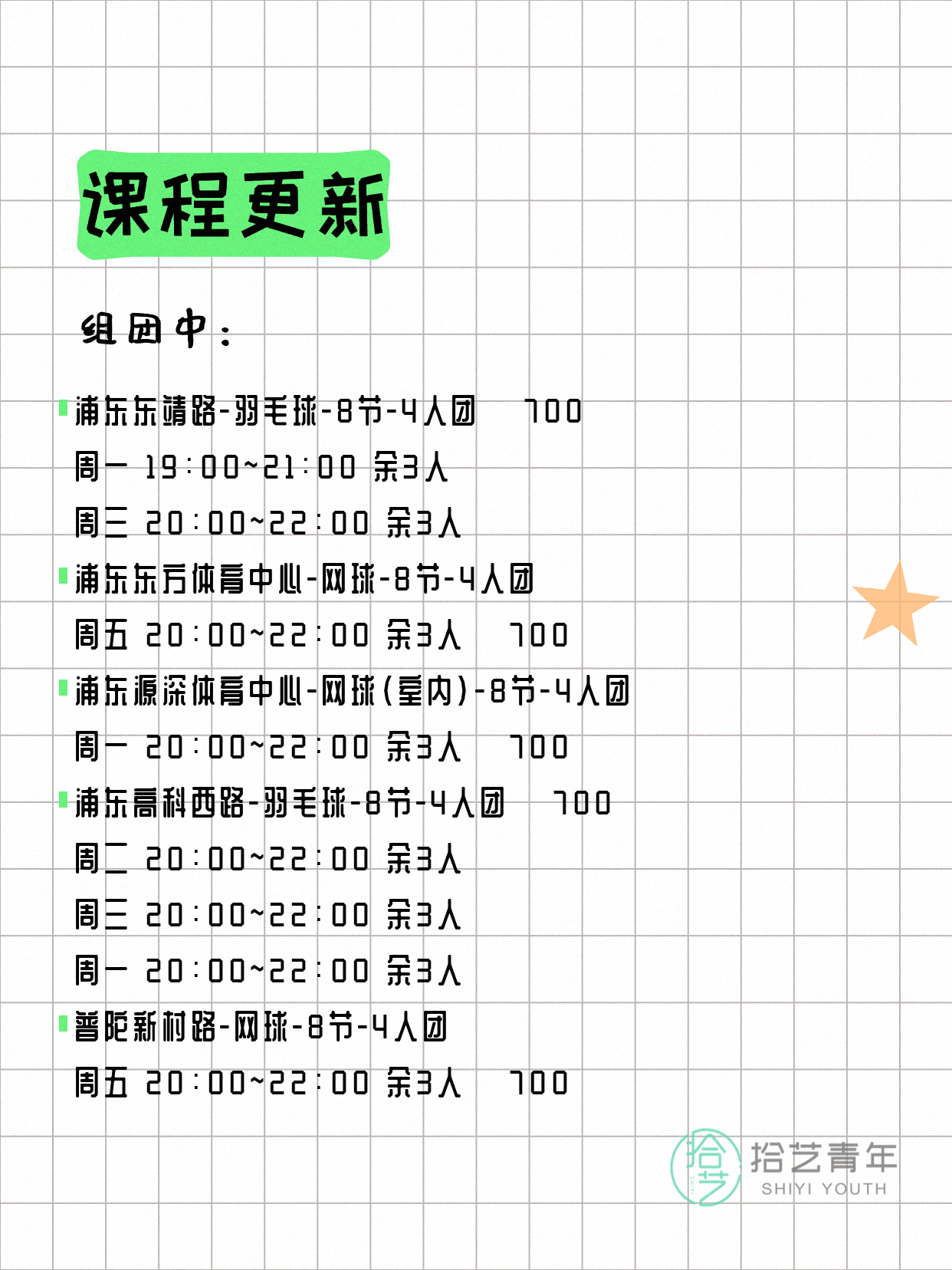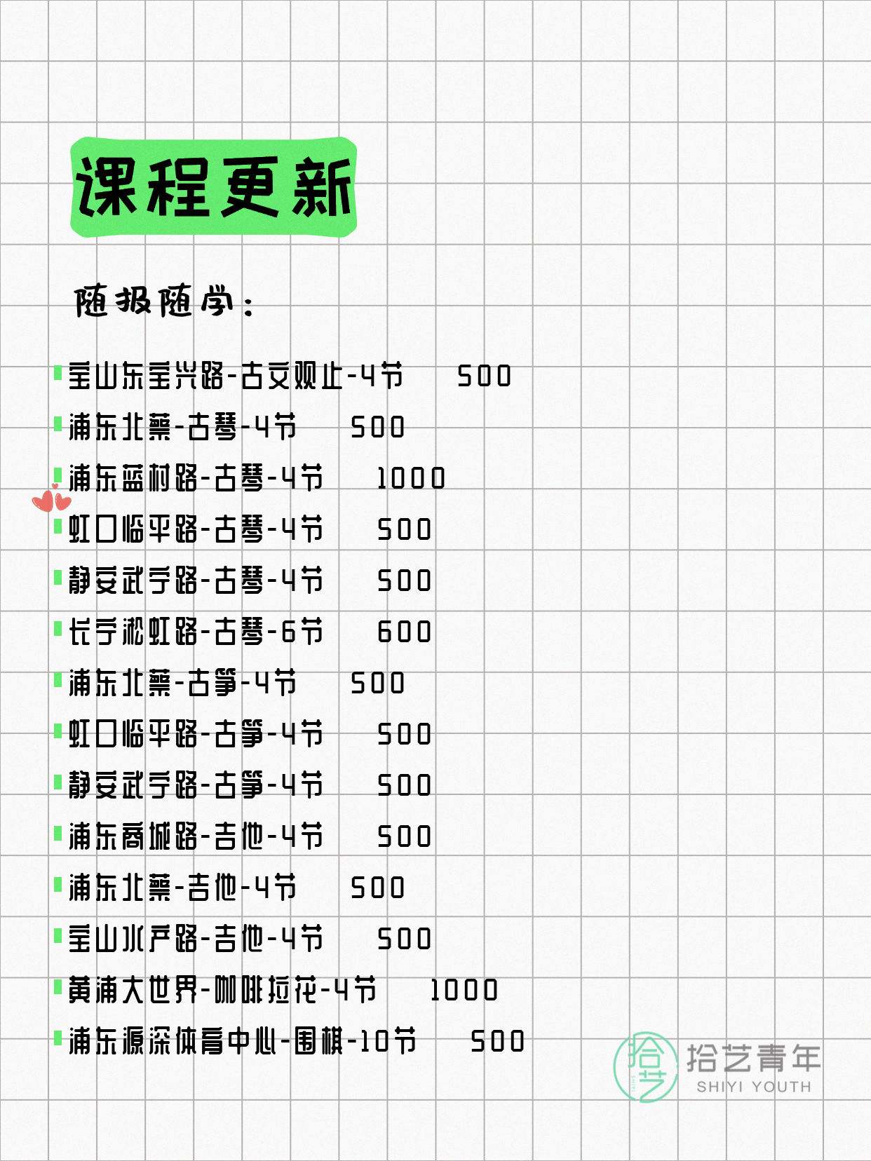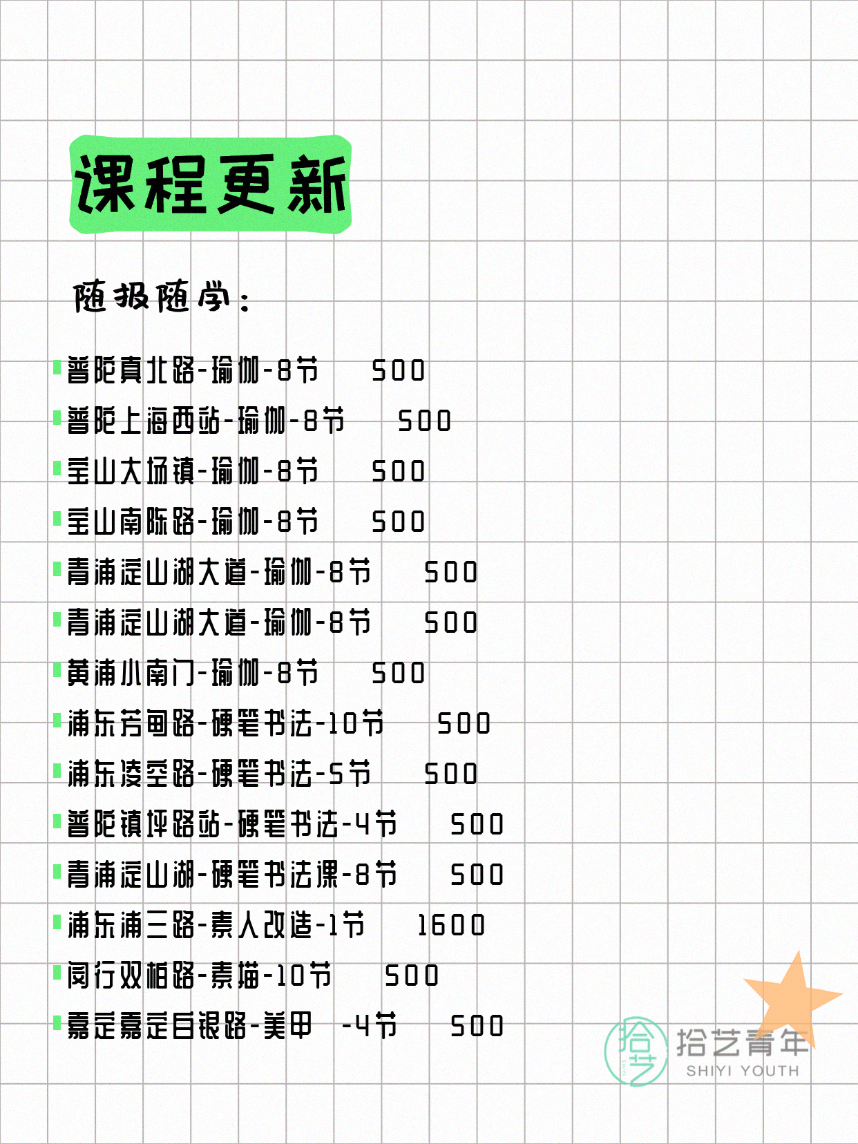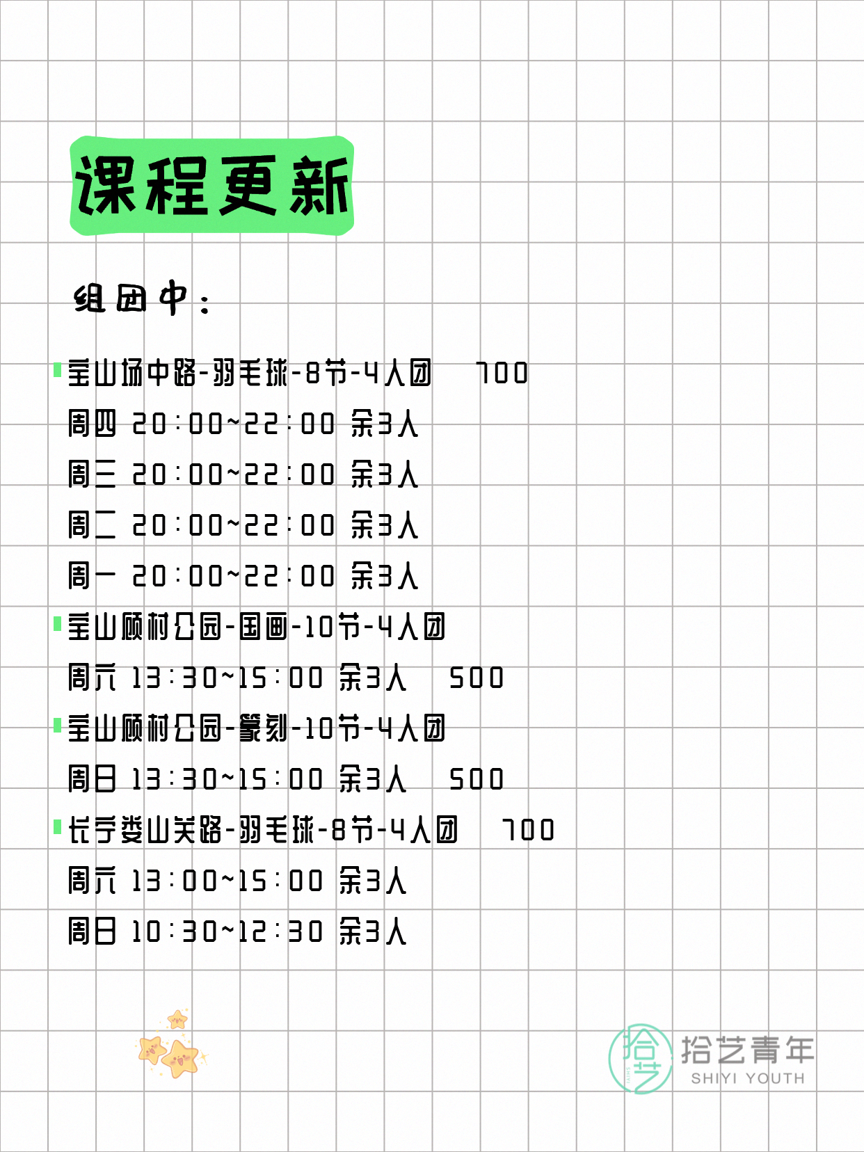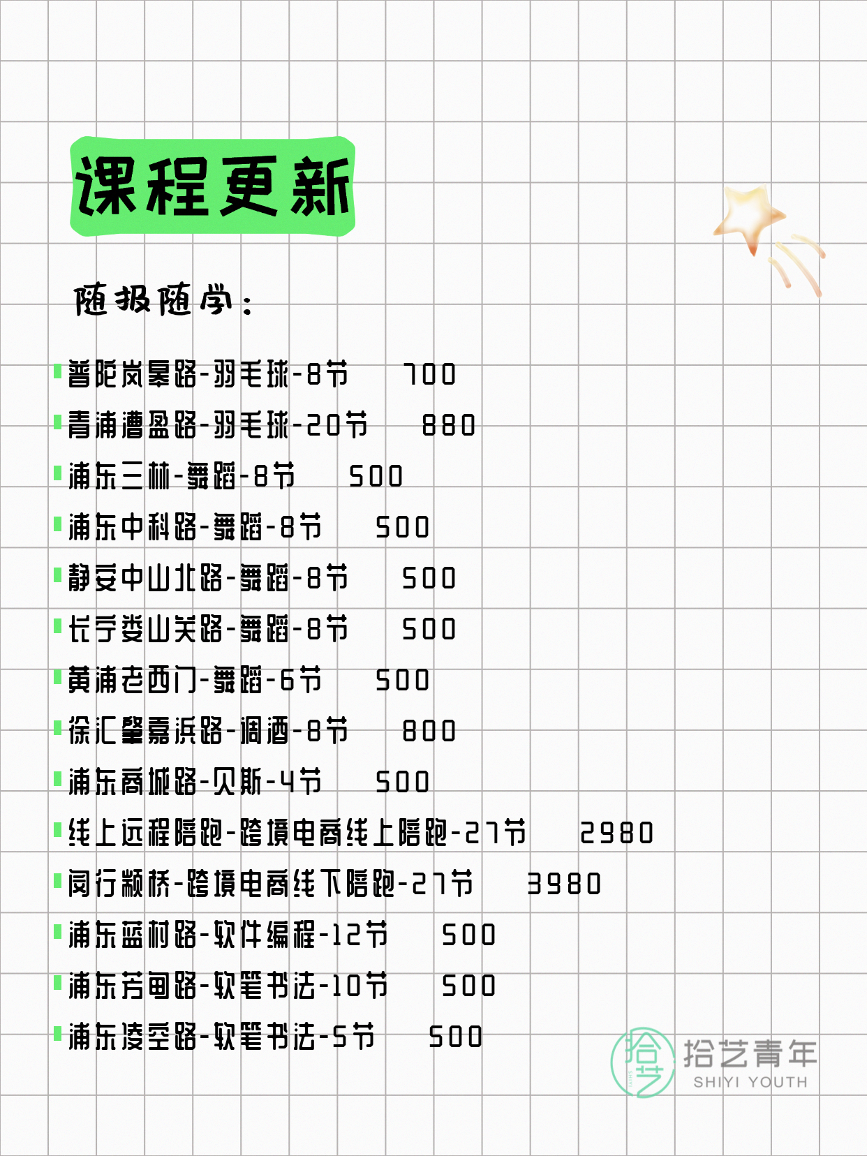 资讯>综合>正文4月13日上海夜校课程合集拾艺青年2026-04-131 / 17📊 本期课程概况• 总课程数:412门• 组团中课程:72门• 覆盖区域:15个区详见图片,欢迎报名咨询。💡 提示:以上课程信息来自拾艺青年小程序,课程可能随报名动态变化,具体以小程序实时信息为准。👉 微信小程序链接:#小程序://拾艺青年/WmfwH22mnQUxZwb