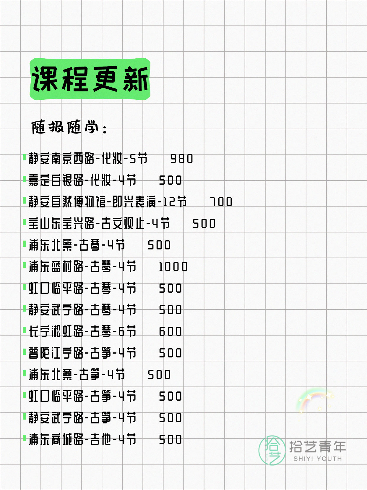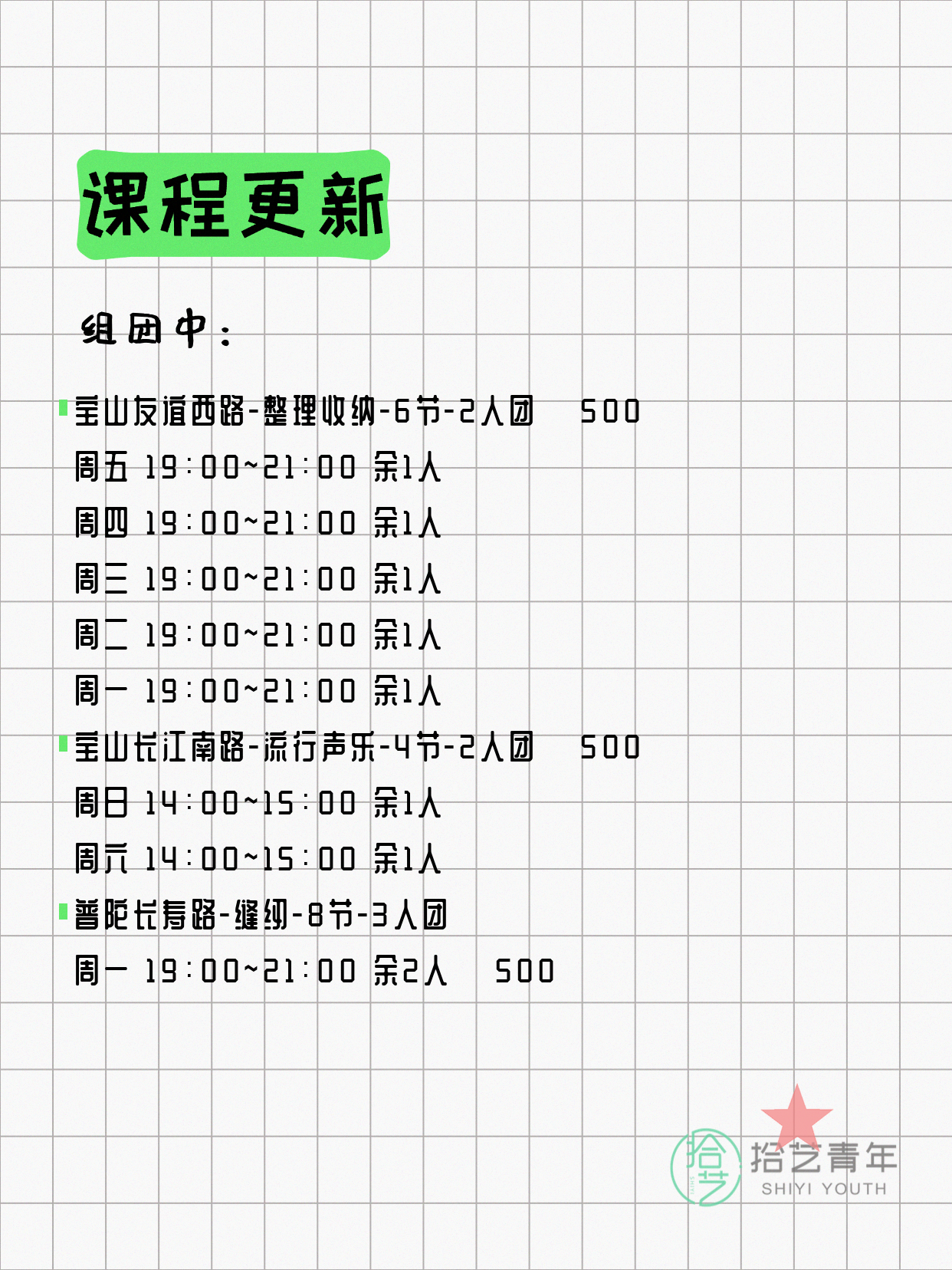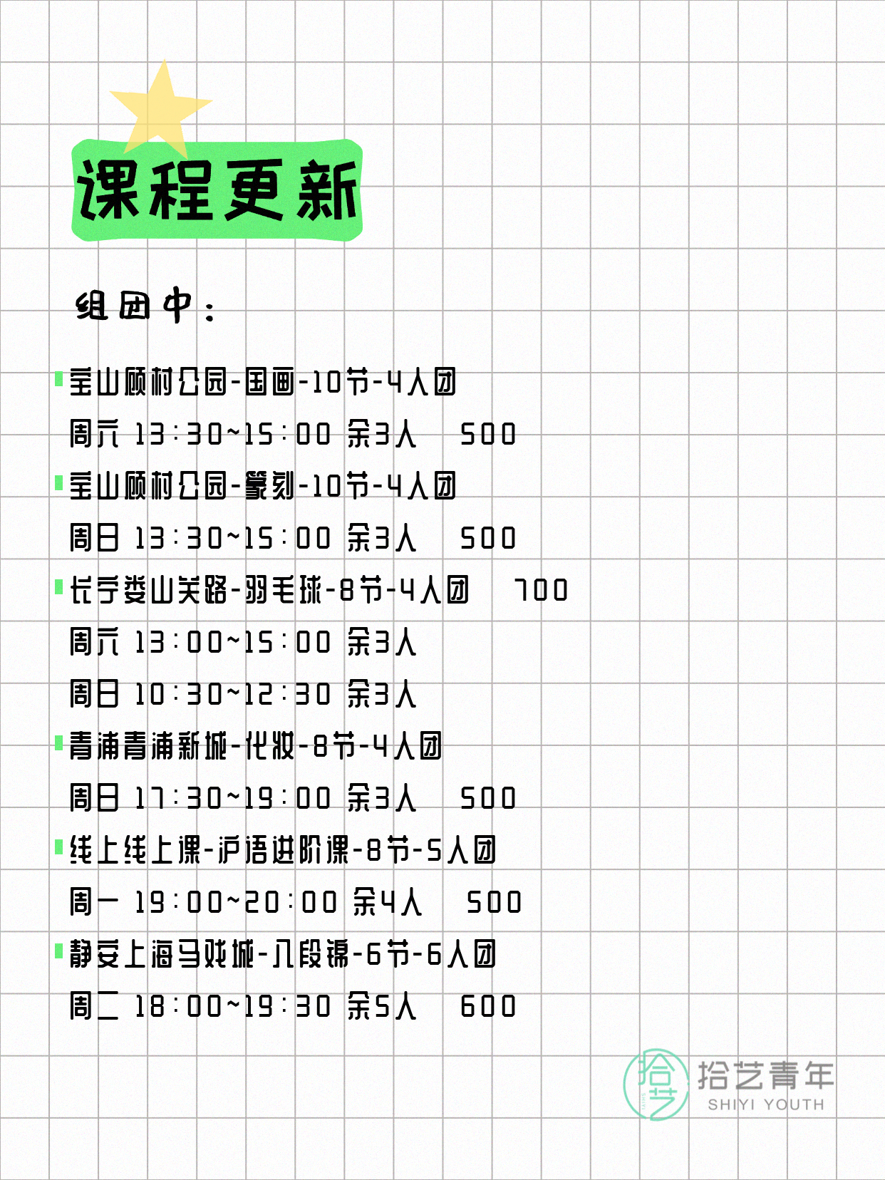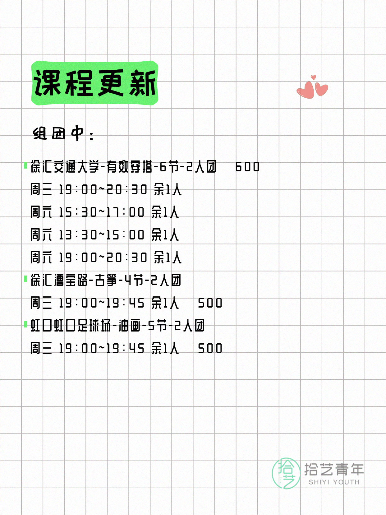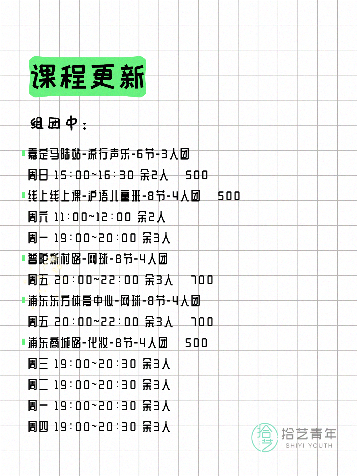 资讯>综合>正文4月15日上海夜校课程合集拾艺青年2026-04-151 / 17📊 本期课程概况• 总课程数:447门• 组团中课程:75门• 覆盖区域:15个区详见图片,欢迎报名咨询。💡 提示:以上课程信息来自拾艺青年小程序,课程可能随报名动态变化,具体以小程序实时信息为准。👉 微信小程序链接:#小程序://拾艺青年/WmfwH22mnQUxZwb