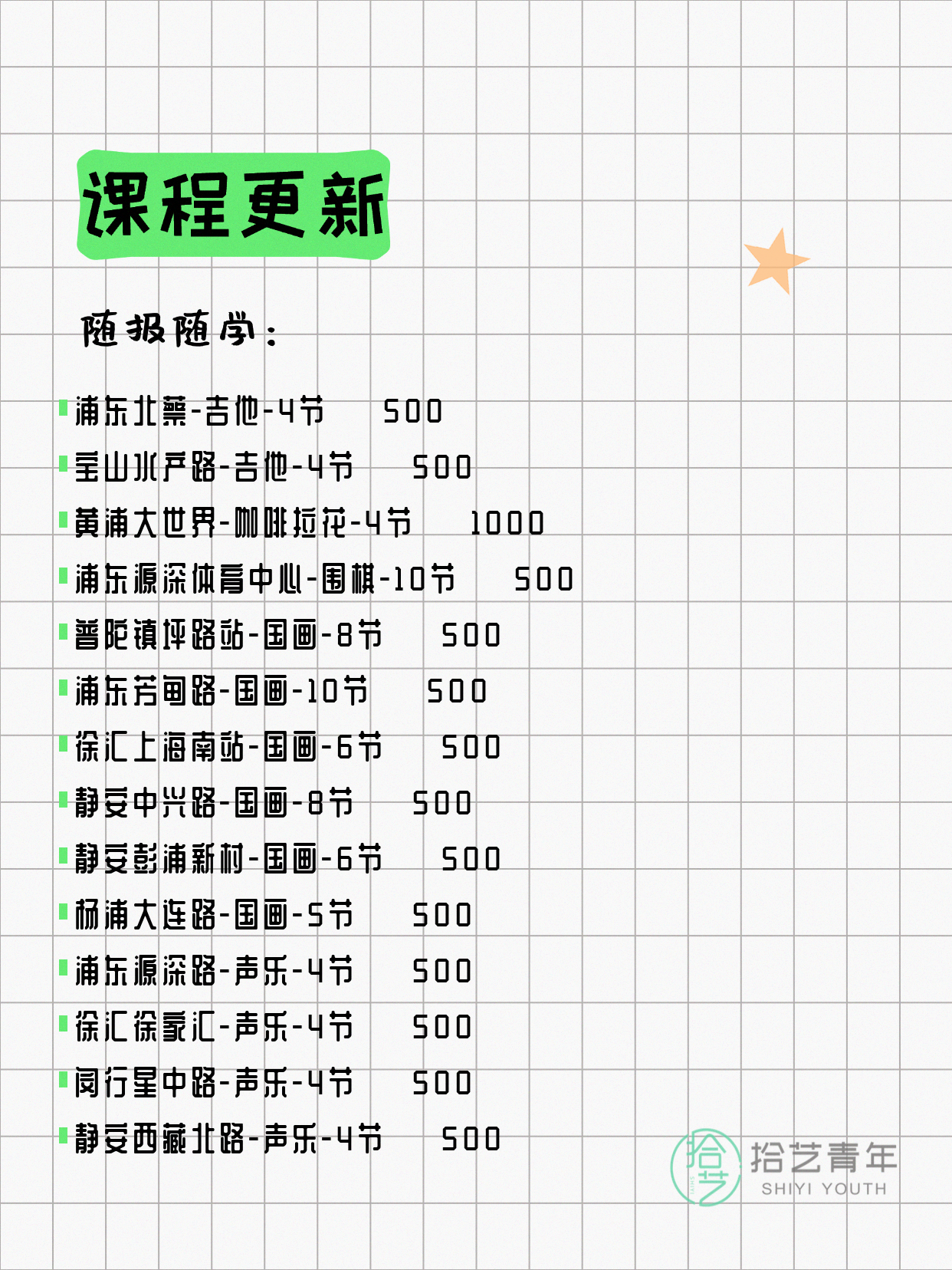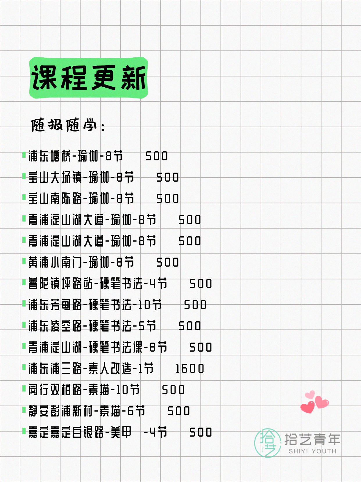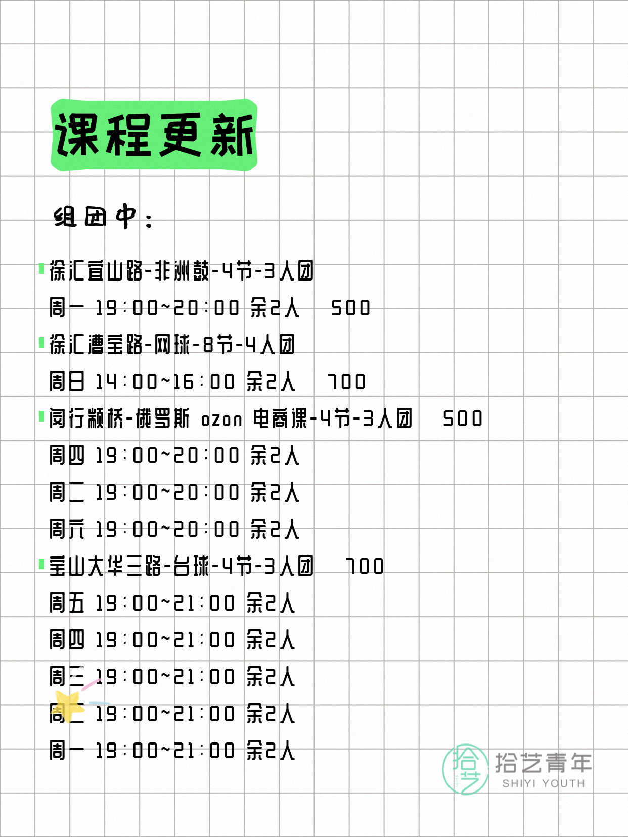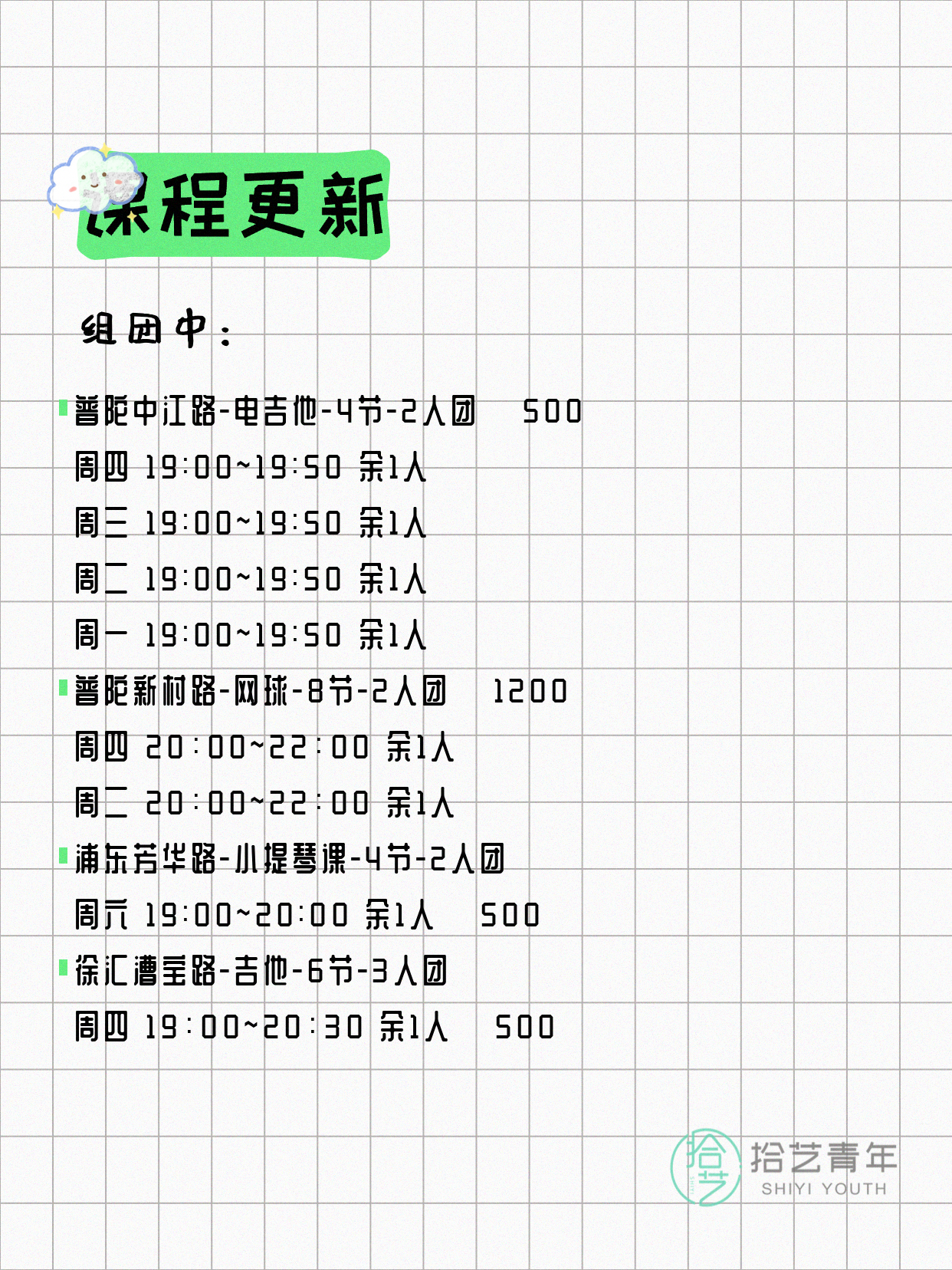 资讯>综合>正文4月15日上海夜校课程合集拾艺青年2026-04-151 / 17📊 本期课程概况• 总课程数:447门• 组团中课程:75门• 覆盖区域:15个区详见图片,欢迎报名咨询。💡 提示:以上课程信息来自拾艺青年小程序,课程可能随报名动态变化,具体以小程序实时信息为准。👉 微信小程序链接:#小程序://拾艺青年/WmfwH22mnQUxZwb
