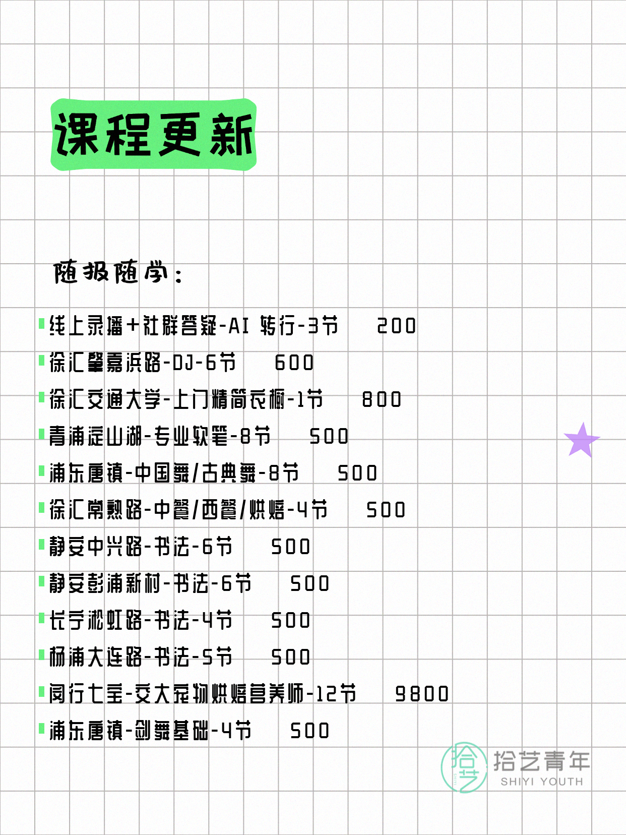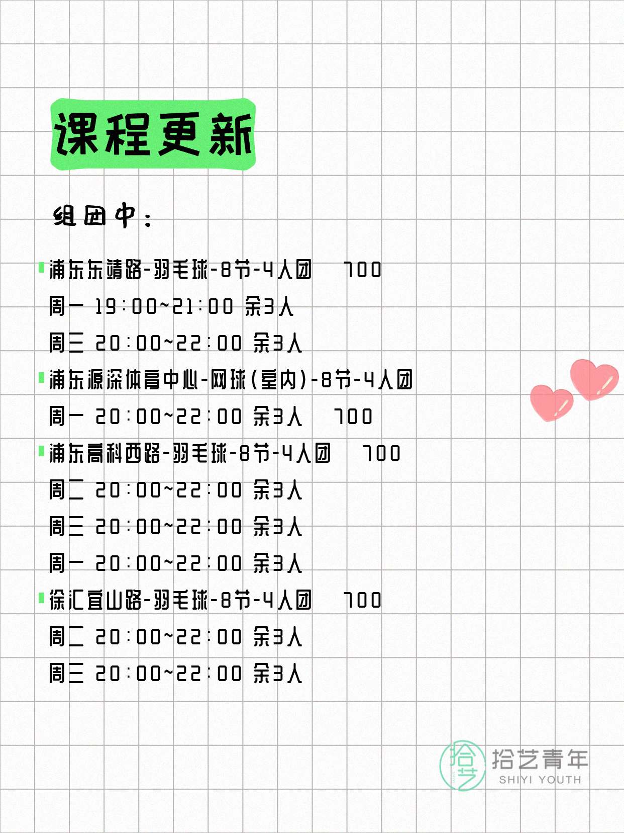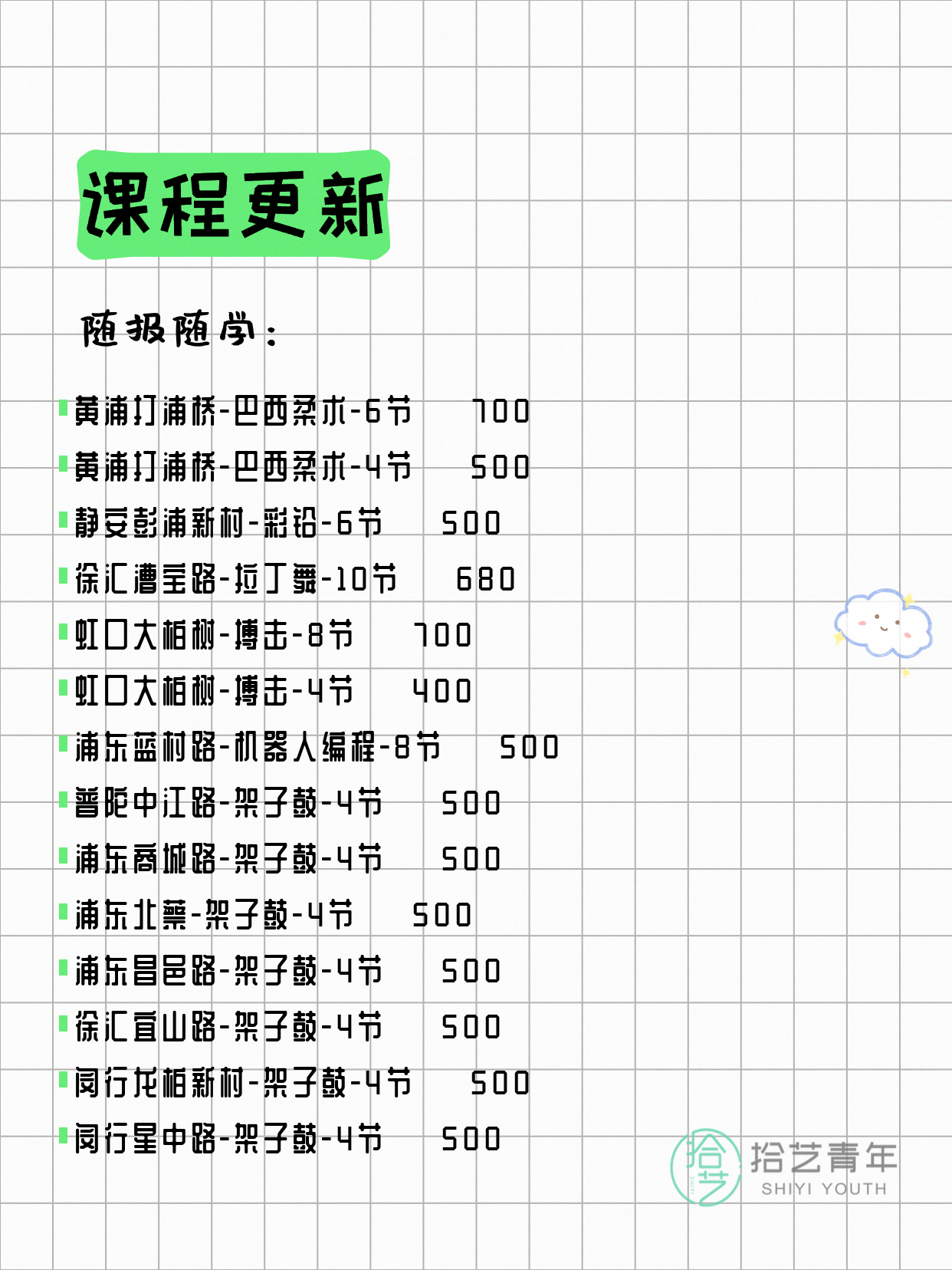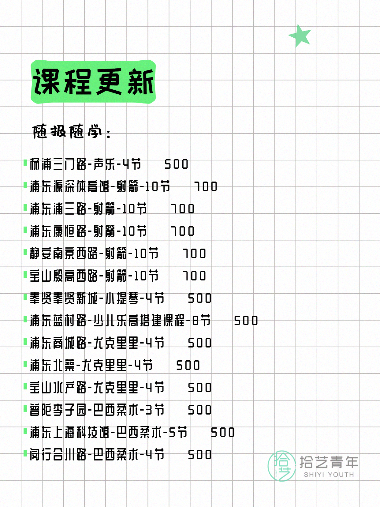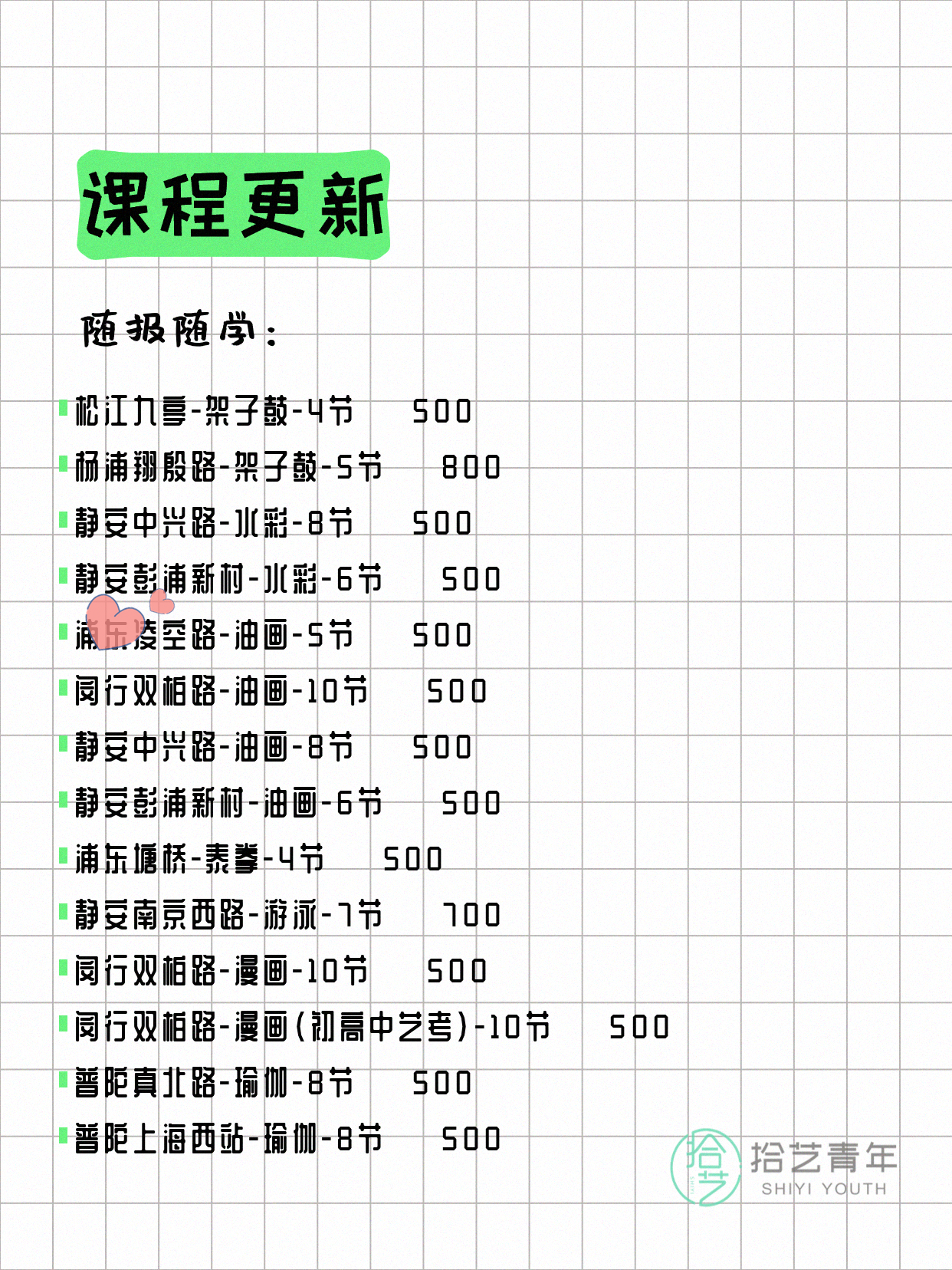 资讯>综合>正文4月15日上海夜校课程合集拾艺青年2026-04-151 / 17📊 本期课程概况• 总课程数:447门• 组团中课程:75门• 覆盖区域:15个区详见图片,欢迎报名咨询。💡 提示:以上课程信息来自拾艺青年小程序,课程可能随报名动态变化,具体以小程序实时信息为准。👉 微信小程序链接:#小程序://拾艺青年/WmfwH22mnQUxZwb
