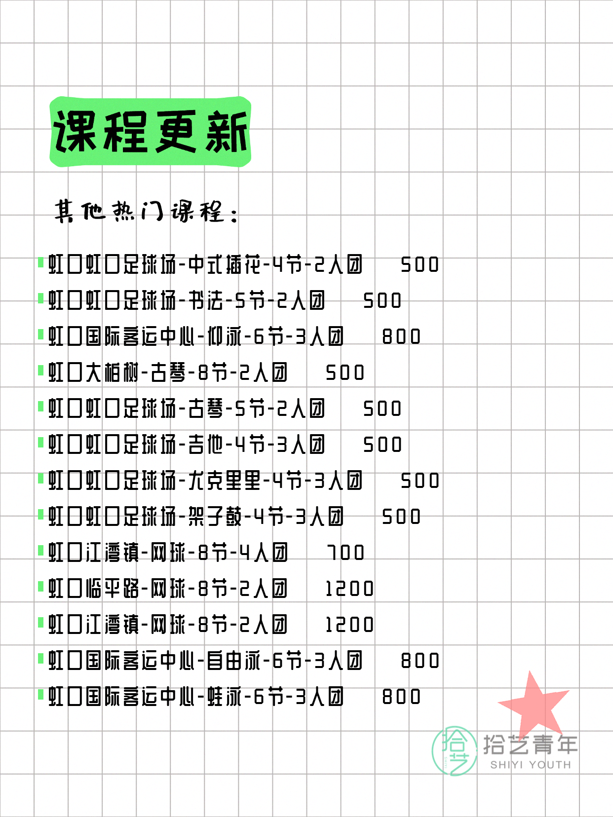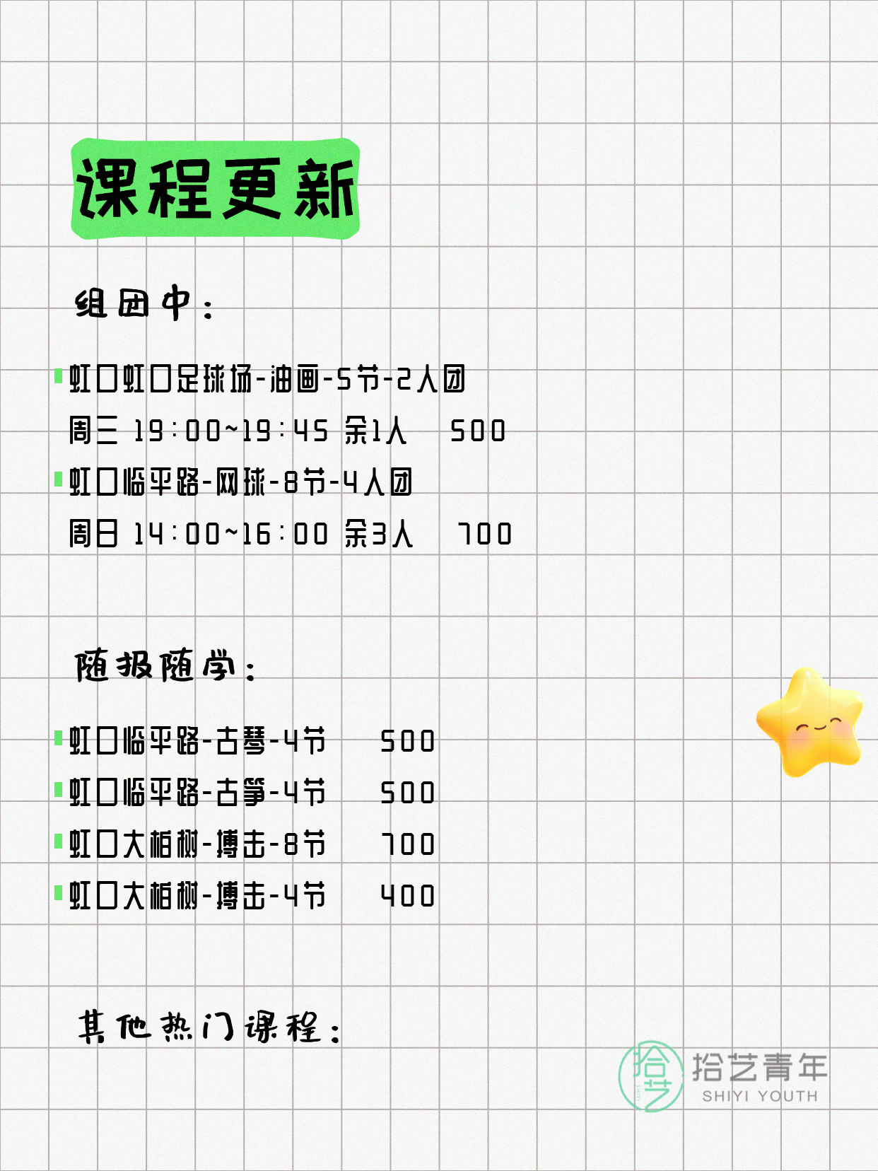 💡 提示:以上课程信息来自拾艺青年小程序,课程可能随报名动态变化,具体以小程序实时信息为准。
