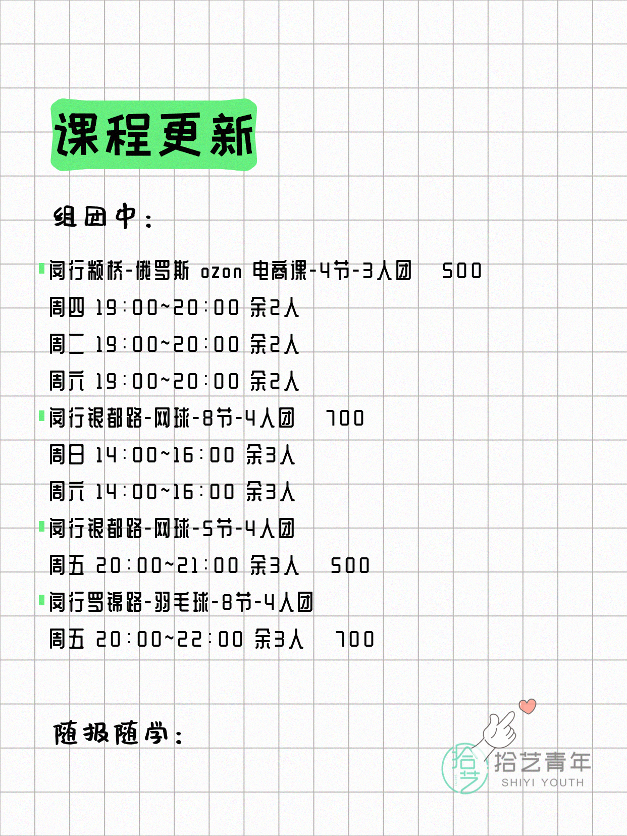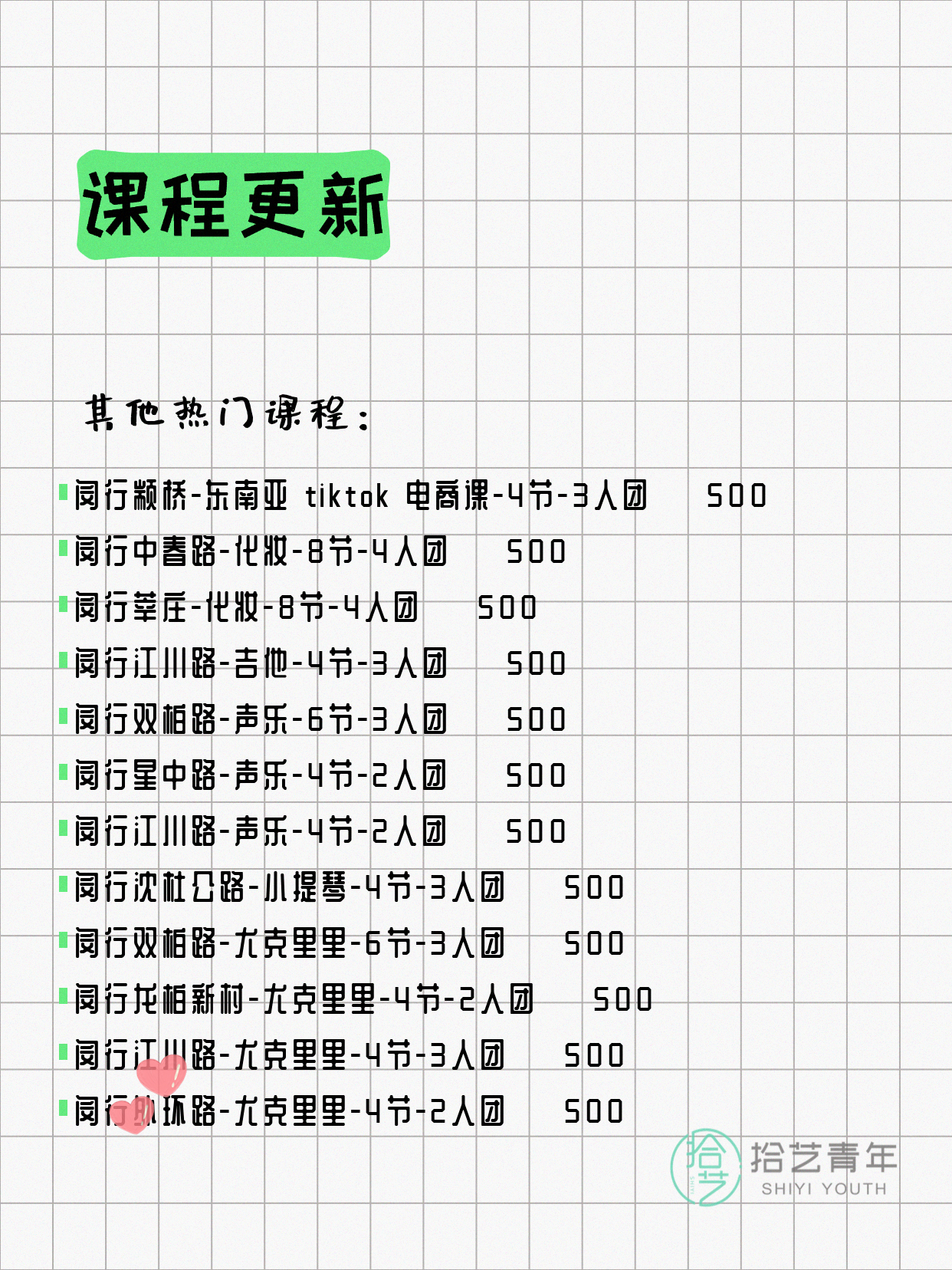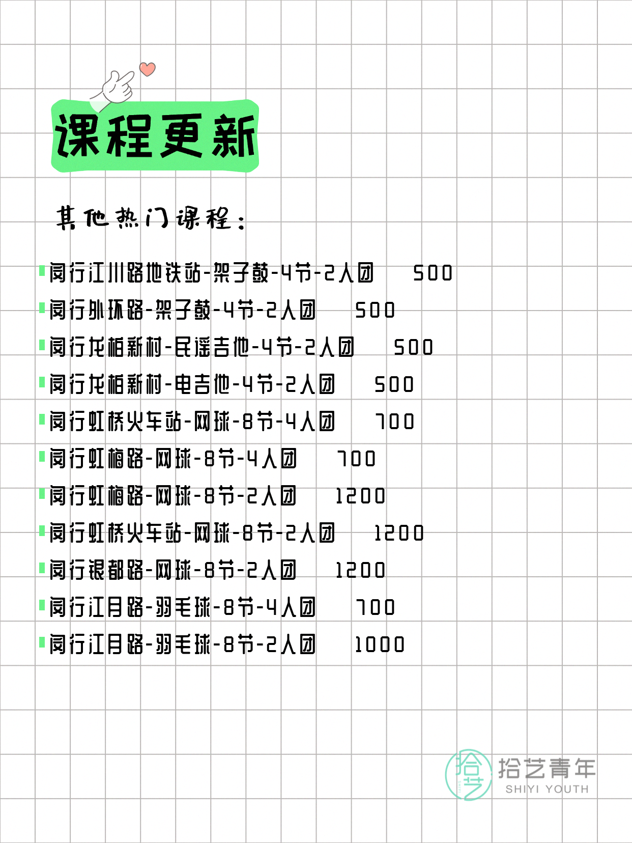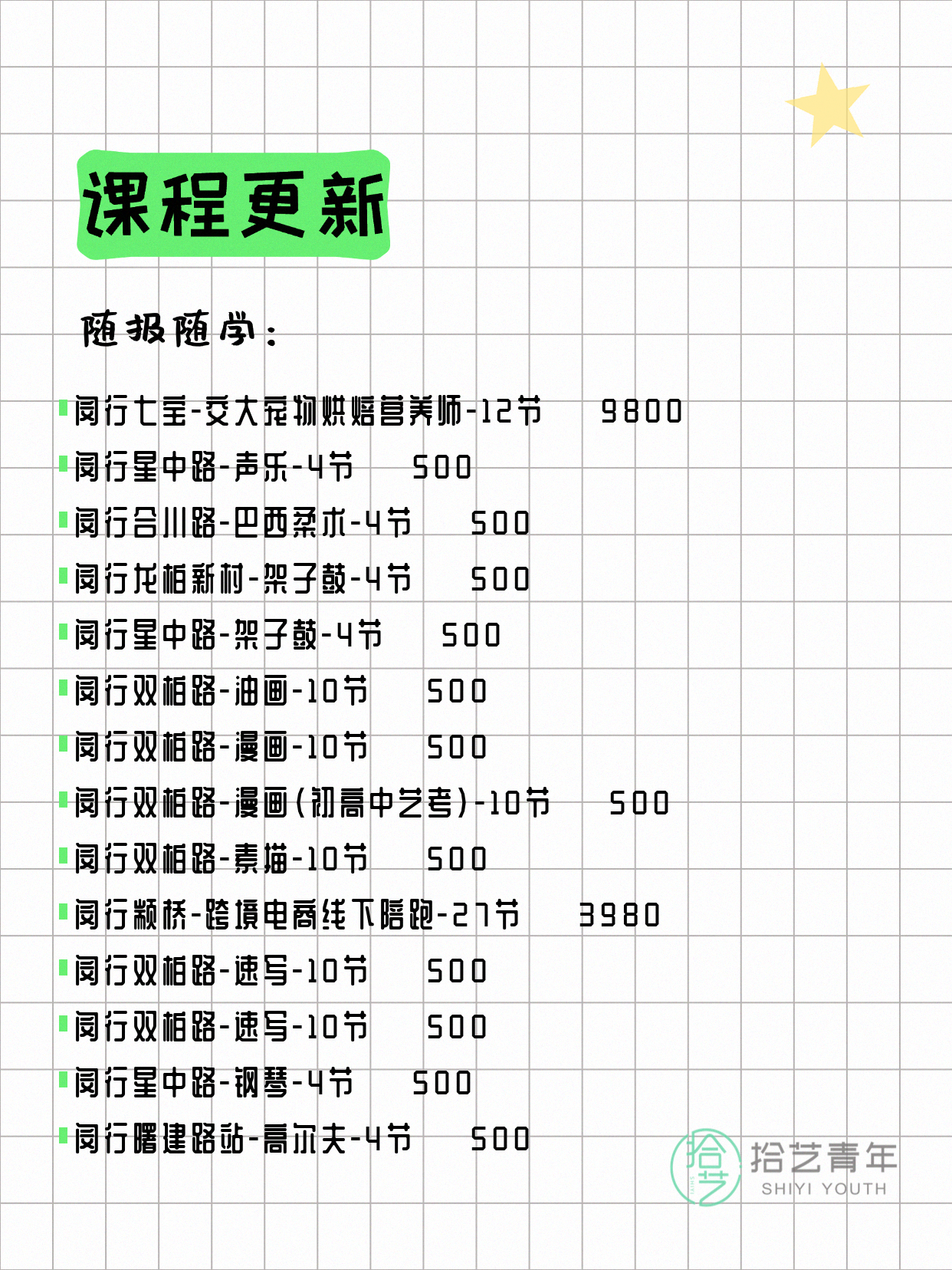 💡 提示:以上课程信息来自拾艺青年小程序,课程可能随报名动态变化,具体以小程序实时信息为准。