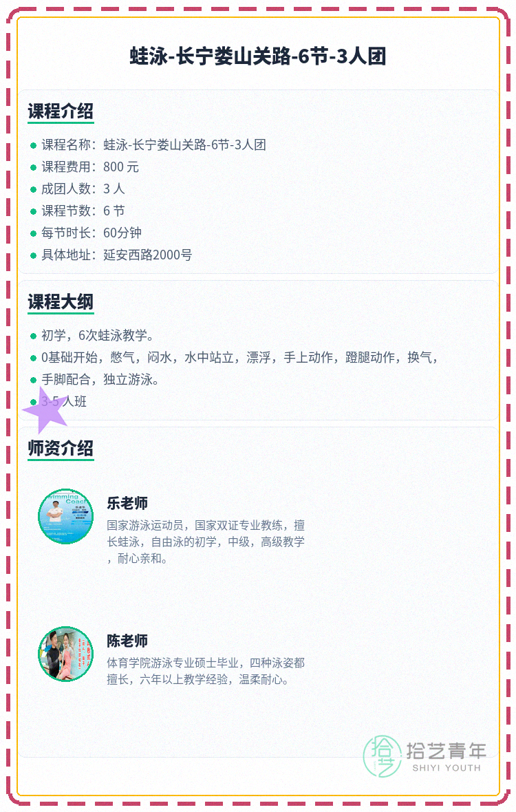 资讯>综合>正文娄山关路蛙泳课差1人就开课啦拾艺青年2026-04-161 / 2娄山关路的蛙泳搭子速来!差你一个就能成团开课🏊🏫 上课地点:延安西路2000号📅 课程安排:共6节 | 周一 19:00-20:00📖 课程大纲:初学,6次蛙泳教学。0基础开始,憋气,闷水,水中站立,漂浮,手上动作,蹬腿动作,换气,手脚配合,独立游泳。3-5 人班👥 3人团 | 已报2人 | 还差1人开课#上海夜校 #长宁夜校 #蛙泳课程 #夜校拼团 #上海线下课相关标签#上海夜校#长宁夜校#蛙泳课程#夜校拼团#上海线下课