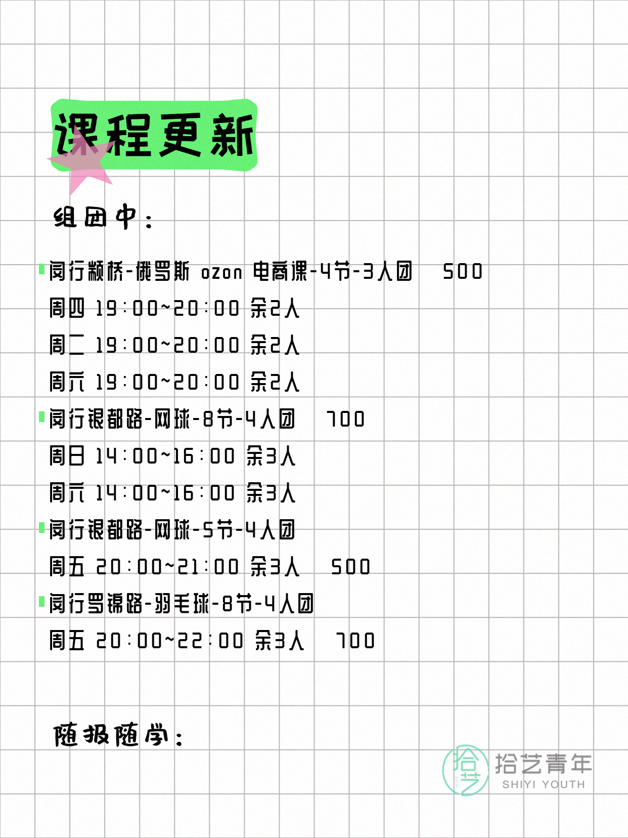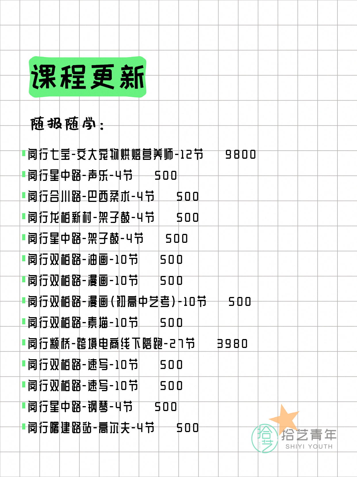 💡 提示:以上课程信息来自拾艺青年小程序,课程可能随报名动态变化,具体以小程序实时信息为准。