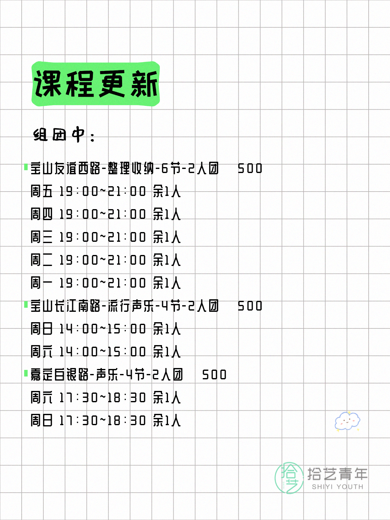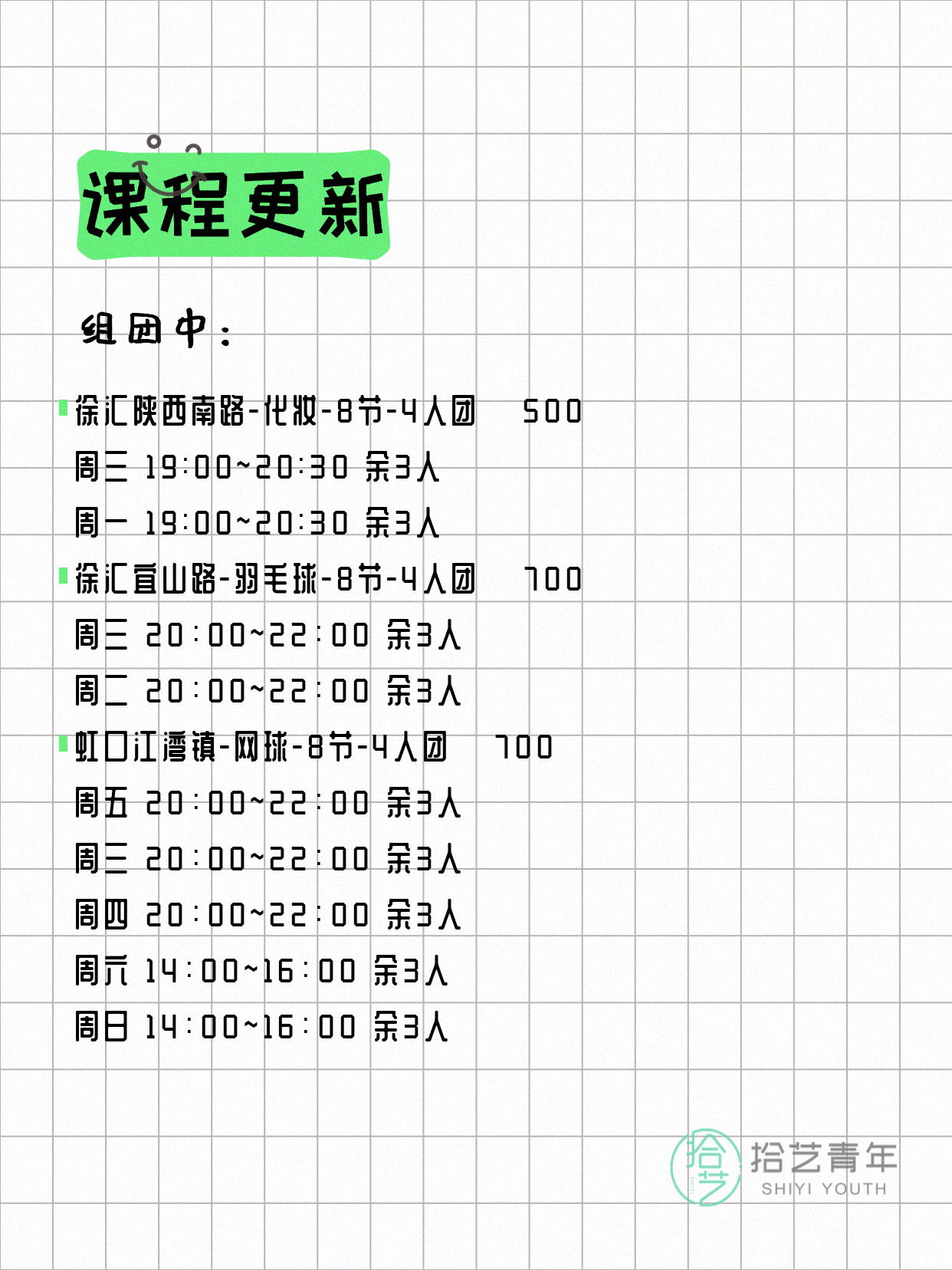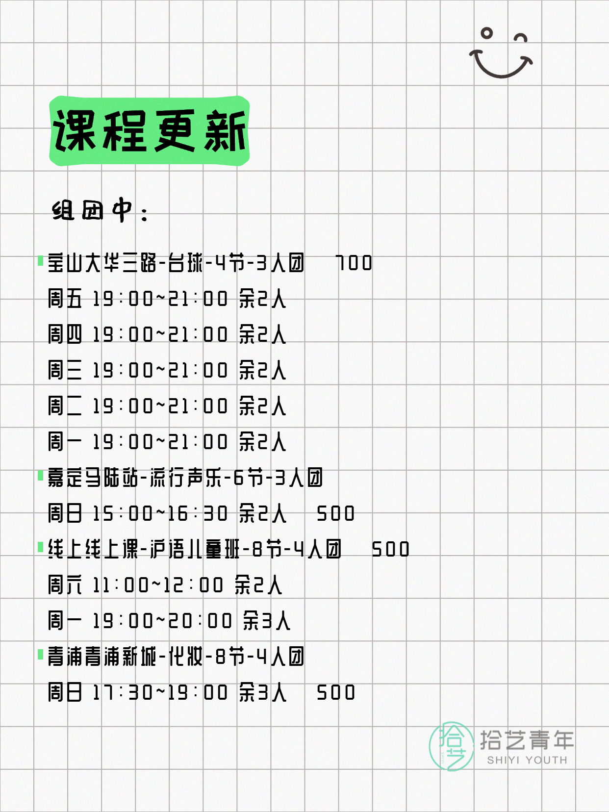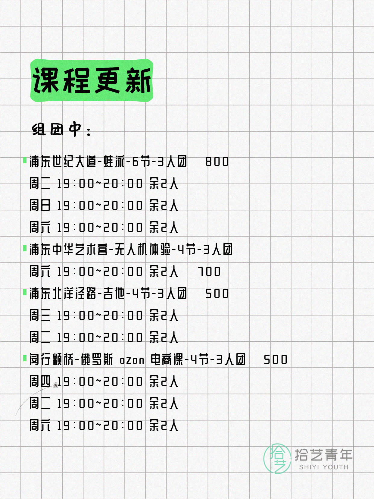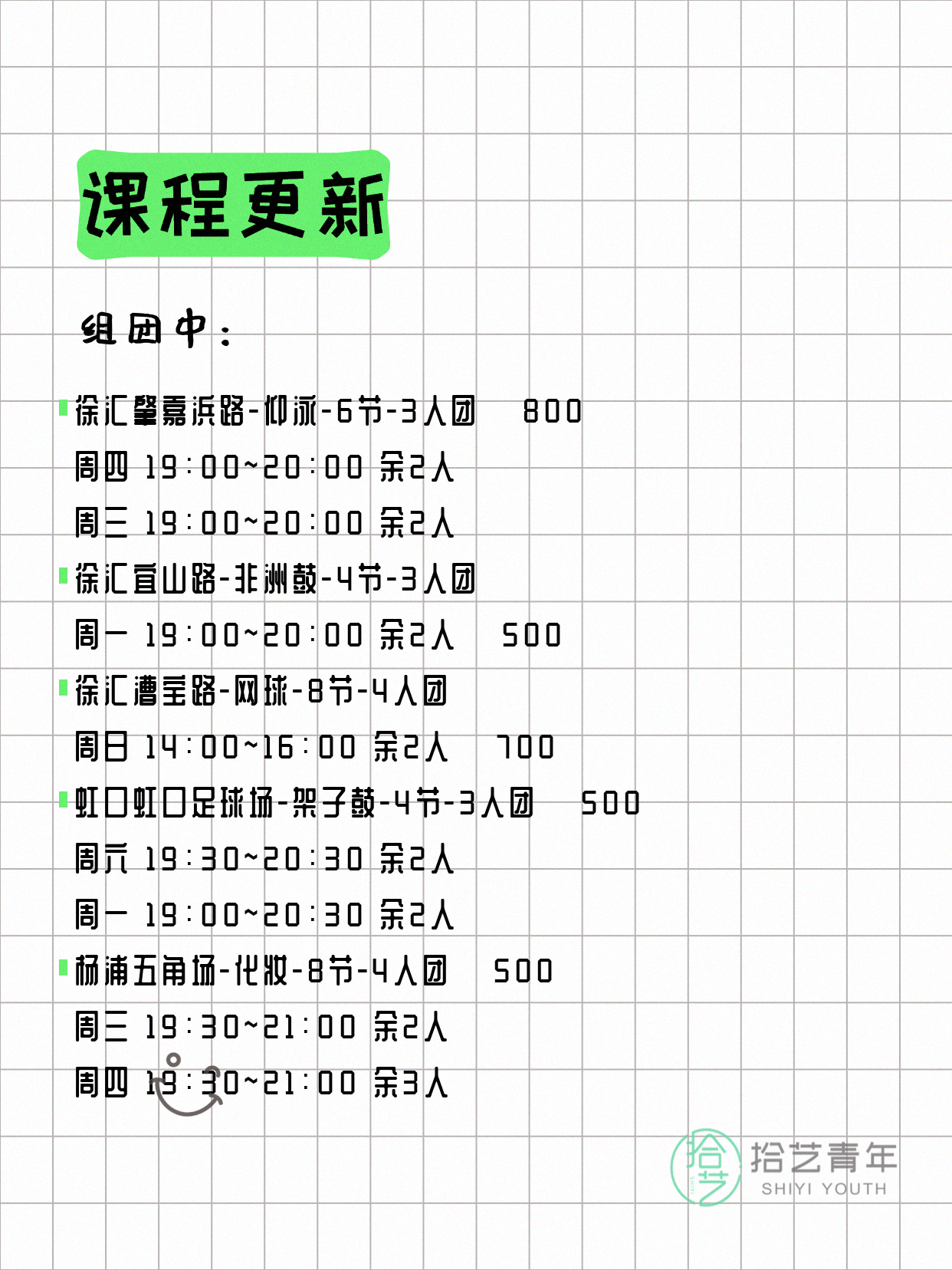 资讯>综合>正文4月17日上海夜校课程合集拾艺青年2026-04-171 / 17📊 本期课程概况• 总课程数:453门• 组团中课程:92门• 覆盖区域:15个区详见图片,欢迎报名咨询。💡 提示:以上课程信息来自拾艺青年小程序,课程可能随报名动态变化,具体以小程序实时信息为准。👉 微信小程序链接:#小程序://拾艺青年/WmfwH22mnQUxZwb